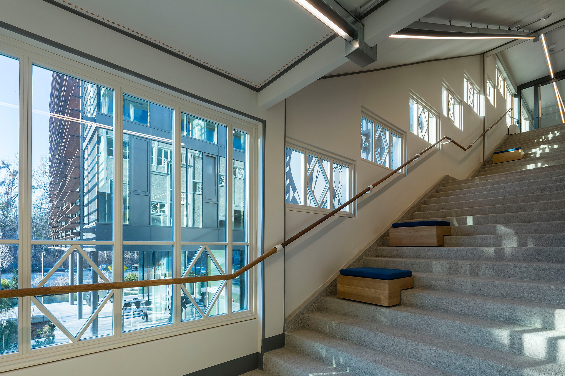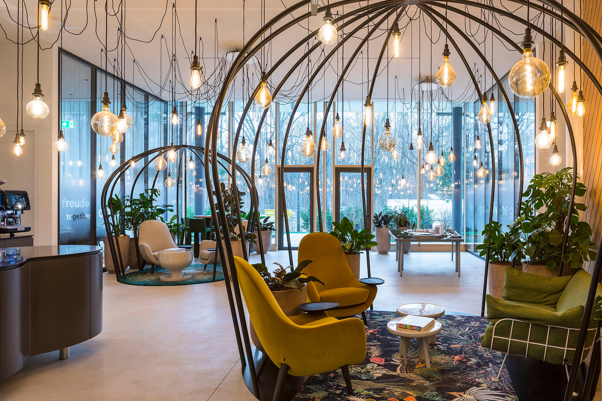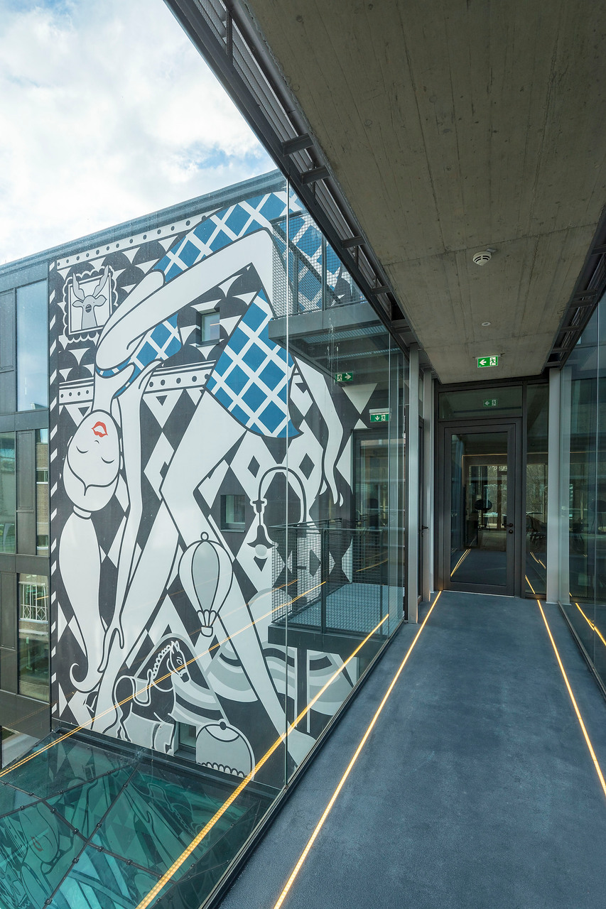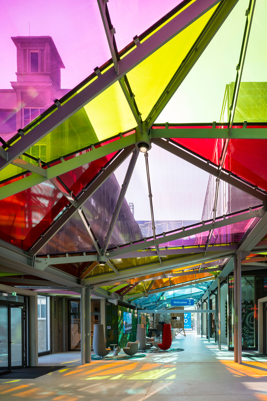value one hat hier sein neues Headquarter eingerichtet und profitiert u.a. von dem zwischen den Gebäuden aufgespannten Atrium mit seiner teilweise farbigen Glasüberdachung.