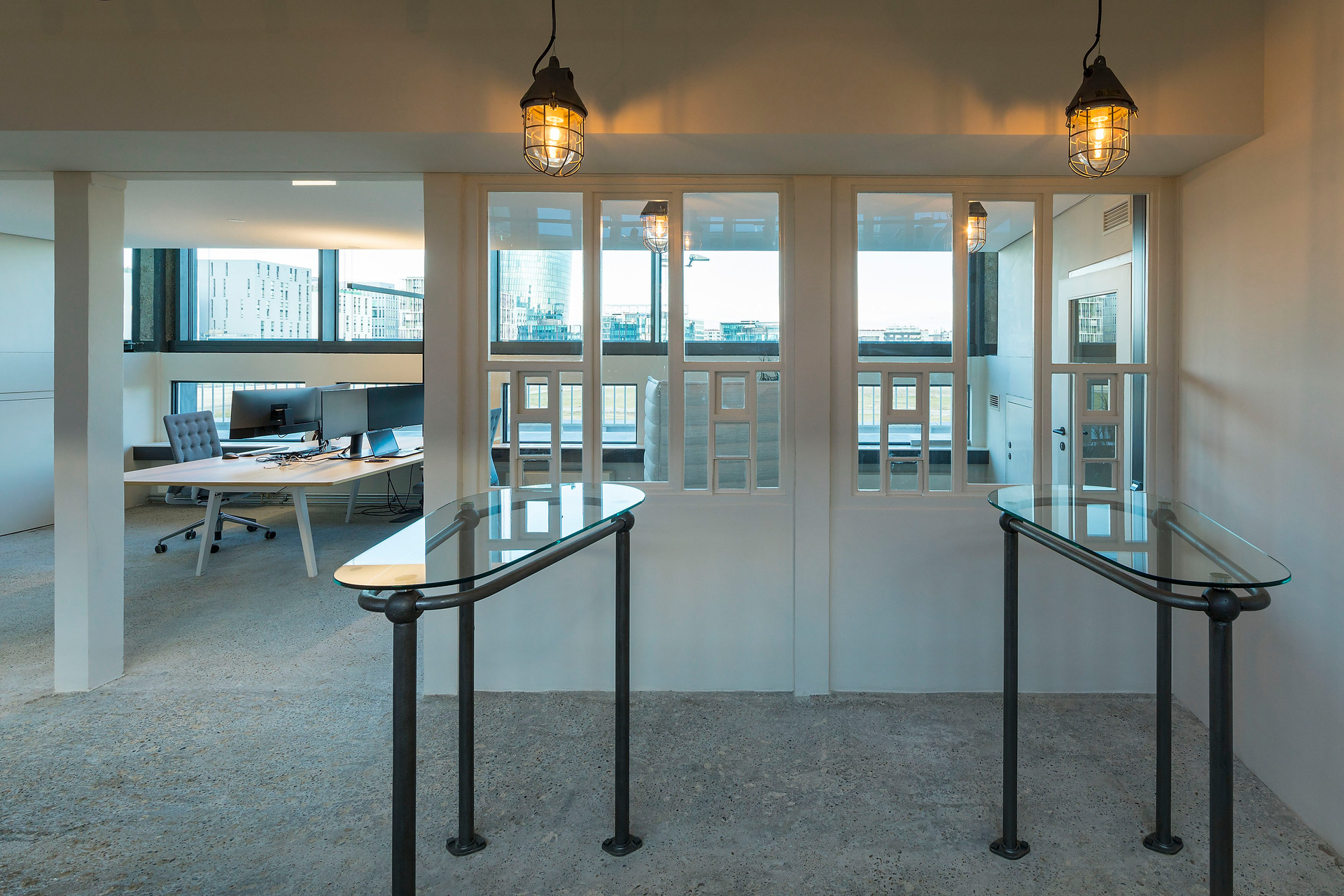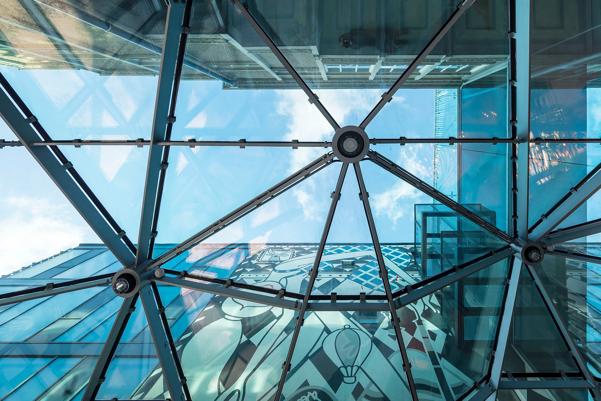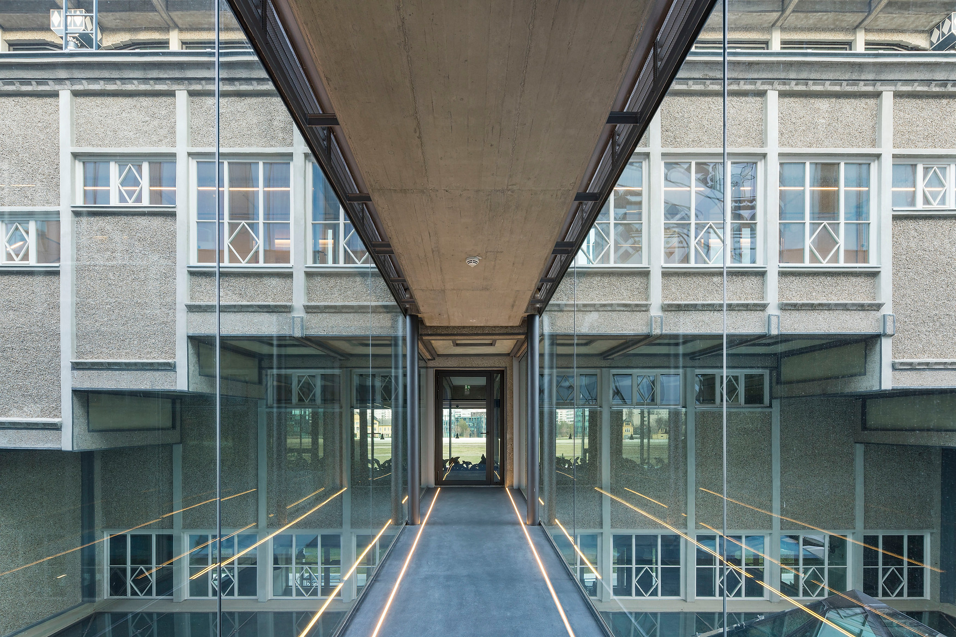 value one hat hier sein neues Headquarter eingerichtet und profitiert u.a. von dem zwischen den Gebäuden aufgespannten Atrium mit seiner teilweise farbigen Glasüberdachung.