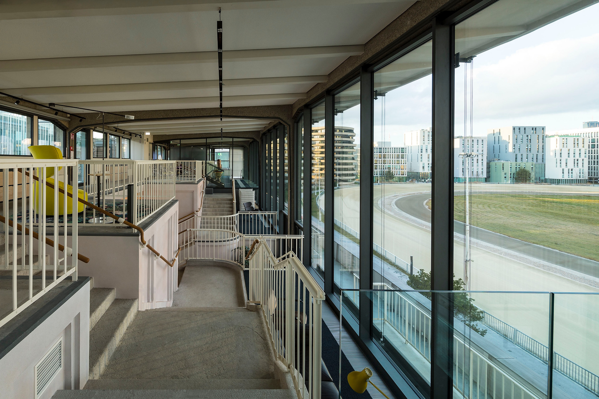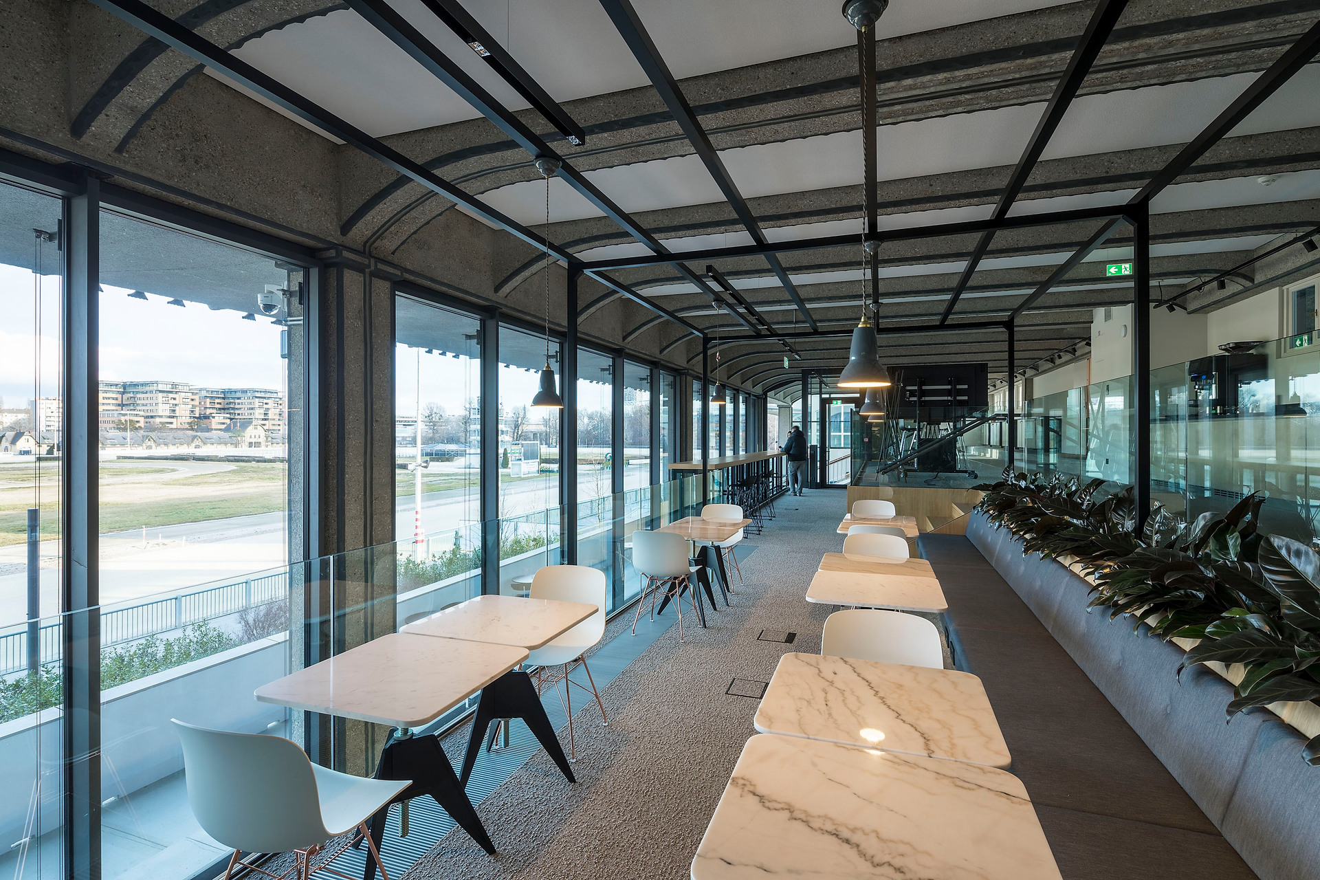 Ein Ziel war, die filigrane Struktur des ersten Eisenbetonbaus Österreichs mit seiner spielerischen feinen Ornamentik und Plastizität maximal zur Geltung zu bringen. Die Verglasungen der Tribünenräume sind zurückgesetzt, um die Dachauskragung von außen spürbar zu belassen. Für die Stufenanlagen wurde ein Raumplan mit Podesten entwickelt, der gut nutzbare Arbeitssituationen schafft und trotzdem den Geist des Ehemaligen atmet.