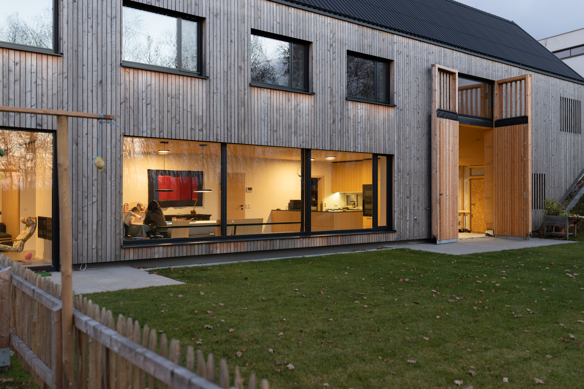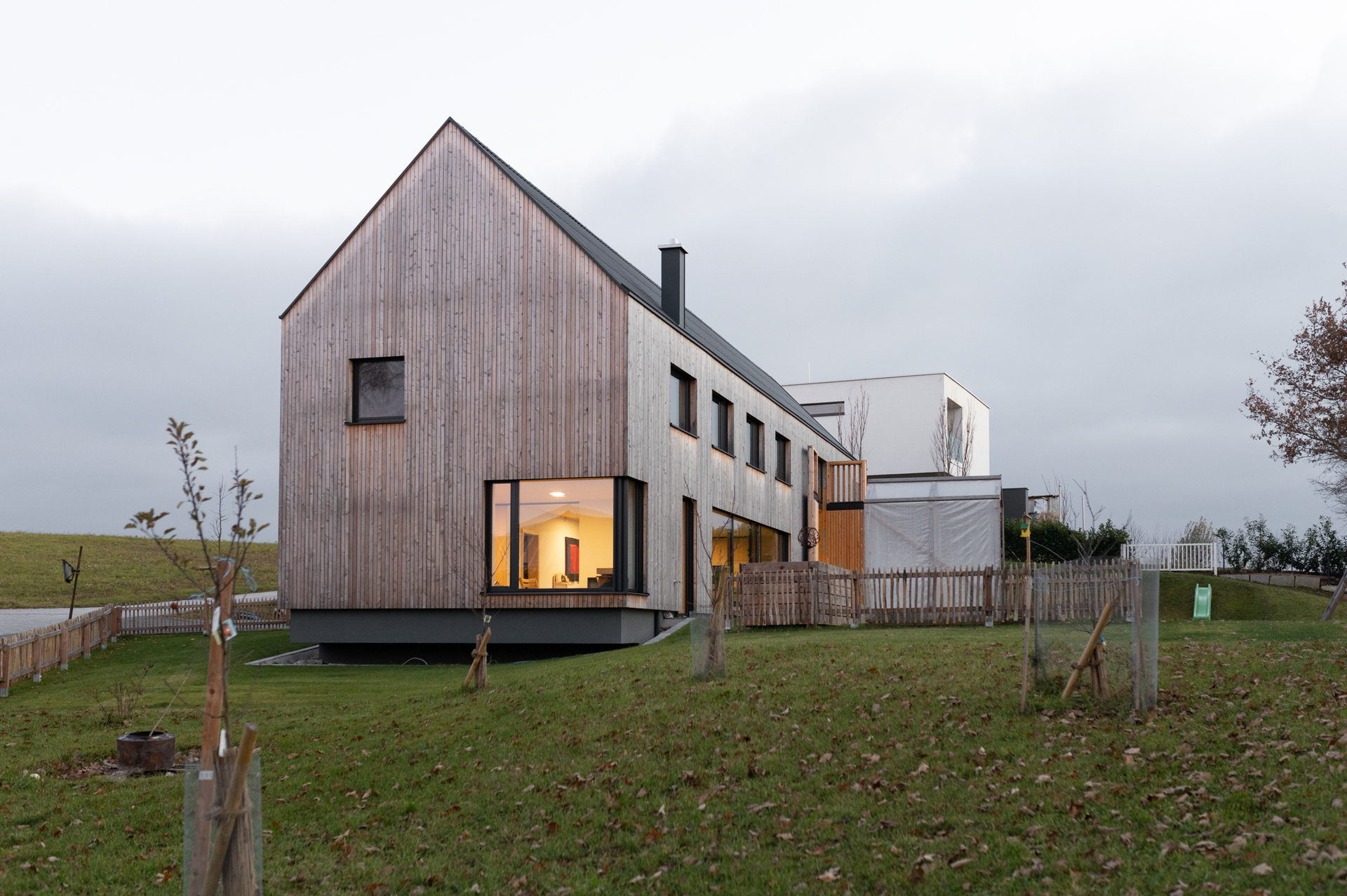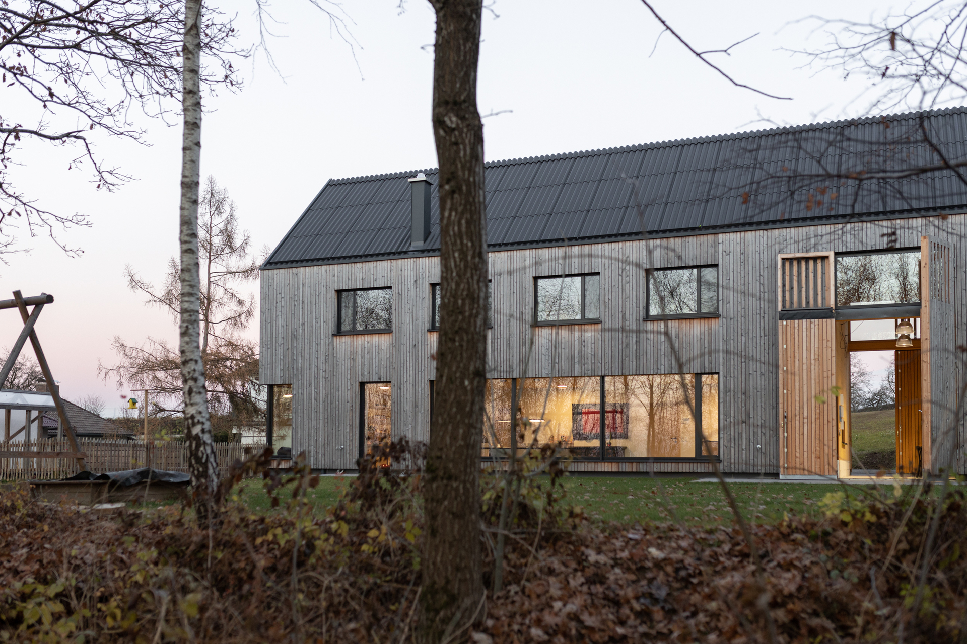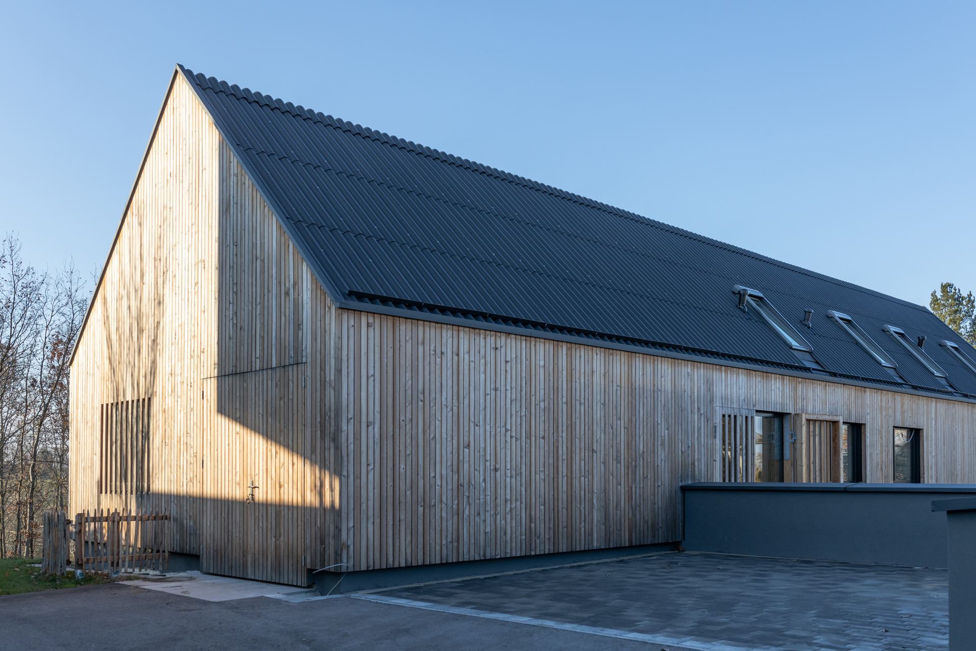 Das Obergeschoss ist im Gegensatz zum großzügigen Erdgeschoss kleinteiliger gegliedert. Die privaten Rückzugsräume überraschen jedoch mit kleinen Galerien im ausgebauten Dachraum, die sowohl von den Kindern als auch Gästen gern genutzt werden. Eingehüllt ist das Gebäude von einer Lattenfassade aus heimischer Lärche, die sich sägerau und ohne Geschosstrennung rund um das Haus zieht. Die stehende Struktur setzt sich in der Dachdeckung aus Faserzement-Wellplatten fort – so ergibt sich der Eindruck eines Hauses „wie aus einem Guss“. (Text: Architekten, bearbeitet)