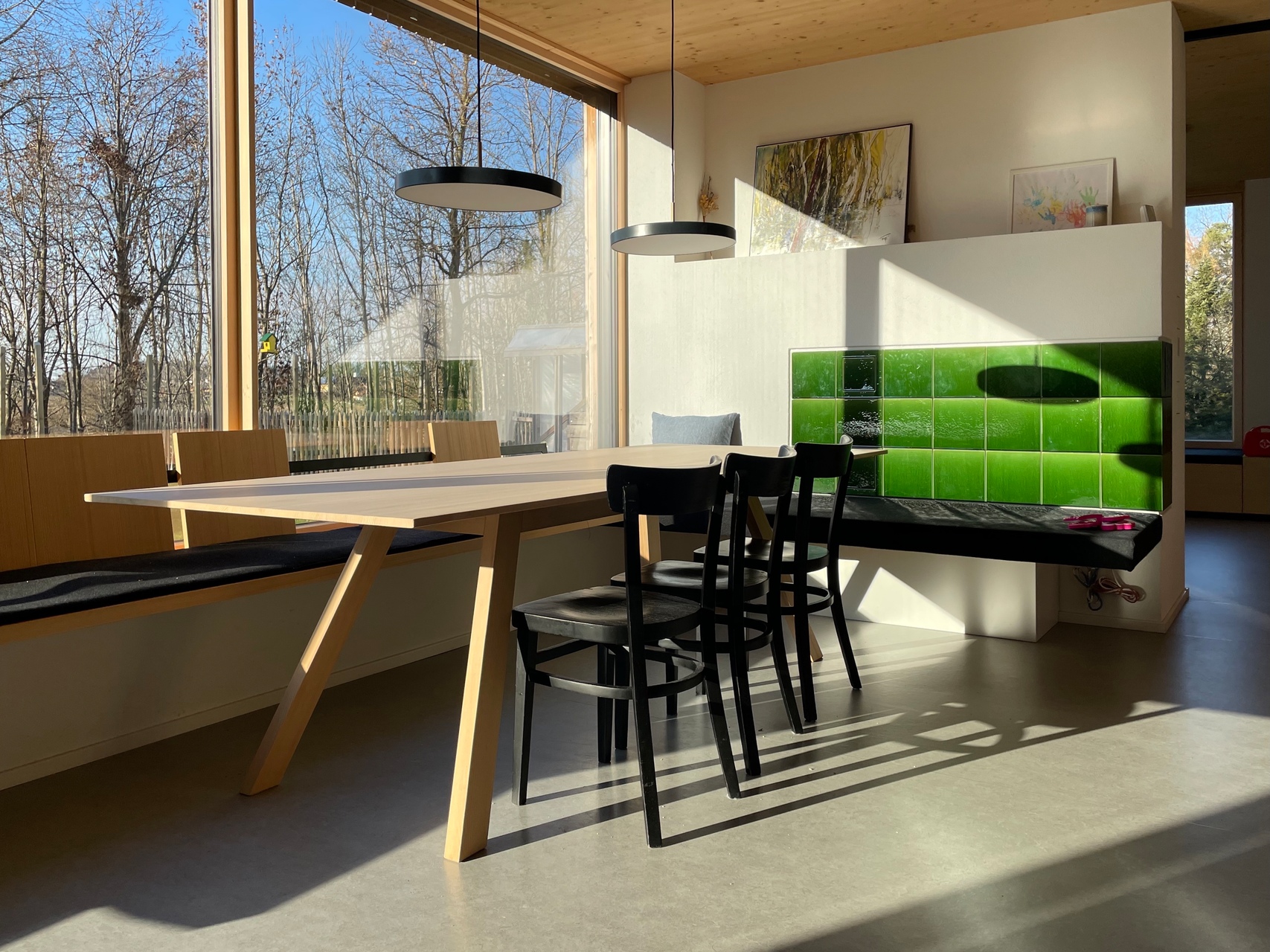 Der Haupteingang auf der Ostseite des Hauses definiert mit Windfang und Garage einen Vorplatz. Direkt dahinter befindet sich der Familienbereich für Essen, Kochen und Wohnen. Ein großes Fenster mit Eckbank rahmt den Blick in die Natur. Ein klassischer Kachelofen in Grün trennt den Essbereich vom Wohnraum.