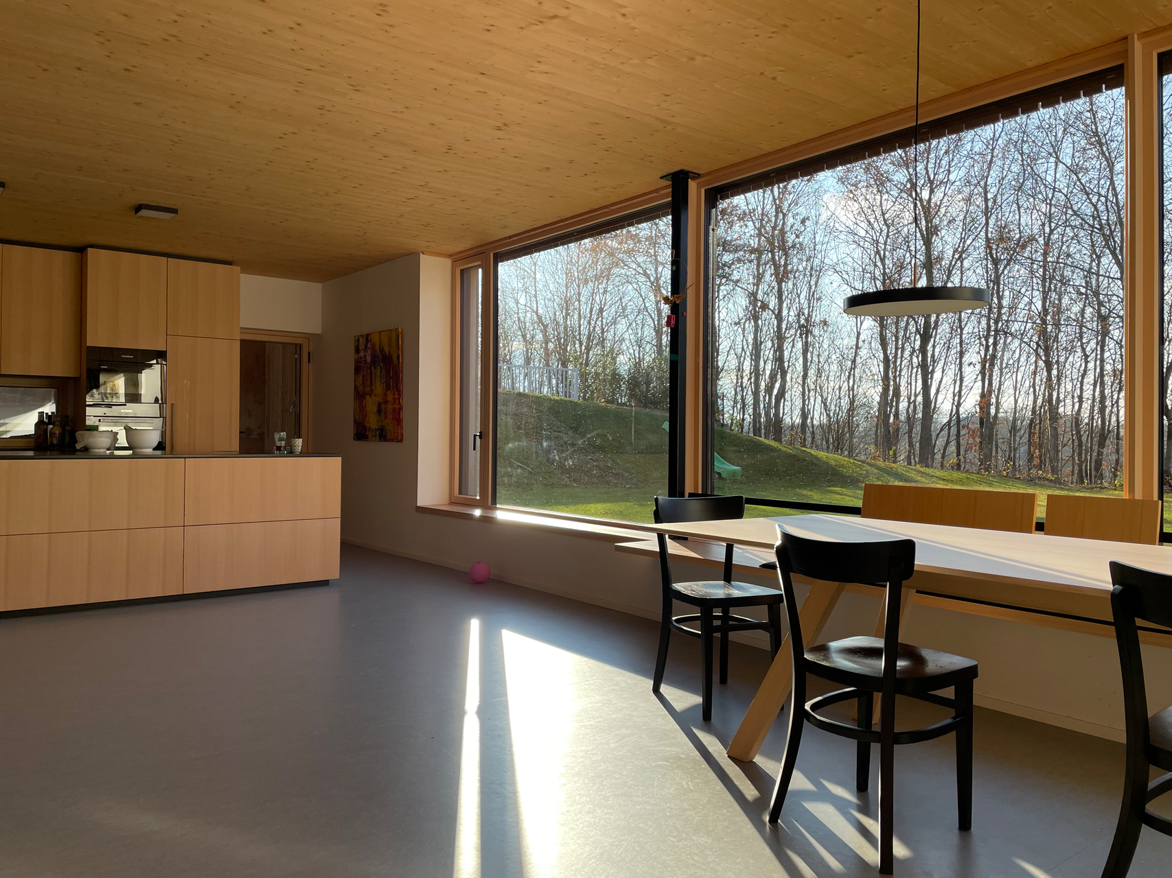 Die Vorliebe der Bauherrschaft für Holz ist offensichtlich: Heimische Weißtanne ist wesentliches Element der Einrichtung. Decke, Fenster und Türen sind in Fichte und Tanne ausgeführt. Am Boden wurde ökologisch verträgliches Linoleum verlegt, das in den betonierten Terrassenflächen eine optisch entsprechende Fortsetzung findet.