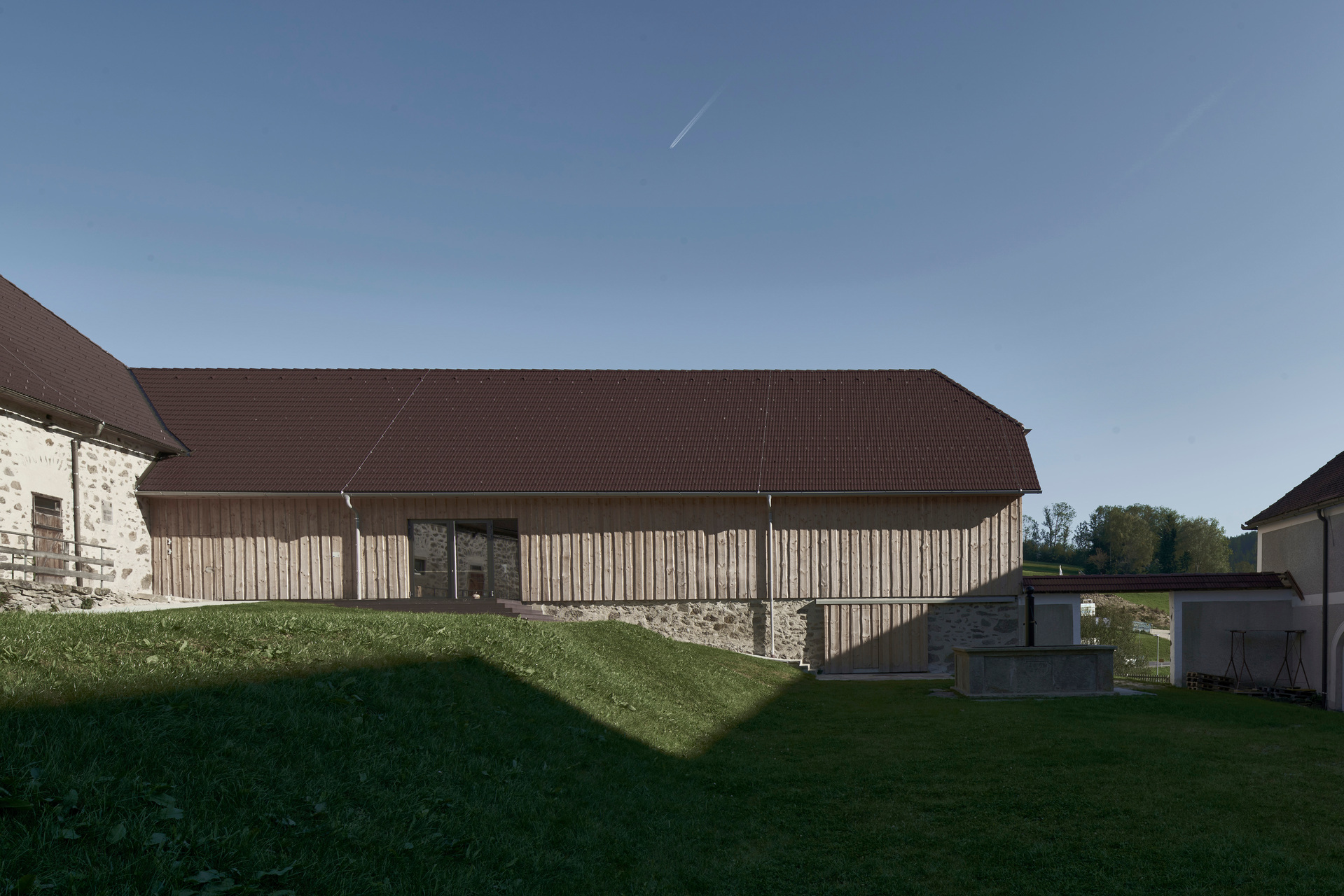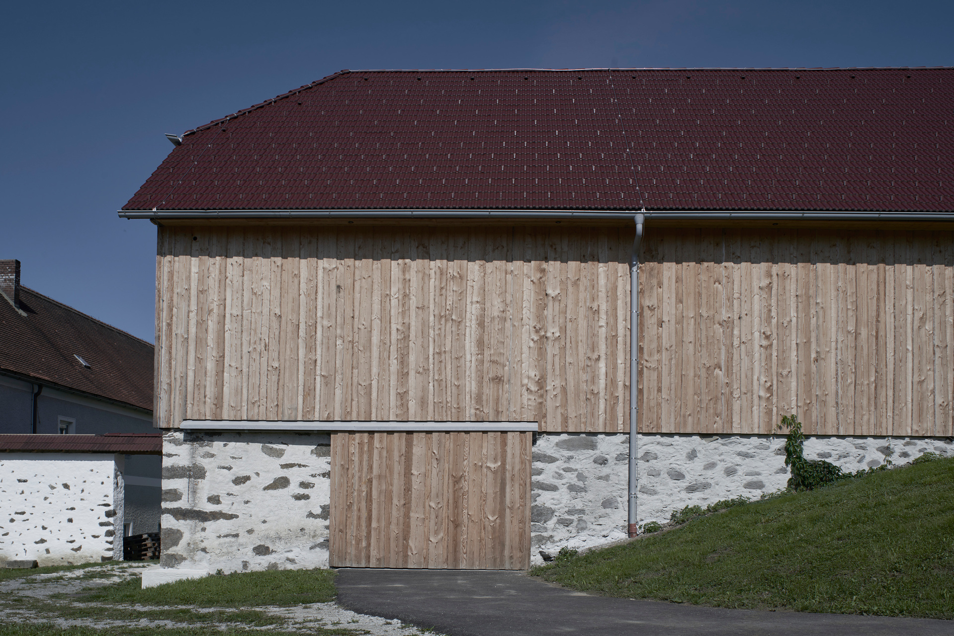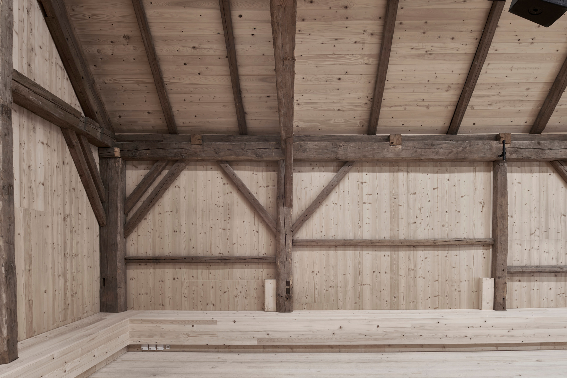 Zwei großformatige Portale markieren den Ein- bzw. Durchgang auf den beiden Längsseiten. Holzbretter mit Baumkante, vertikal geschraubt, bilden die erneuerte Fassade, die sich von den angrenzenden Gebäuden in ihrer präzisen Einfachheit abhebt. Das nach Süden orientierte, in Stein gemauerte Untergeschoß wurde um Schiebetore ergänzt. Das Dach wurde mit passenden Ziegeln neu eingedeckt. Das innere Raumprogramm wurde aufs Notwendigste reduziert, um größtmögliche Freiheit für die Bespielung zu gewährleisten. Mobile Bühnenelemente, verschiedene Optionen zur Bestuhlung und ausgefeilte Technik bilden die geeignete, vielseitige Infrastruktur für die Aktivitäten im neuen „Kulturstadl“. (Text: Architekten, bearbeitet)