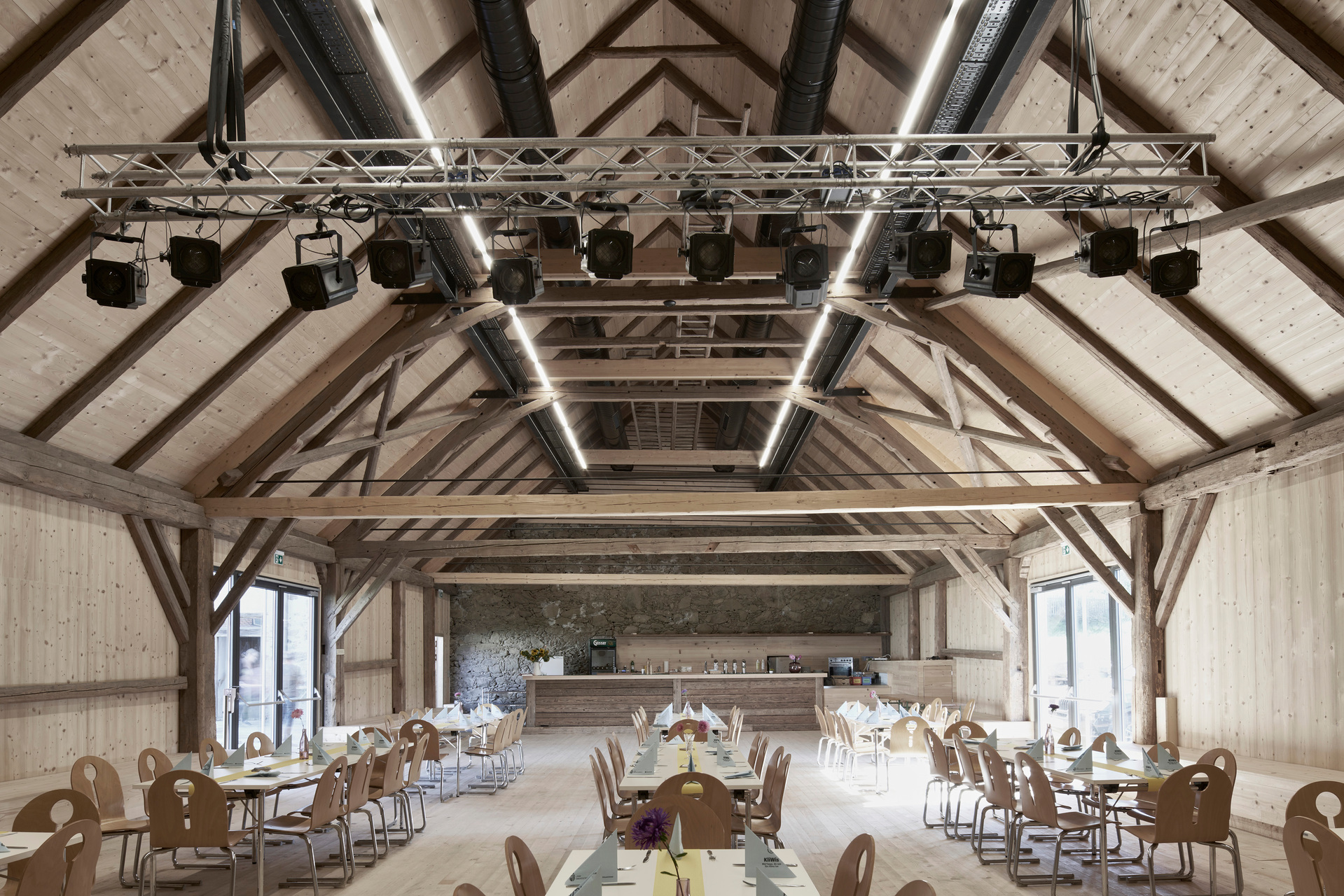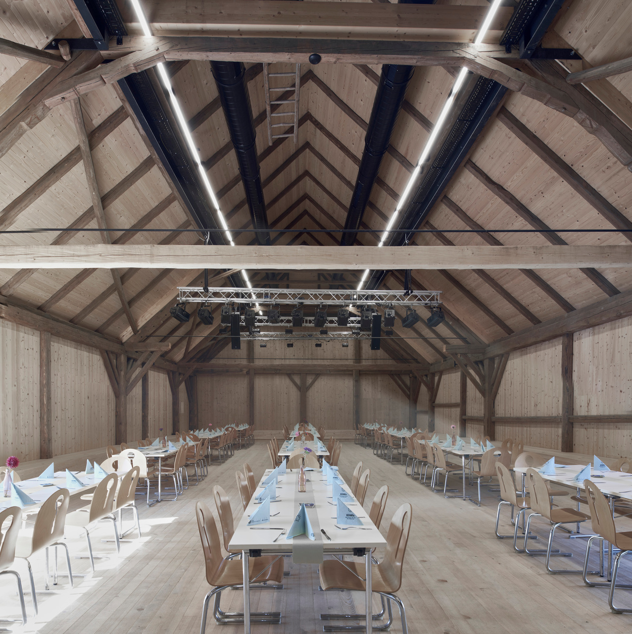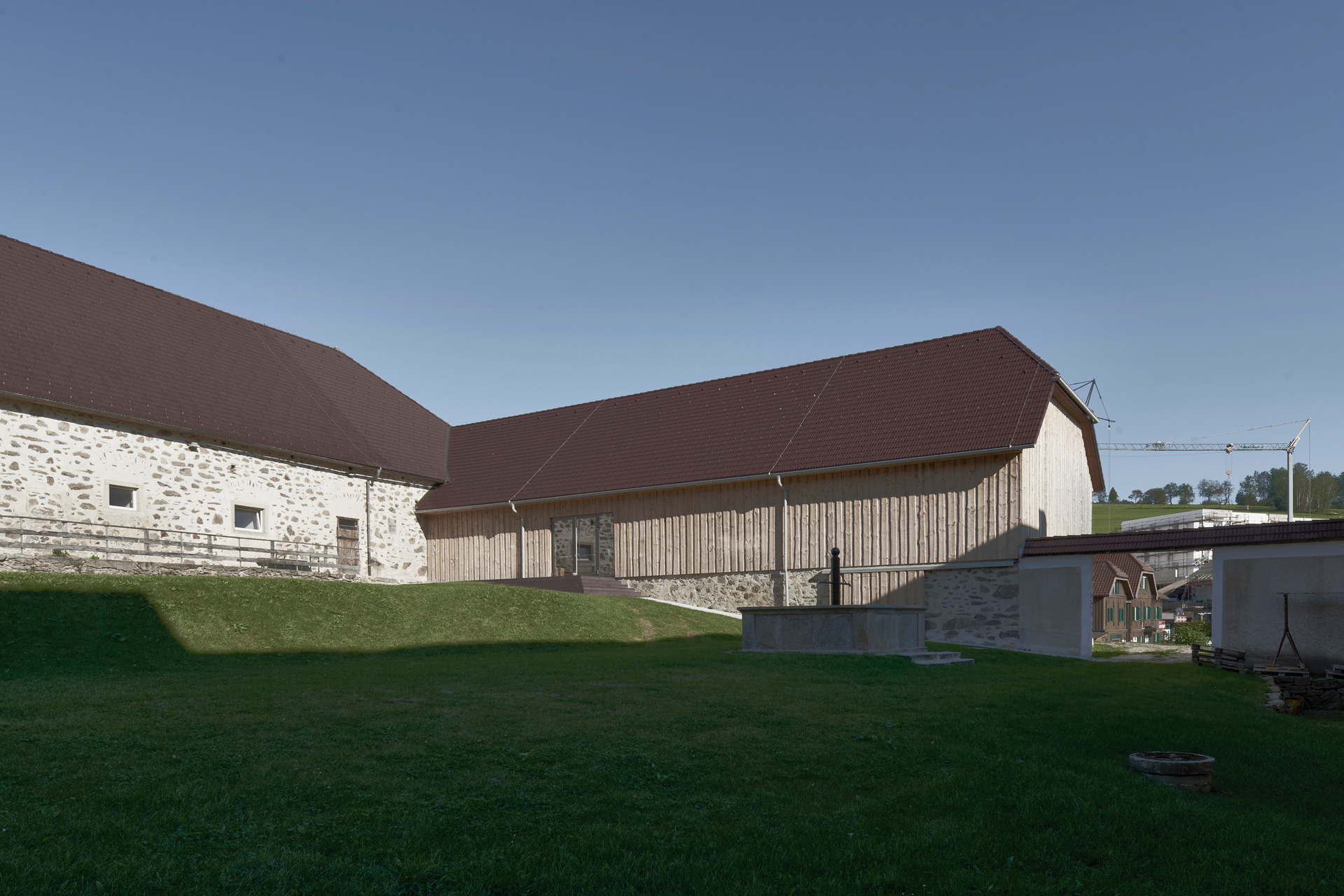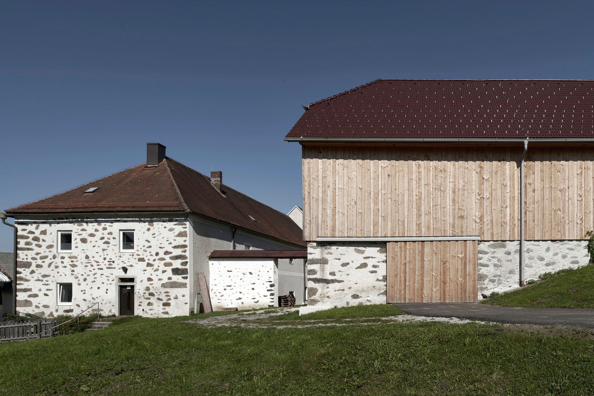 Zwei großformatige Portale markieren den Ein- bzw. Durchgang auf den beiden Längsseiten. Holzbretter mit Baumkante, vertikal geschraubt, bilden die erneuerte Fassade, die sich von den angrenzenden Gebäuden in ihrer präzisen Einfachheit abhebt. Das nach Süden orientierte, in Stein gemauerte Untergeschoß wurde um Schiebetore ergänzt. Das Dach wurde mit passenden Ziegeln neu eingedeckt. Das innere Raumprogramm wurde aufs Notwendigste reduziert, um größtmögliche Freiheit für die Bespielung zu gewährleisten. Mobile Bühnenelemente, verschiedene Optionen zur Bestuhlung und ausgefeilte Technik bilden die geeignete, vielseitige Infrastruktur für die Aktivitäten im neuen „Kulturstadl“. (Text: Architekten, bearbeitet)