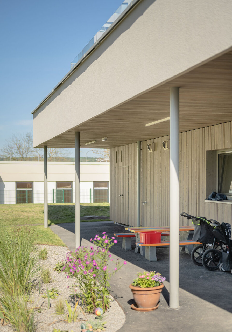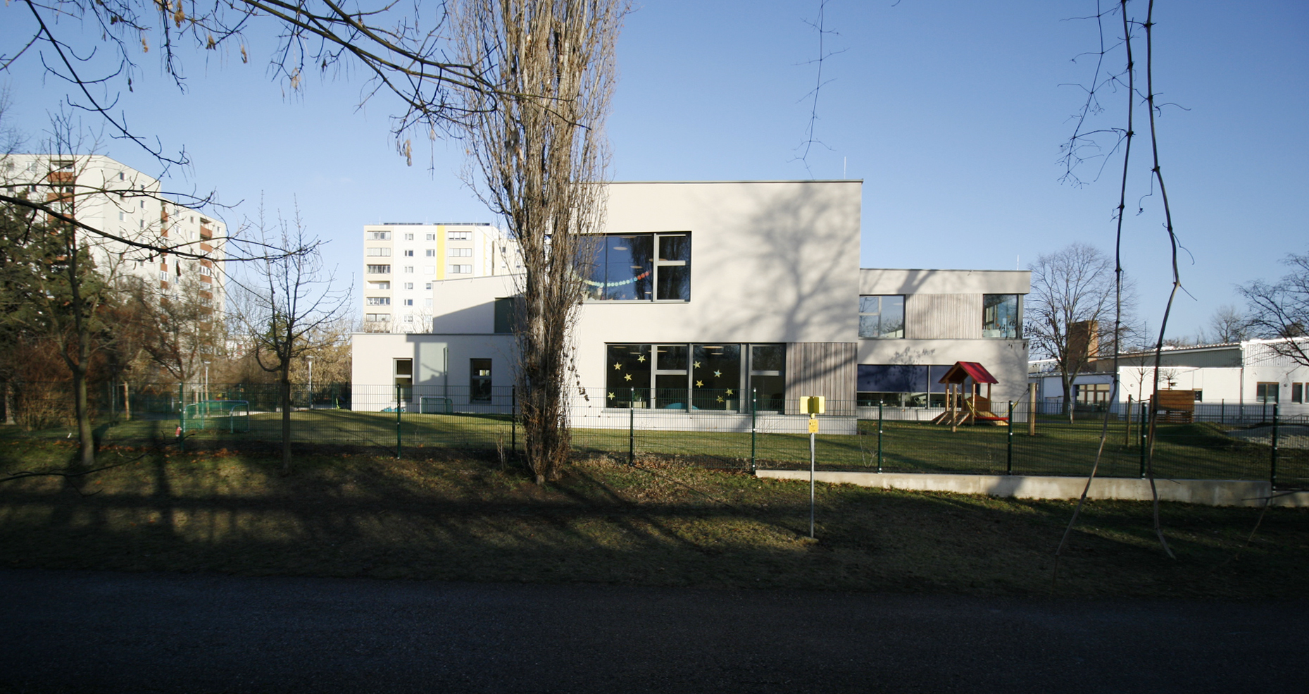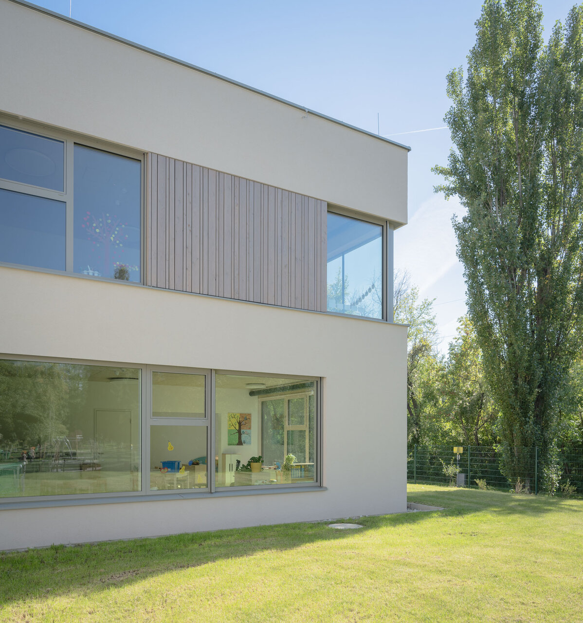 Die Fassade ist durch vertikale Holzleistenelemente gegliedert. Durch die Gebäudegeometrie entstehen natürlich beschattete oder sonnige Bereiche. Die hellen und freundlich gestalteten Gruppenräume im Erdgeschoss orientieren sich jeweils an zwei Seiten in den Garten. Auch die Gruppenräume im Obergeschoss sind über eine Freitreppe mit dem Garten verbunden. Die Gebäudegrundform gliedert den Außenraum in mehrere, zweiseitig offenen Höfe und schafft so unterschiedliche Aktivitätsbereiche für die pädagogische Betreuung im Freien. Aufgrund der Lage im Park wurde bei der Planung besonders auf eine möglichst naturnahe und kindgerechte Freiraumgestaltung mit zusätzlichen Bäumen als Schattenspender, Spielhügeln und Pflanzbereichen geachtet.