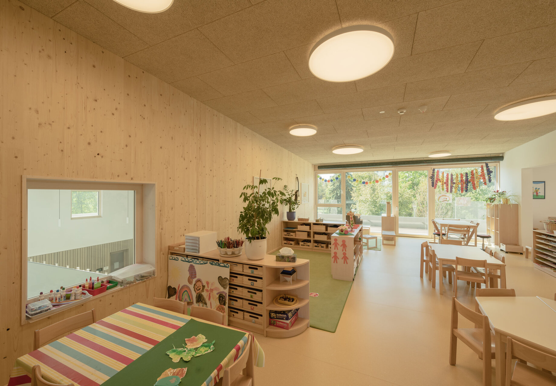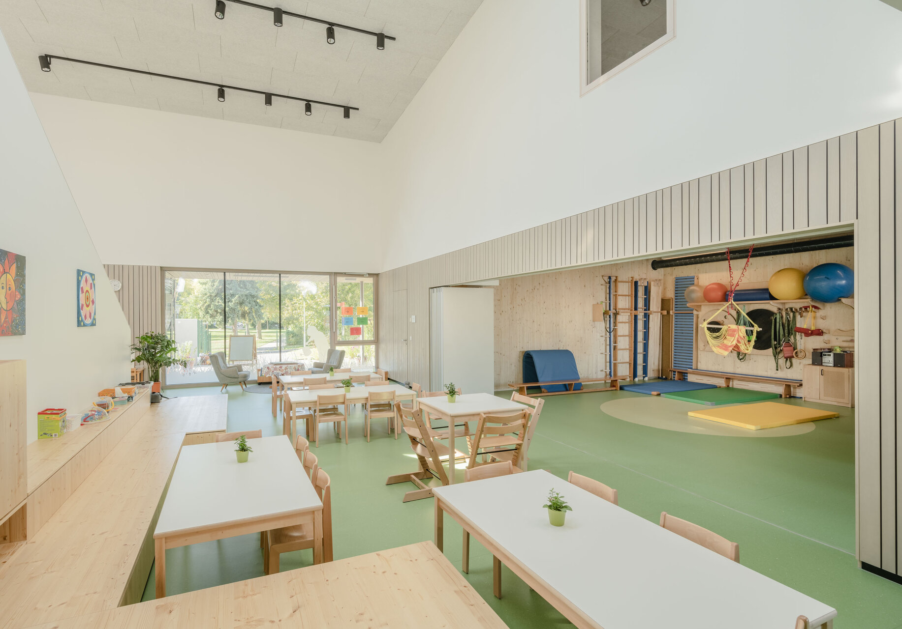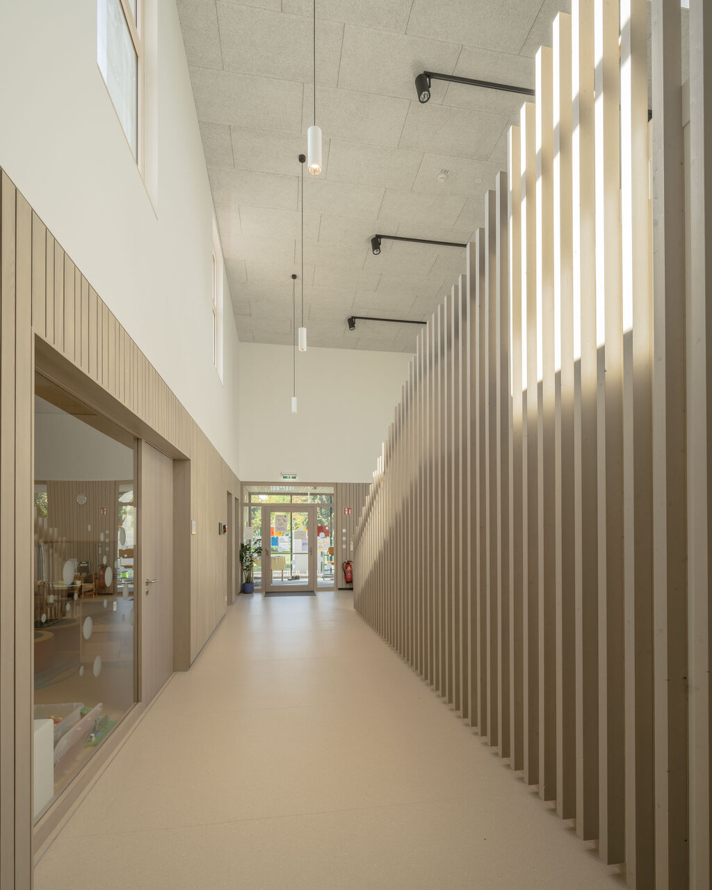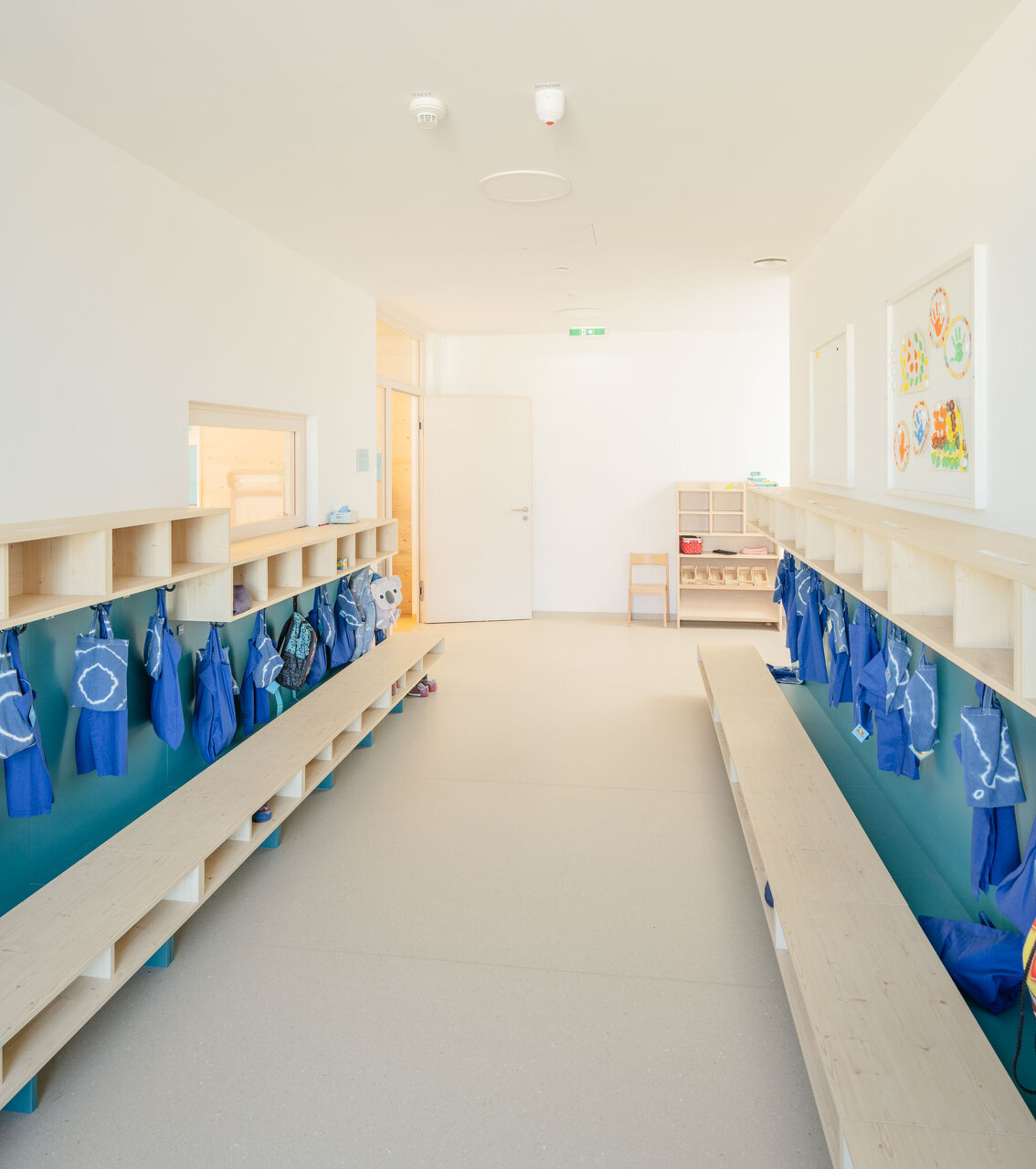 Eine großzügige zweigeschossige Aula samt spannender Sitzlandschaft nimmt die Besucher:innen beim Betreten des Gebäudes in Empfang. Dieser Bereich dient als zentraler Begegnungspunkt und ist vielseitig nutzbar. Eine mobile Trennwand zum anschließenden Bewegungsraum ermöglicht zusätzliche Flexibilität für Veranstaltungen, Elternabende, Feste oder Workshops. Sitzstufen laden zum Ausruhen, Spielen, Plaudern und Klettern ein. Die Wände sind teilweise in Sichtholzqualität belassen und machen so die nachhaltige Bauweise für die Kinder erlebbar. (Text: Architekten, bearbeitet)