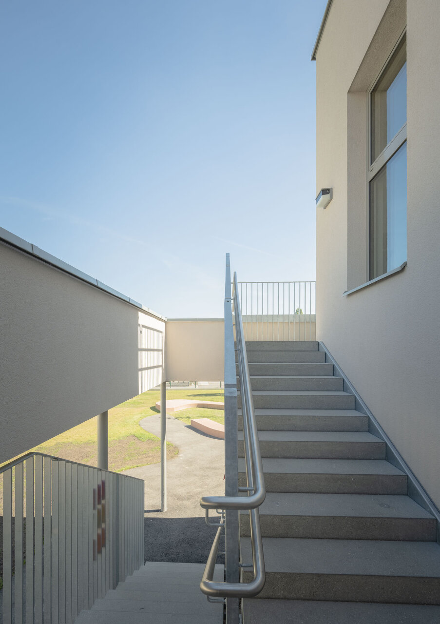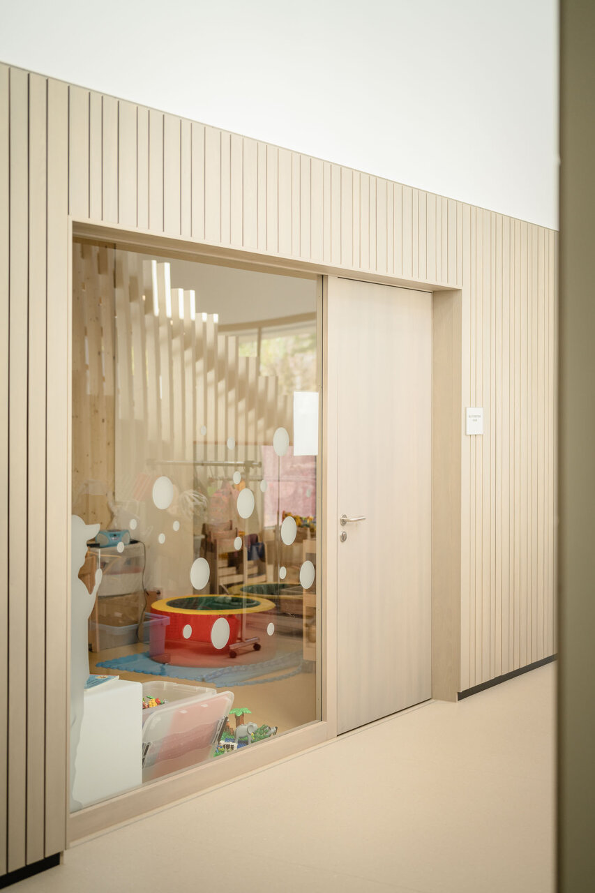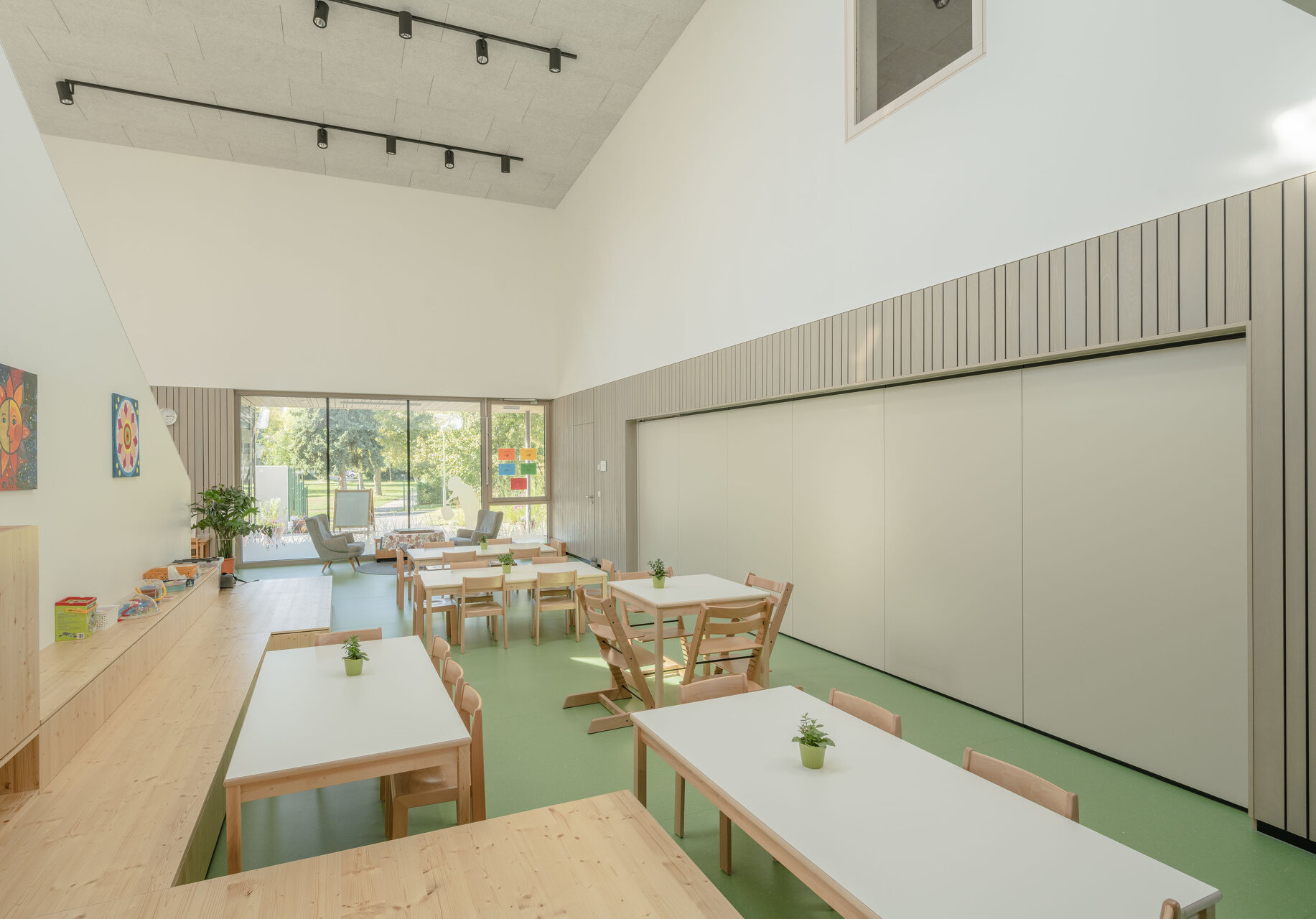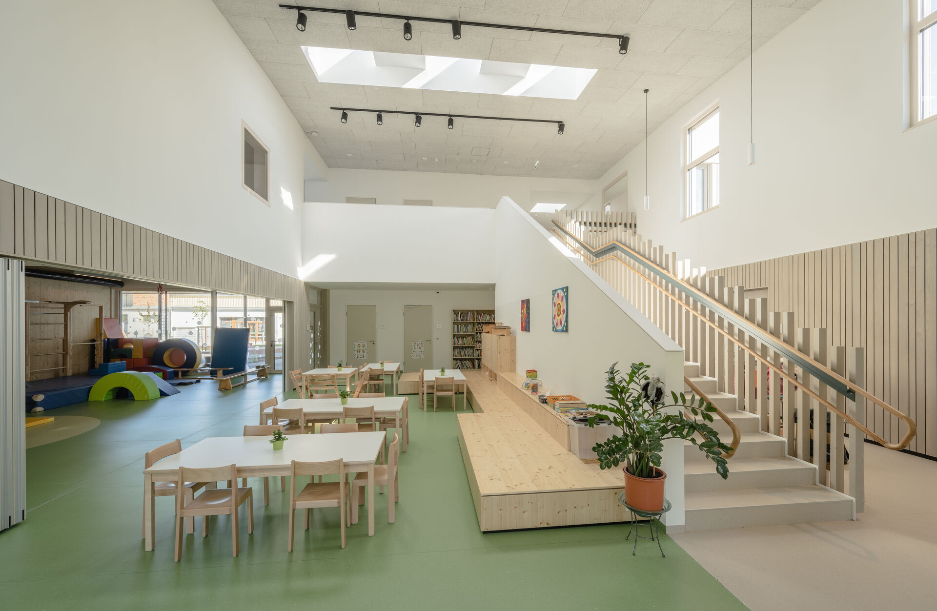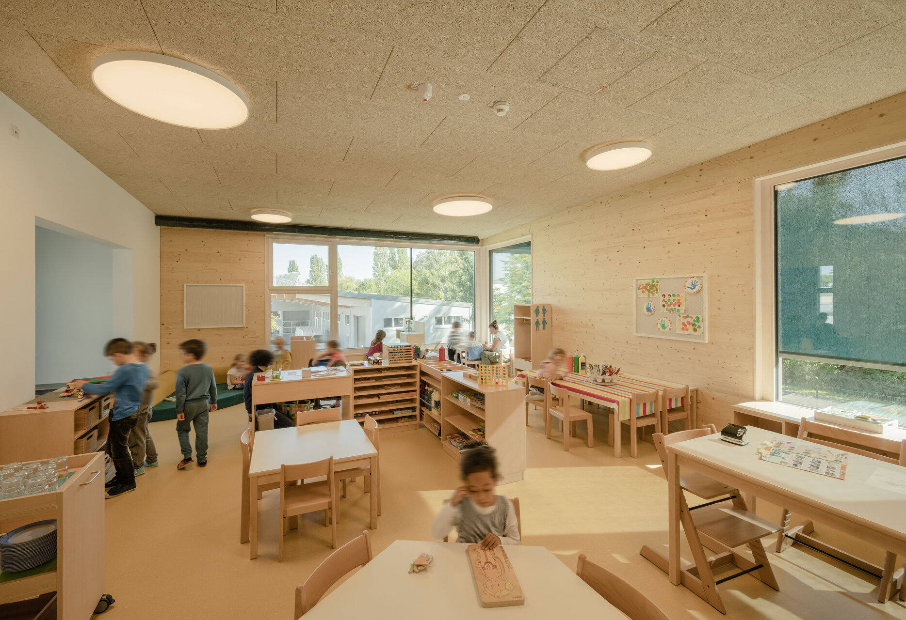 Eine großzügige zweigeschossige Aula samt spannender Sitzlandschaft nimmt die Besucher:innen beim Betreten des Gebäudes in Empfang. Dieser Bereich dient als zentraler Begegnungspunkt und ist vielseitig nutzbar. Eine mobile Trennwand zum anschließenden Bewegungsraum ermöglicht zusätzliche Flexibilität für Veranstaltungen, Elternabende, Feste oder Workshops. Sitzstufen laden zum Ausruhen, Spielen, Plaudern und Klettern ein. Die Wände sind teilweise in Sichtholzqualität belassen und machen so die nachhaltige Bauweise für die Kinder erlebbar. (Text: Architekten, bearbeitet)