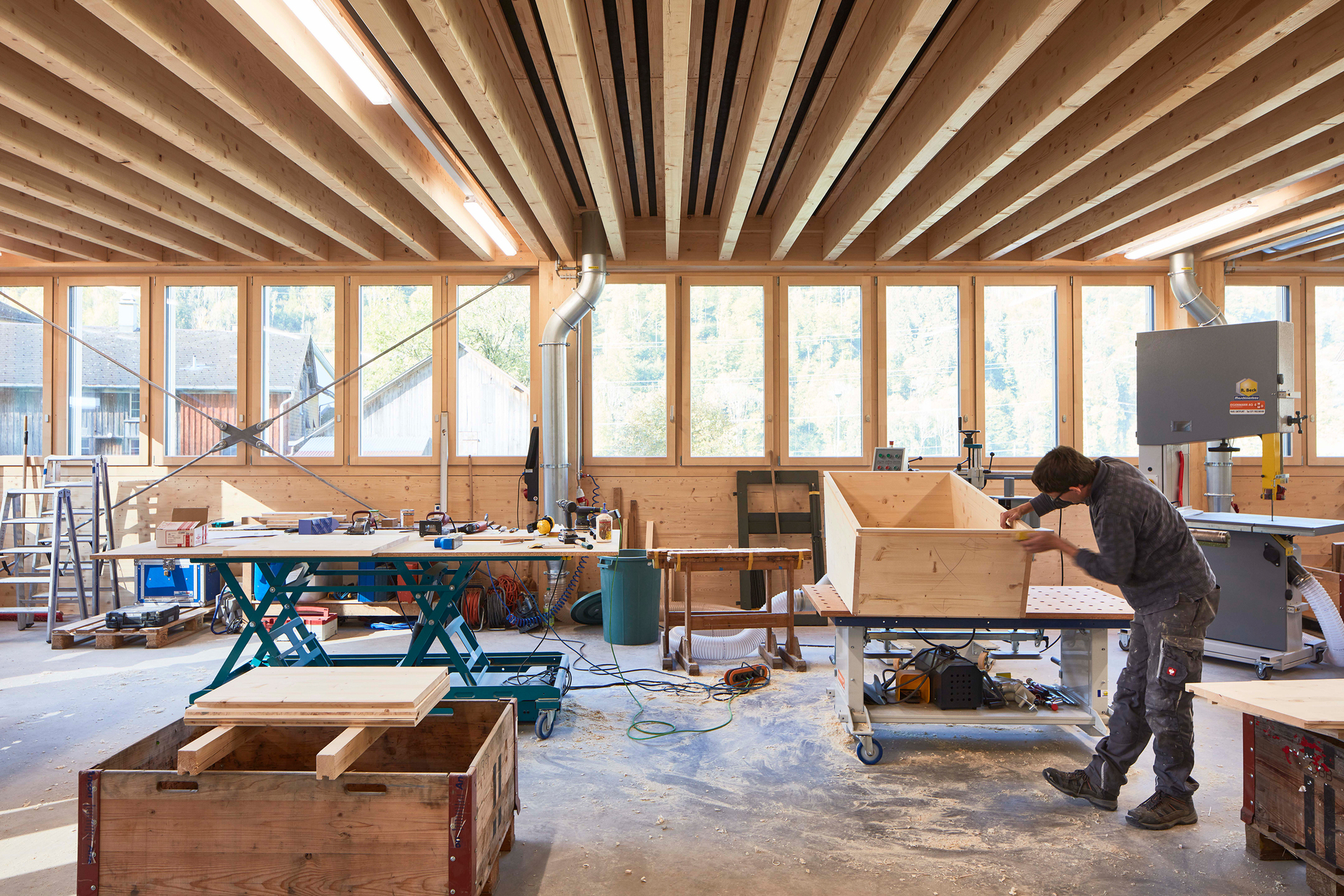 Im teilweise eingegrabenen Sockelgeschoss befinden sich die Büroräume, eine Fahrzeugeinstellhalle und ein Lagerraum. Im Erdgeschoss ist talseitig die Schreinerei mit einer darüberliegenden Galerie positioniert, bergseitig schließt die große Zimmereihalle mit Lastenkran und einer Spannweite von rund 22 Metern an. Das Tragwerk inklusive Stützen der Werkhalle wurde komplett aus Holz gefertigt. Die Träger wurden vorfabriziert und inklusive der Spannseile in einem Stück auf die Baustelle transportiert.