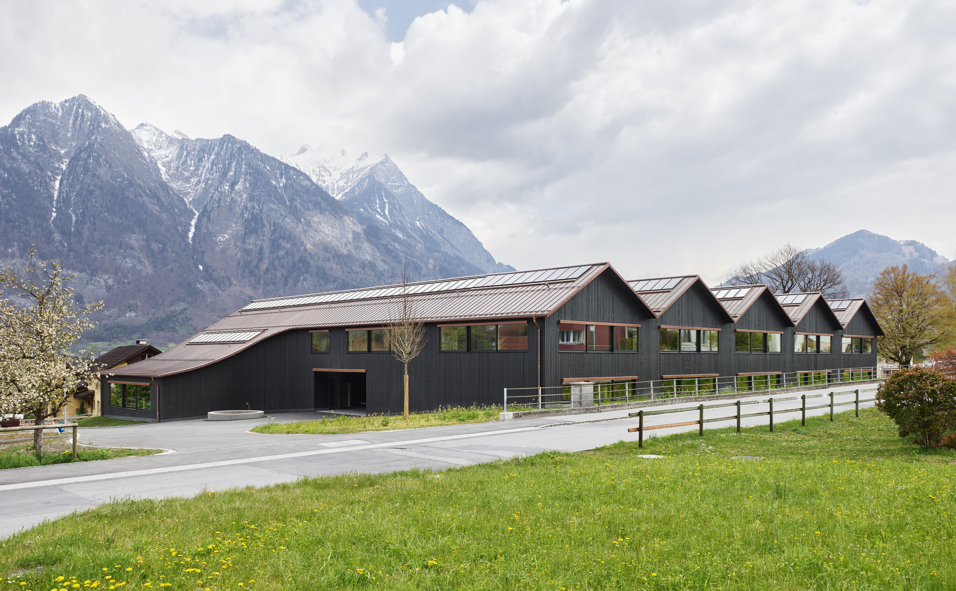 Das Gebäude erfüllt die Anforderungen des Schweizer Minergie-Eco-Standards – Vorgaben, denen die Gemeinde Wartau, zu der Azmoos und Trübbach gehören, genügen muss, um ihrem Label „Energiestadt“ gerecht zu werden. (Autor: Achim Geissinger, u.a. nach Texten der Architekten)