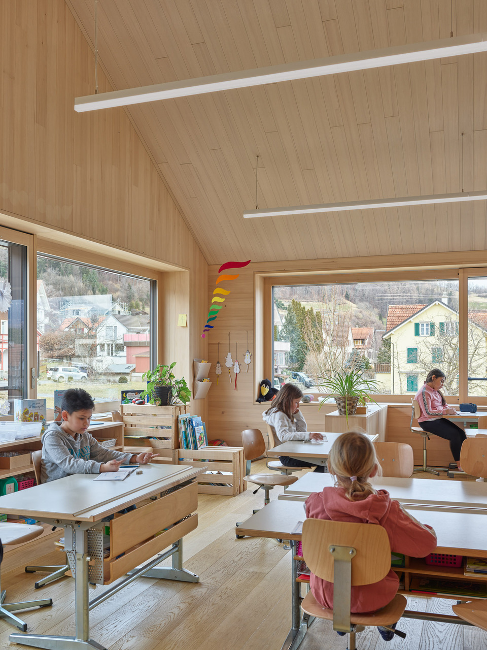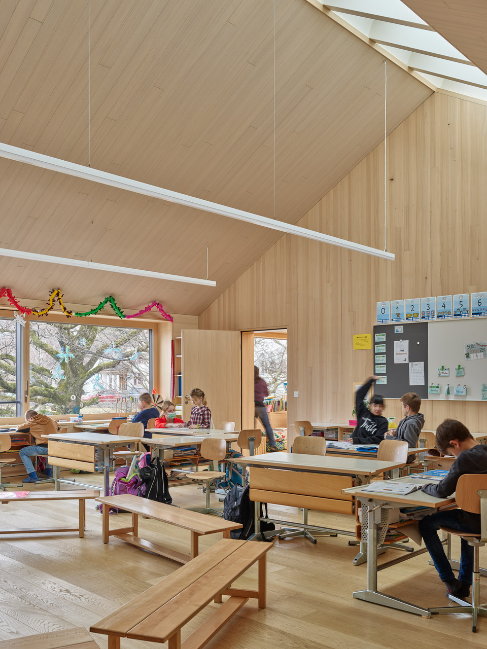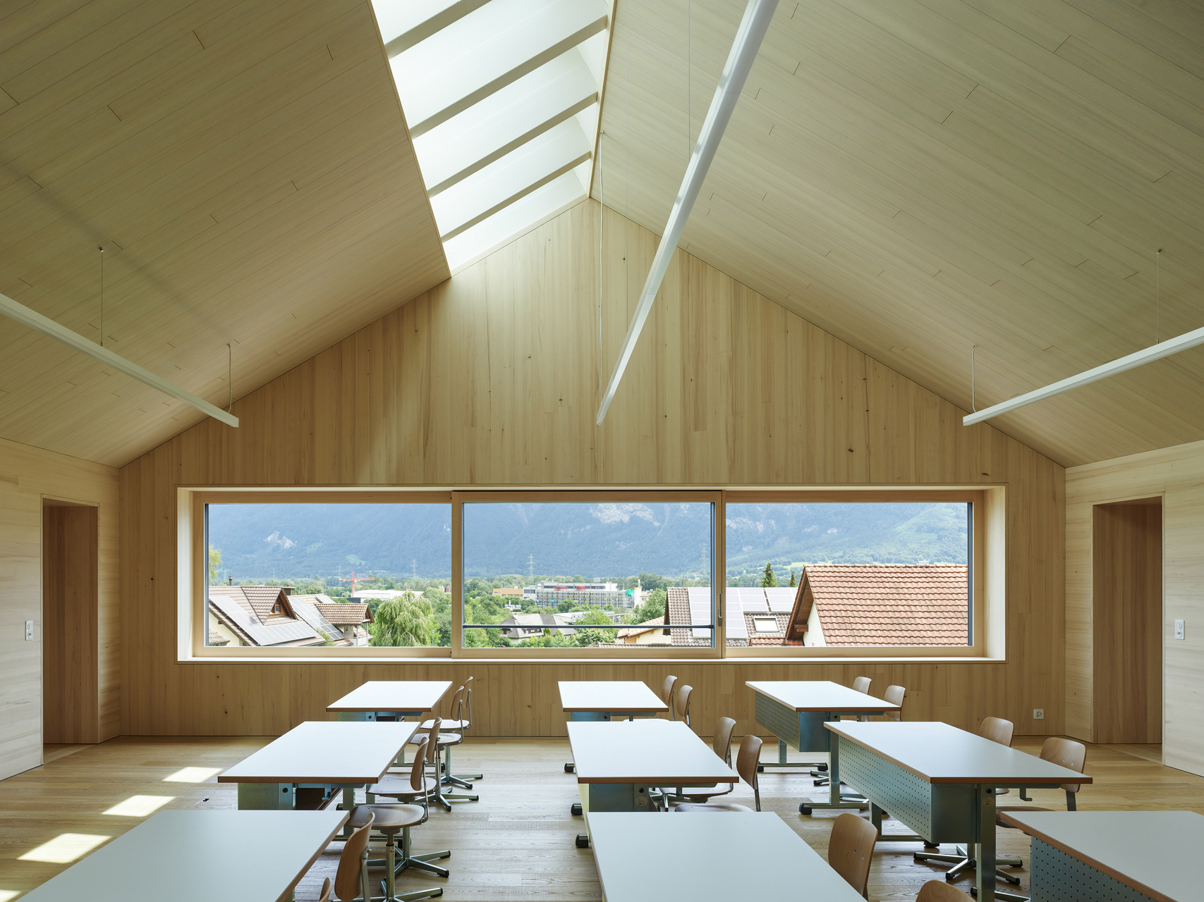 Angegliedert sind vier Werkräume, sanitäre Anlagen, Büros und in einem Appendix der separat erschlossene Kindergarten. Den Rest der 5.000 Quadratmeter Bruttogeschossfläche nehmen im Obergeschoss die neun Schulstuben ein, die ganz ohne Flure zusammen mit Aufenthaltsbereichen, angrenzenden kleineren Gruppenräumen, einem Multifunktionsraum, der Bibliothek und dem Lehrerzimmer eine horizontal vernetzte Lernlandschaft bilden. Die natürliche Belichtung erfolgt in den außenliegenden Klassenzimmern über große Fenster, aber auch über Oberlichtbänder, die nach Norden ausgerichtet sind und Tageslicht auch in die anderen, tief im Gebäudeinnern liegenden Räume bringen. Die überall präsente Dachform bringt einen kleinen, angemessenen Maßstab in das Haus, auch wenn sie zunächst einer Shedhalle ähnelt.