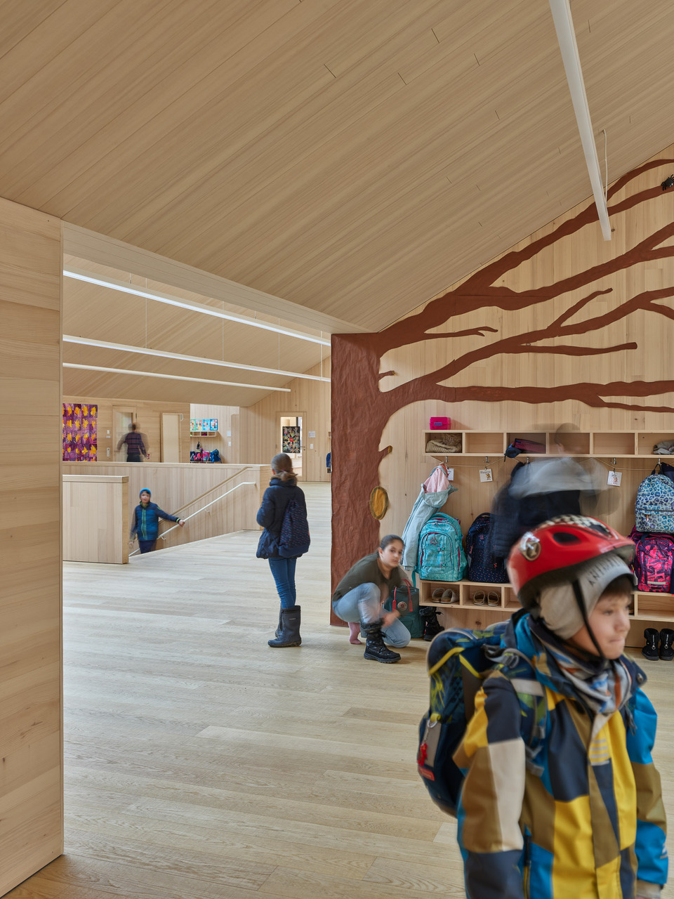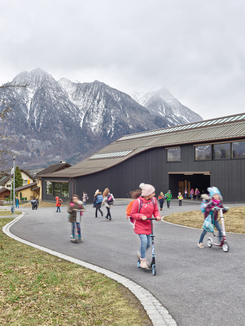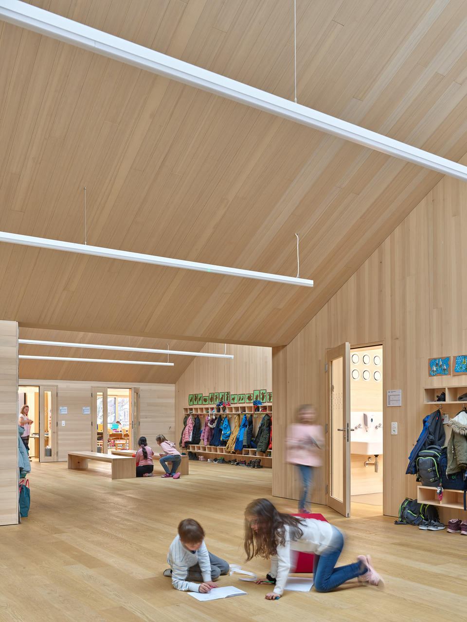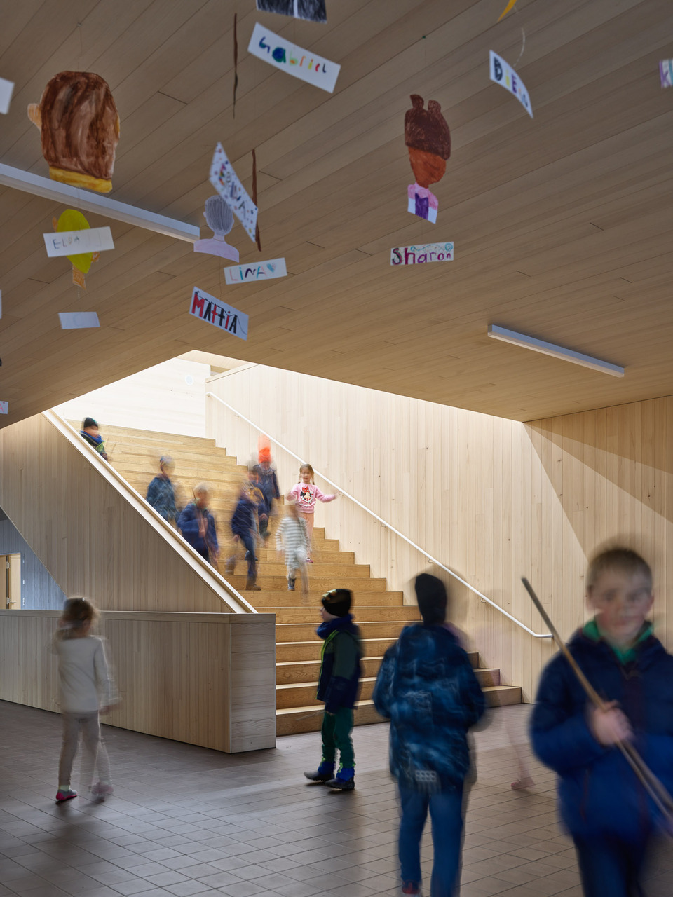 Angegliedert sind vier Werkräume, sanitäre Anlagen, Büros und in einem Appendix der separat erschlossene Kindergarten. Den Rest der 5.000 Quadratmeter Bruttogeschossfläche nehmen im Obergeschoss die neun Schulstuben ein, die ganz ohne Flure zusammen mit Aufenthaltsbereichen, angrenzenden kleineren Gruppenräumen, einem Multifunktionsraum, der Bibliothek und dem Lehrerzimmer eine horizontal vernetzte Lernlandschaft bilden. Die natürliche Belichtung erfolgt in den außenliegenden Klassenzimmern über große Fenster, aber auch über Oberlichtbänder, die nach Norden ausgerichtet sind und Tageslicht auch in die anderen, tief im Gebäudeinnern liegenden Räume bringen. Die überall präsente Dachform bringt einen kleinen, angemessenen Maßstab in das Haus, auch wenn sie zunächst einer Shedhalle ähnelt.