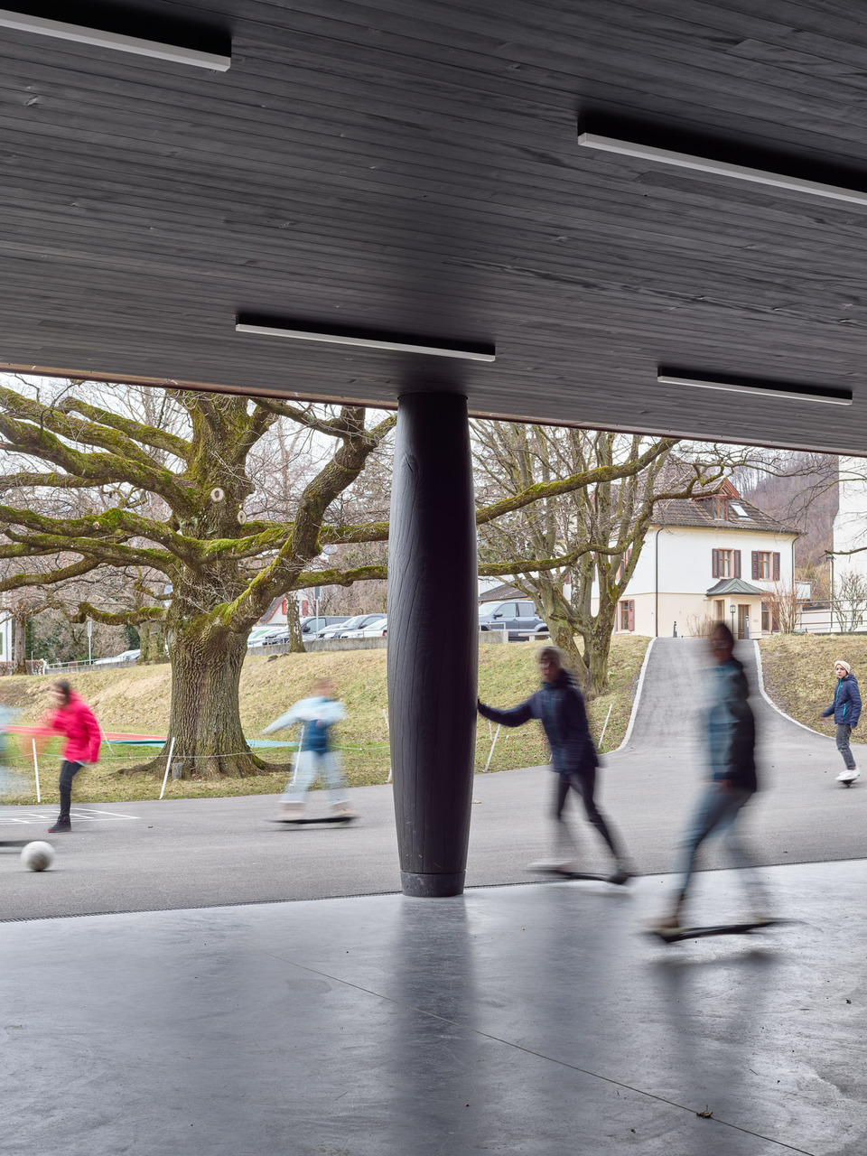 Eine breite Erschließungszone im Erdgeschoss durchzieht das gesamte Gebäude der Länge nach und verbindet zwei vorgelagerte hofartig konzipierte, dennoch überdachte Eingangsbereiche miteinander. Sie dient auch als Aula, und man kann von hier aus in die Turnhalle schauen.