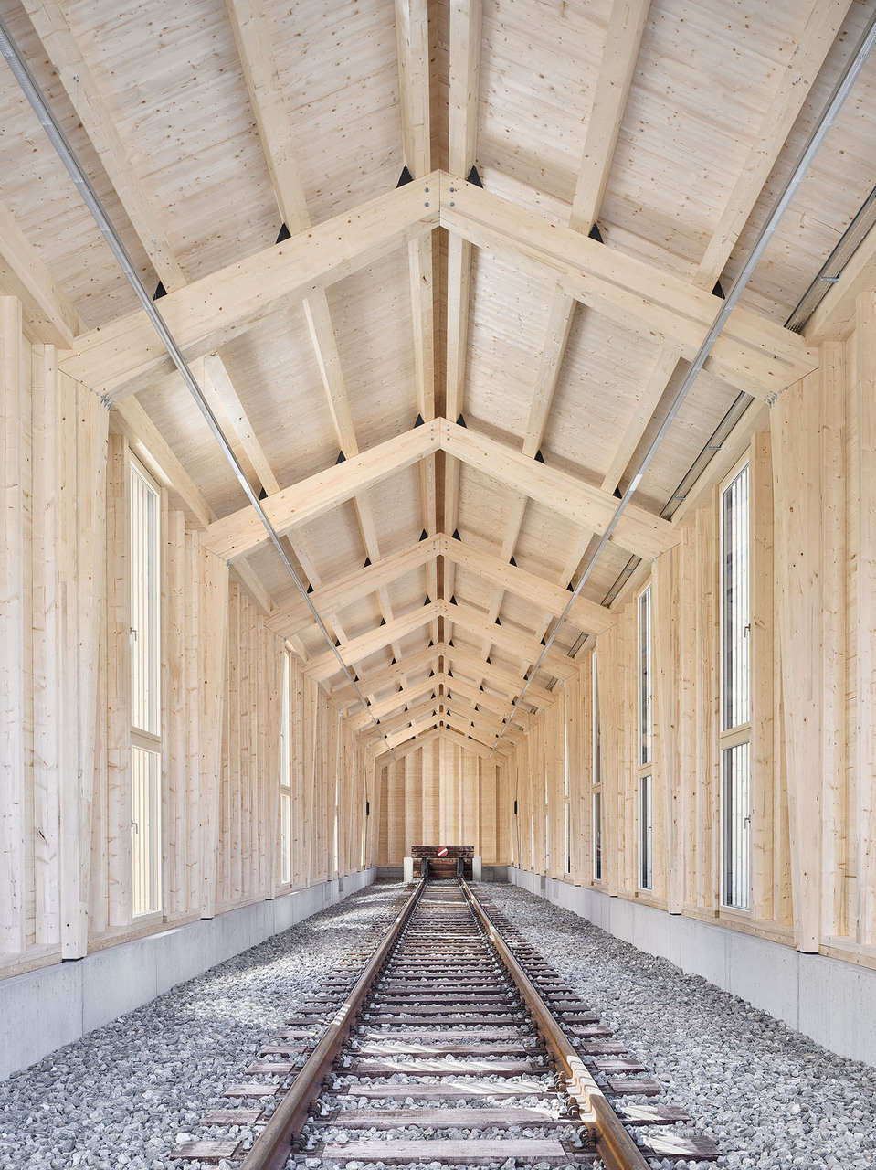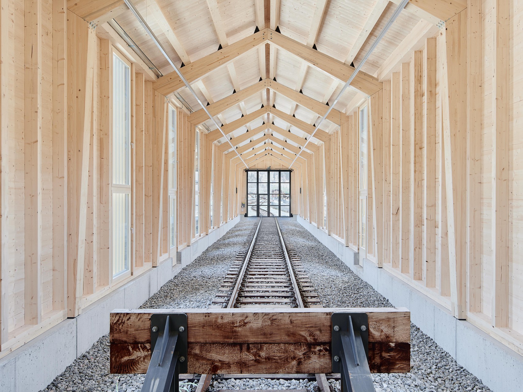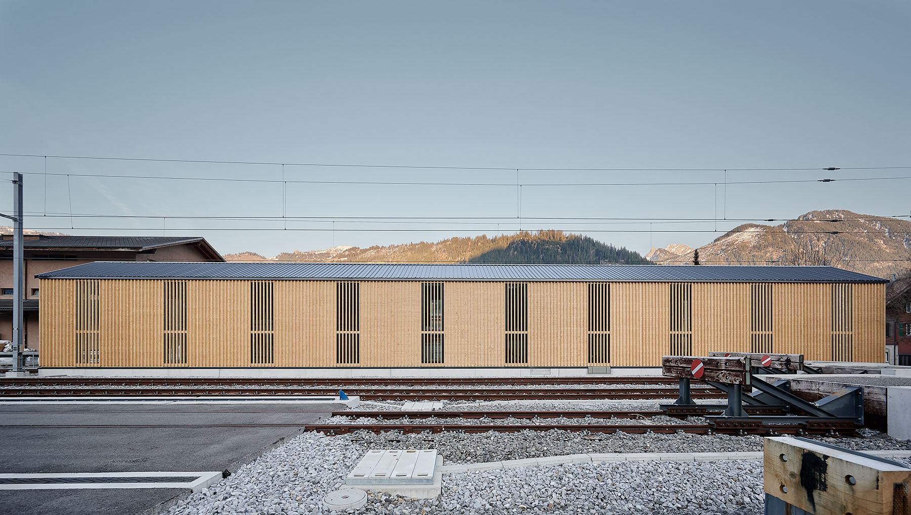 auch eine Remise für den Schneepflug der Gleisanlagen erstellt. Der Planungsauftrag an die Architekten erging Anfang 2019, die Realisierung musste wegen des schnellen Bedarfs mitten im Winter, im Januar/Februar 2020, vonstatten gehen. Der enge Zeitplan und die Winterzeit verlangten für die zügige Umsetzung vor Ort nach einem hohen Grad der Vorfabrikation. So wurde die Remise auf bestehendem Betonsockel als Holzelement-Bau konzipiert. Sie misst in der Länge 50,45 m, ihre statische Basis wird von 11 Bindern als Dreigelenkrahmen gebildet. Abgesehen von der Dacheindeckung mit Trapezblech als wasserführende Schicht und den metallenen Verbindungen und diszipliniert ausgewählten und gesetzten Windverbänden ist die Lokremise ein reiner Holzbau. Die Fügung der einzelnen Elemente ist extrem einfach gehalten, Stützen, Horizontalschalung und Lisenen bestehen aus Lärche, allesamt vorgefertigt und Hand in Hand mit den Bindern und Sparrenpfetten vor Ort zusammengebaut.