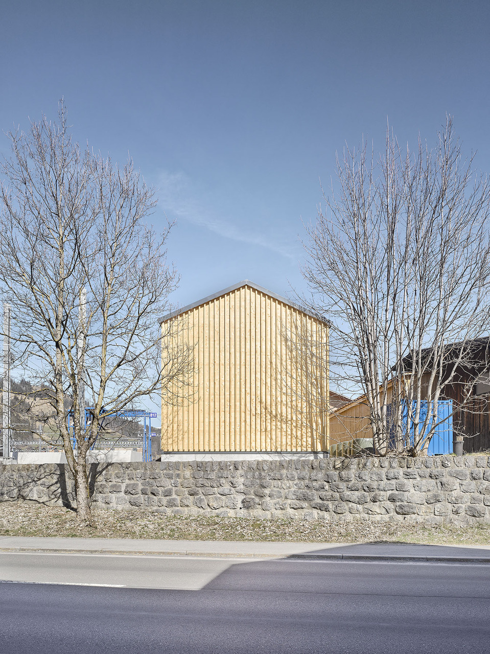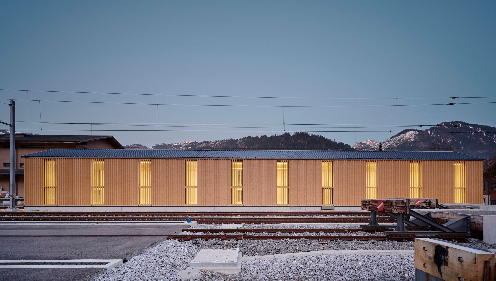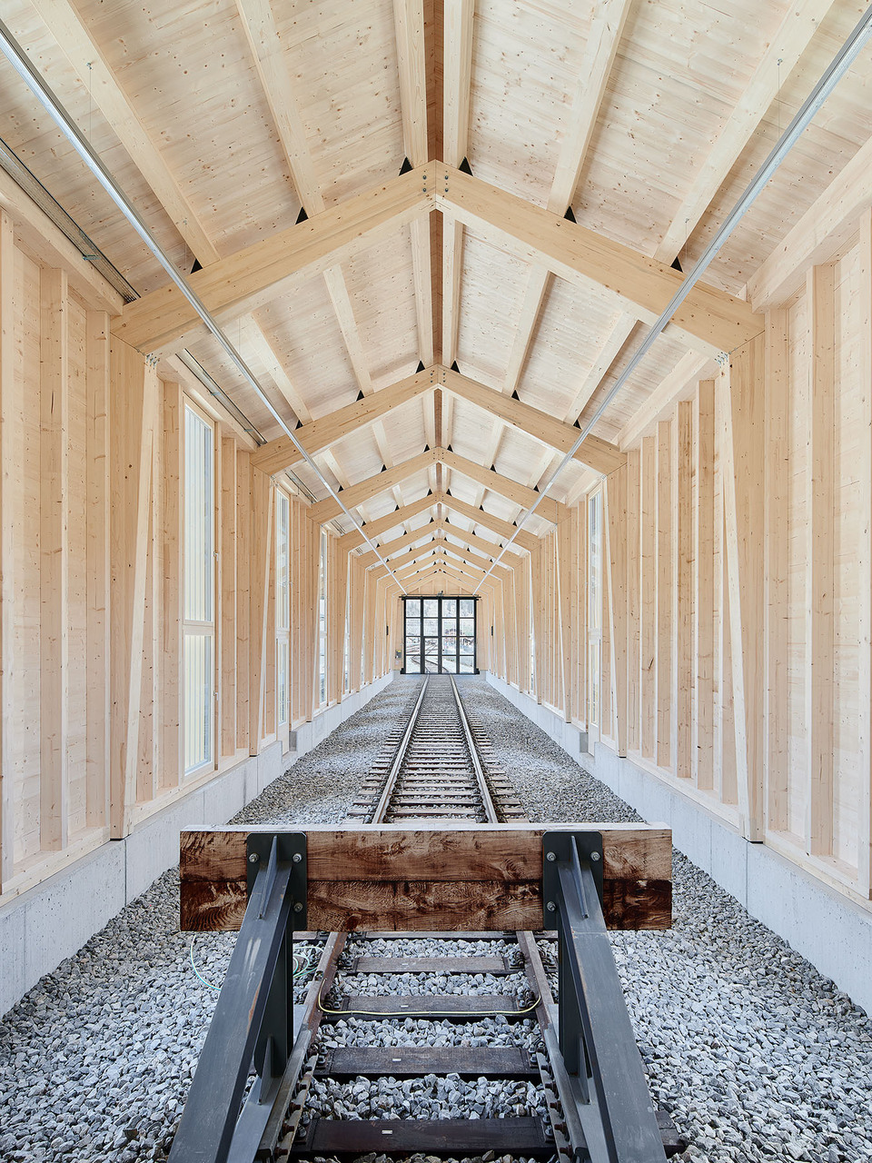 auch eine Remise für den Schneepflug der Gleisanlagen erstellt. Der Planungsauftrag an die Architekten erging Anfang 2019, die Realisierung musste wegen des schnellen Bedarfs mitten im Winter, im Januar/Februar 2020, vonstatten gehen. Der enge Zeitplan und die Winterzeit verlangten für die zügige Umsetzung vor Ort nach einem hohen Grad der Vorfabrikation. So wurde die Remise auf bestehendem Betonsockel als Holzelement-Bau konzipiert. Sie misst in der Länge 50,45 m, ihre statische Basis wird von 11 Bindern als Dreigelenkrahmen gebildet. Abgesehen von der Dacheindeckung mit Trapezblech als wasserführende Schicht und den metallenen Verbindungen und diszipliniert ausgewählten und gesetzten Windverbänden ist die Lokremise ein reiner Holzbau. Die Fügung der einzelnen Elemente ist extrem einfach gehalten, Stützen, Horizontalschalung und Lisenen bestehen aus Lärche, allesamt vorgefertigt und Hand in Hand mit den Bindern und Sparrenpfetten vor Ort zusammengebaut.