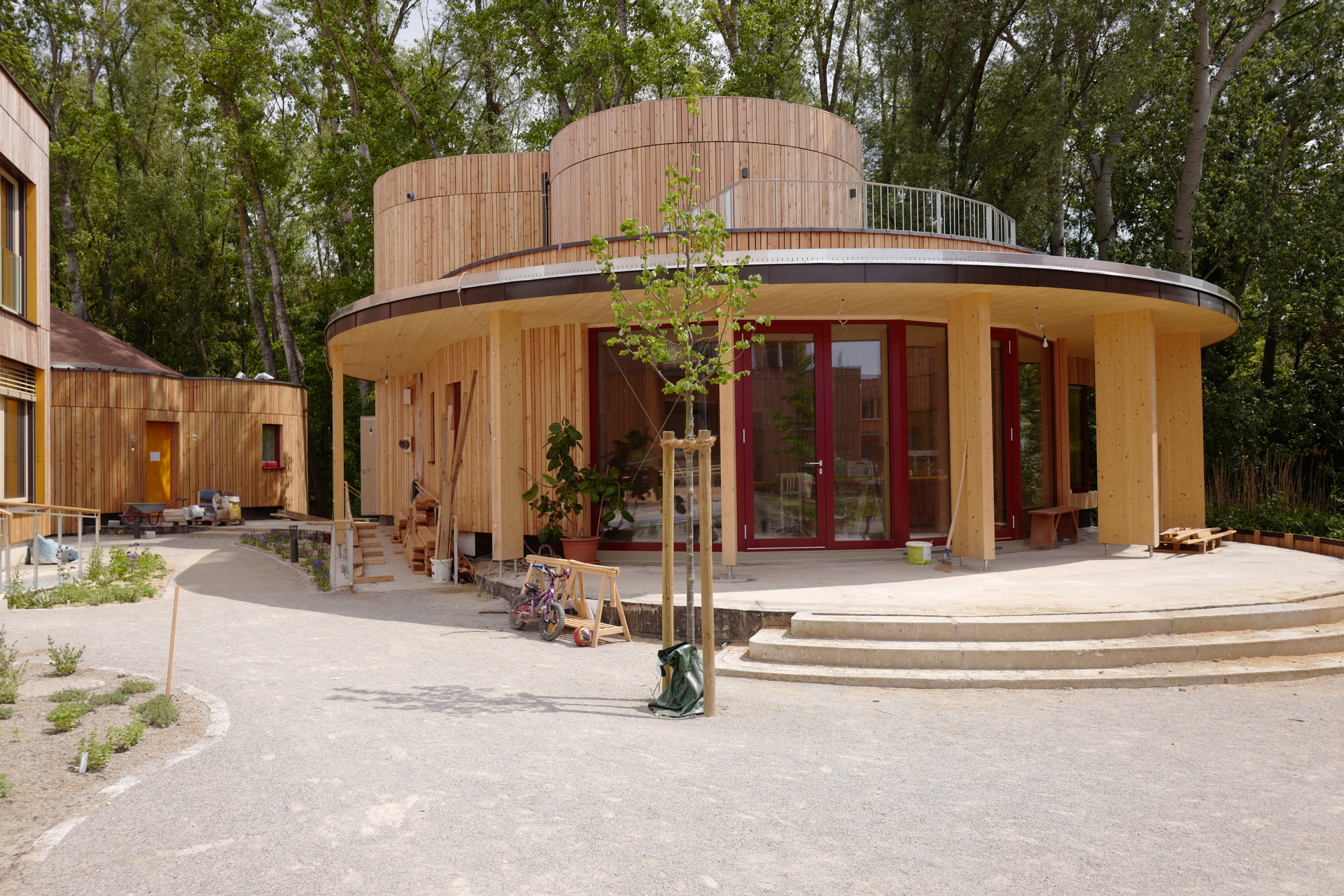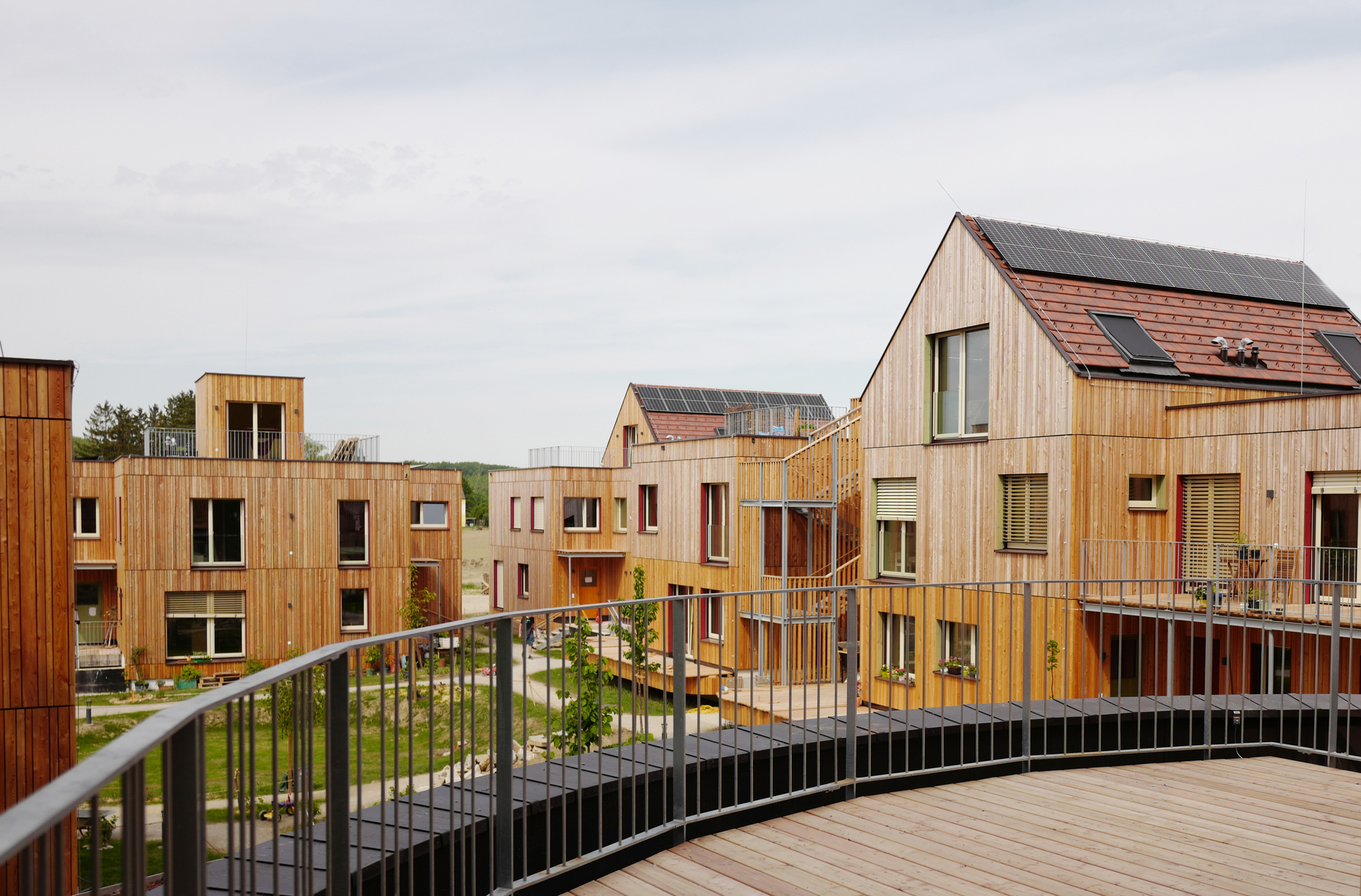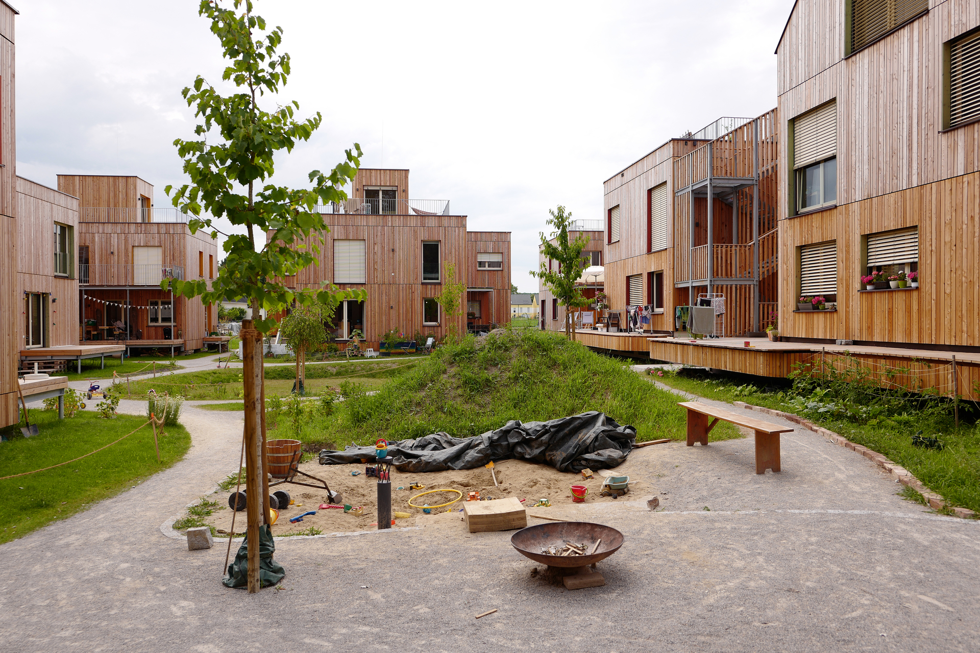 Die 25 Wohneinheiten mit Größen von 35 bis 115 Quadratmetern sind in acht Mehrfamilienhäusern untergebracht, gruppiert um einen zentralen Platz. Der Platz im Zentrum mit seinen geschwungenen unversiegelten Wegen, der begrünten Mulde, in der das Regenwasser versichern kann und der mit Aushubmaterial geformte Spielhügel signalisieren auf den ersten Blick, wie hier hohe ökologische Standards mit alltagstauglicher und gleichermaßen ästhetischer Gestaltung verbunden wurden. Kein Zaun umgrenzt die Siedlung, allein die Position der Häuser schafft eine geborgene Mitte und definiert einen klaren Siedlungseingang. Der liegt dort, wo sich zwei auf runden Grundrissen komponierte Gemeinschaftsgebäude an das Wäldchen schmiegen, das im Osten etwa ein Sechstel des Grundstücks einnimmt. Hier gibt es unter anderem Platz für kleine Konzerte und andere Veranstaltungen sowie eine große Gemeinschaftsküche. Ein Terrassenplateau verbindet die Häuser und bildet Richtung Siedlungsmitte eine Art „Dorfloggia“, während sie an der Waldseite zum wildromantischen Wandelpfad und Rückzugsort unter Bäumen wird.