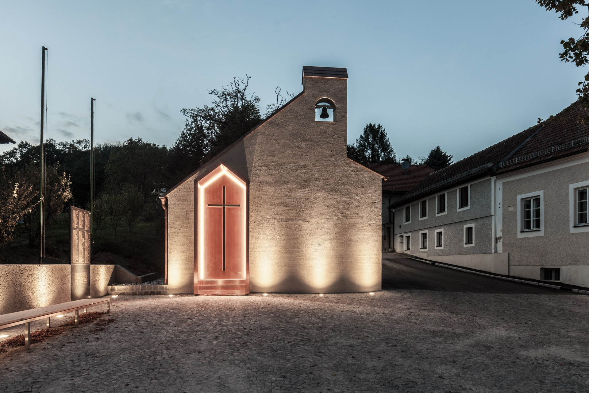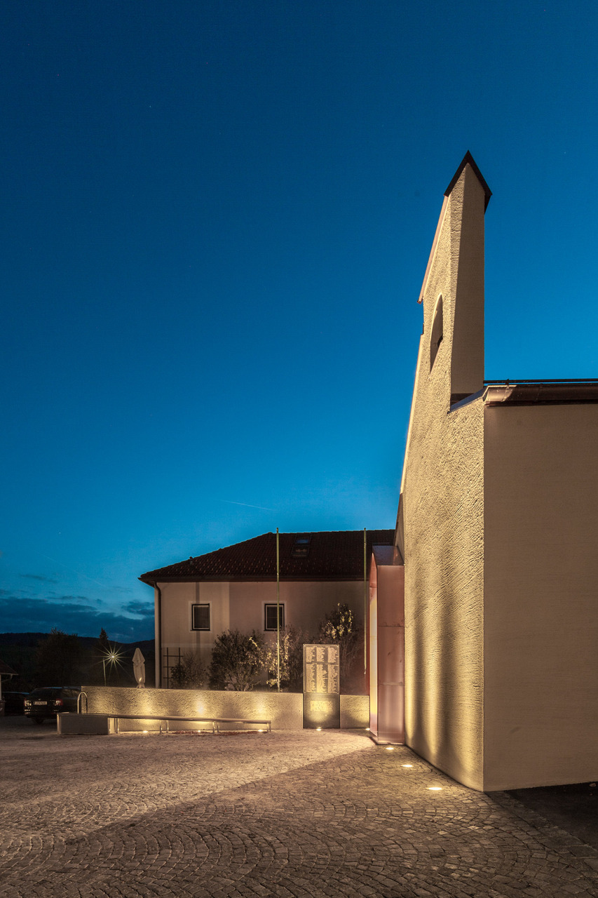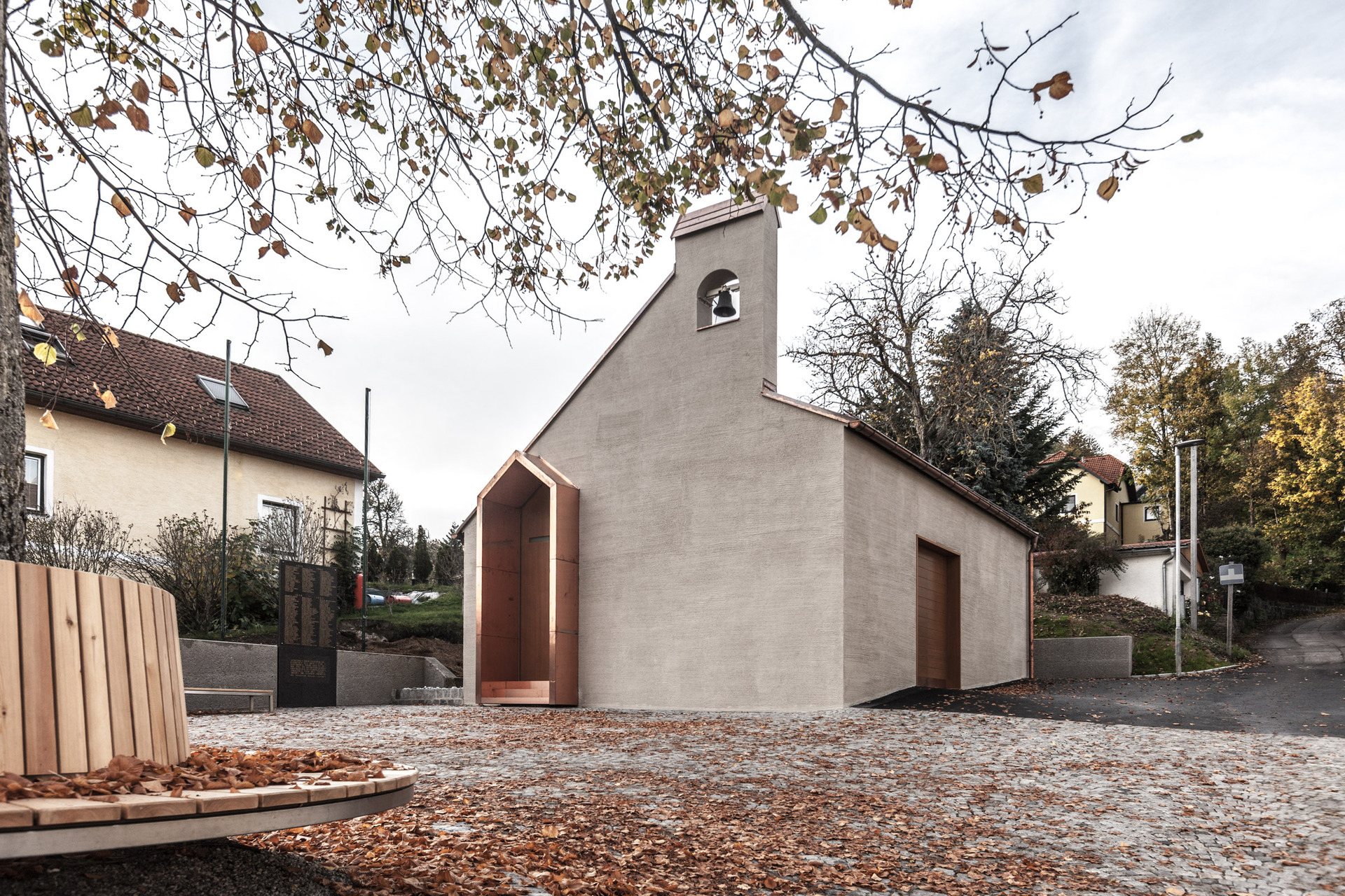 Ein fließendes Kommen und Gehen war vor der Umgestaltung nicht möglich. Ein störender Aspekt der renovierungsbedürftigen Aufbahrungshalle wurde durch das Einfügen einer weiteren Öffnung geändert. Das neue Eingangsportal ist zum Platz gerichtet und bildet eine Blickachse zur Kirche. Dieser Eingriff ermöglicht eine angemessene Atmosphäre für einen würdevollen Abschied ohne lästiges Gedränge. Bei der Außengestaltung wurde bewusst zu erdigen Materialien gegriffen. Der Besenstrich-Verputz an der Aufbahrungshalle verleiht dem Gebäude Struktur und bewirkt eine harmonische Eingliederung in das Platzgeschehen. (Text: Architekten, bearbeitet)