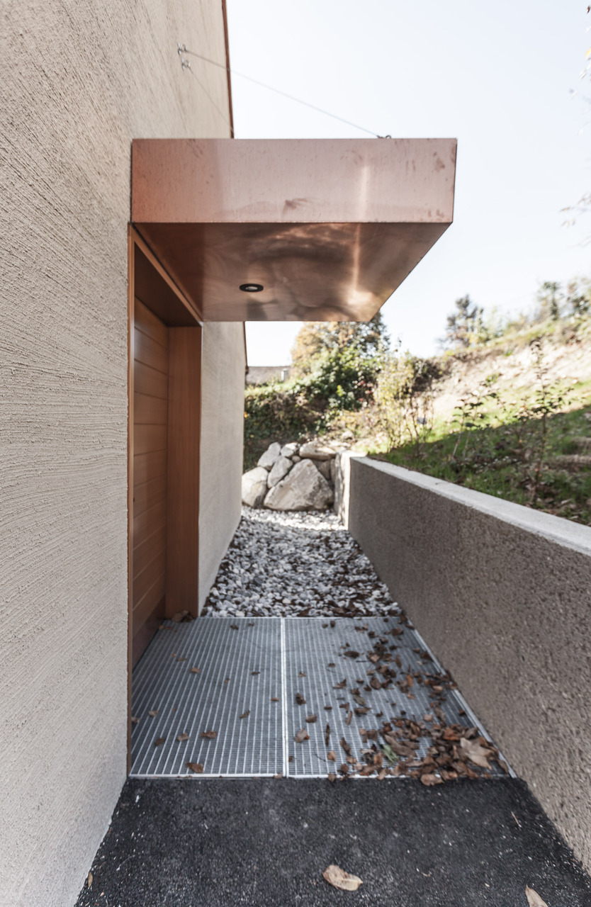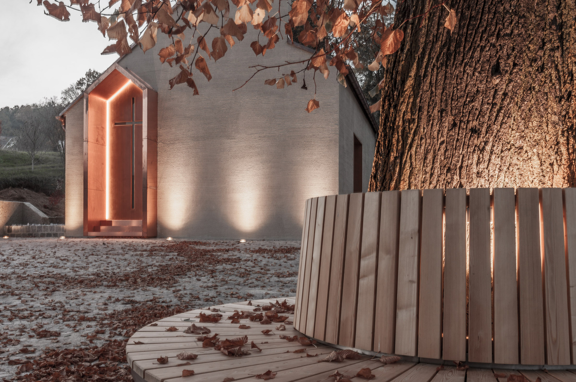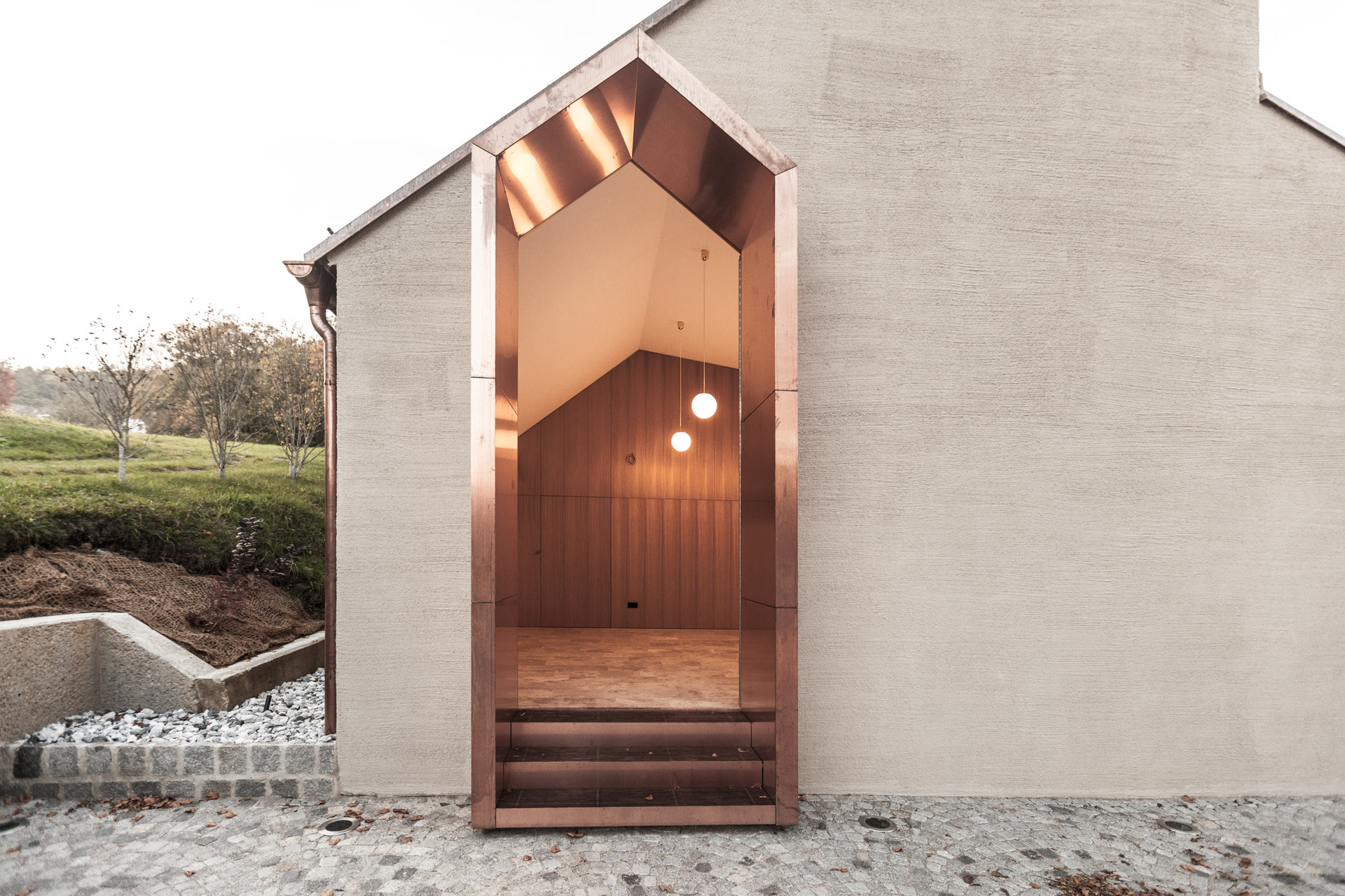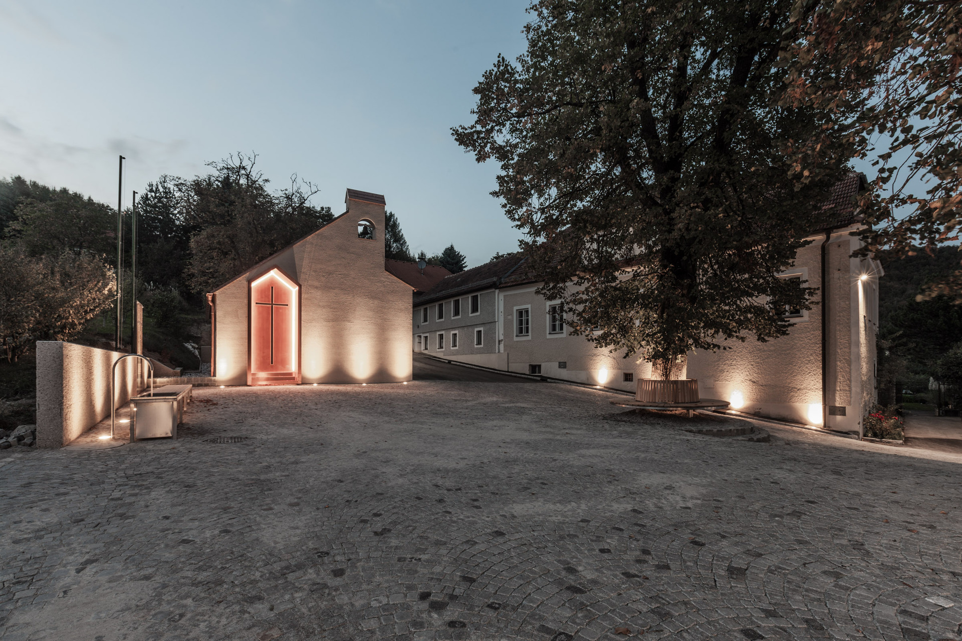 Ein fließendes Kommen und Gehen war vor der Umgestaltung nicht möglich. Ein störender Aspekt der renovierungsbedürftigen Aufbahrungshalle wurde durch das Einfügen einer weiteren Öffnung geändert. Das neue Eingangsportal ist zum Platz gerichtet und bildet eine Blickachse zur Kirche. Dieser Eingriff ermöglicht eine angemessene Atmosphäre für einen würdevollen Abschied ohne lästiges Gedränge. Bei der Außengestaltung wurde bewusst zu erdigen Materialien gegriffen. Der Besenstrich-Verputz an der Aufbahrungshalle verleiht dem Gebäude Struktur und bewirkt eine harmonische Eingliederung in das Platzgeschehen. (Text: Architekten, bearbeitet)