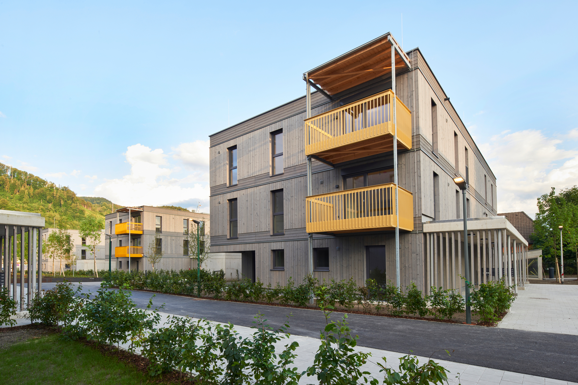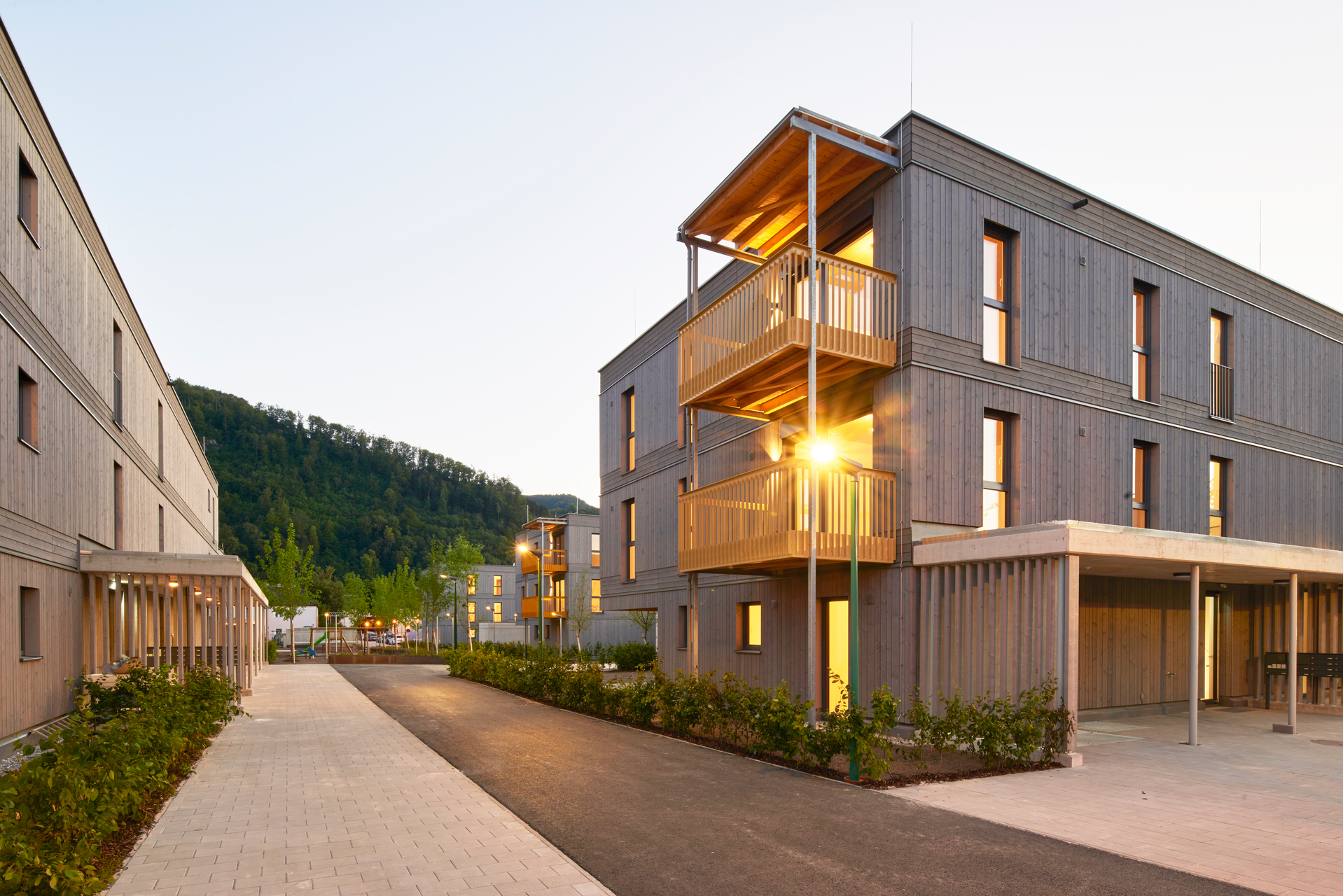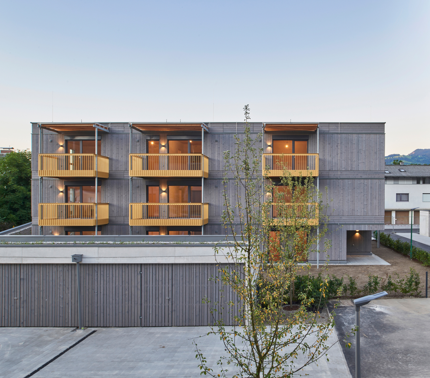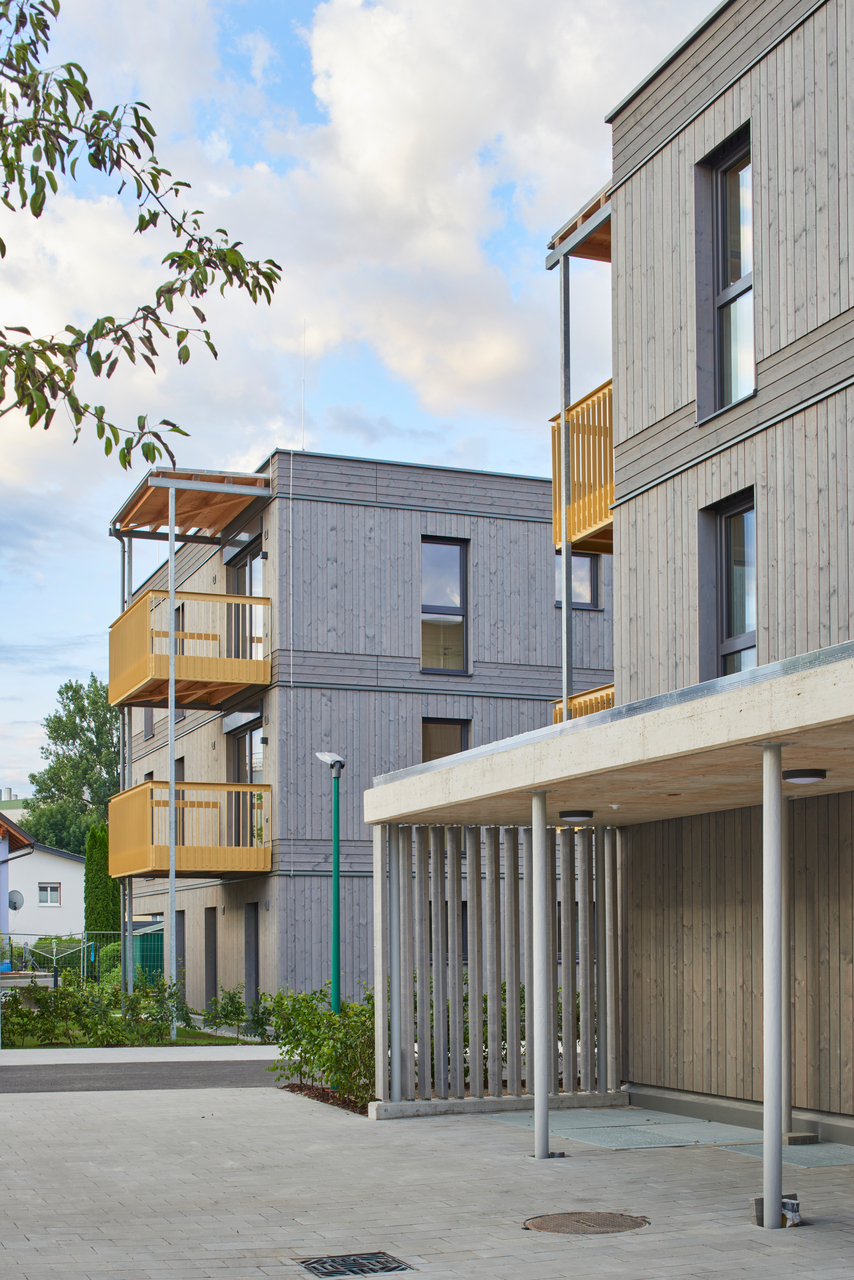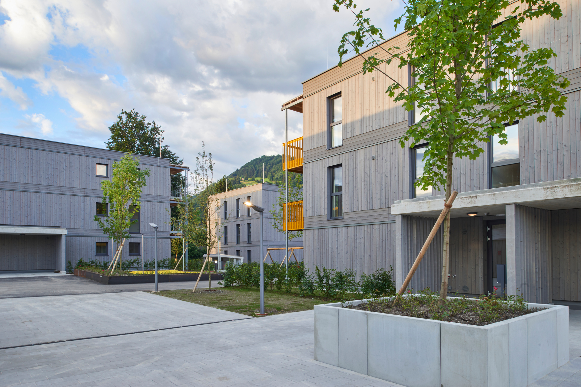 Die Umsetzung eines Holzbaus im geförderten Wohnbau ist im Bundesland Salzburg jahrelang nicht über das experimentelle Stadium hinausgekommen (siehe etwa nextroom: Holzwohnbau Glantreppelweg, 1999 oder Wohnanlage Samer Mösl, 2006). Hier gelang es nun erstmals aufgrund der geplanten Baumasse und der aus der städtebaulichen Körnung heraus entwickelten Typologie jene für den Holzbau kennzeichnenden Parameter idealtypisch zu verwirklichen. In der orthogonalen Figur der Bebauung und der gerasterten Tektonik der einzelnen Gebäude, spiegeln sich Vielfalt und Mut einer neuen Urbanität. Im Detail entstand ein konsequenter, dreigeschoßiger Holzbau mit Stiegenhäusern aus Stahlbeton. Die tragenden Außenwände sind in Riegelbauweise errichtet, die tragenden Innenwände und Decken bestehen aus Brettsperrholz. Die Balkone wurden als freistehende Stahlkonstruktionen ausgeführt. (IA, nach einem Text der Architekten)
