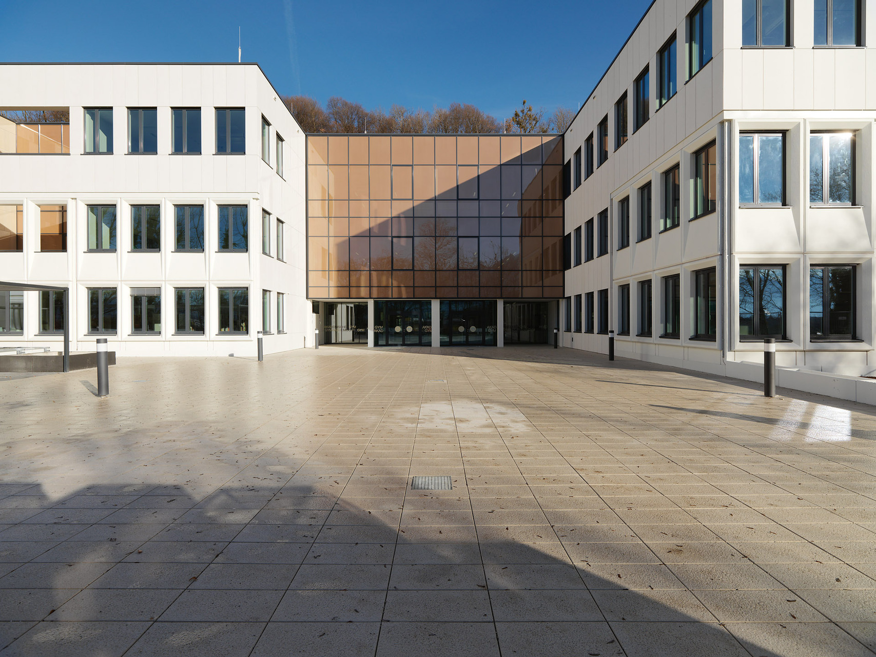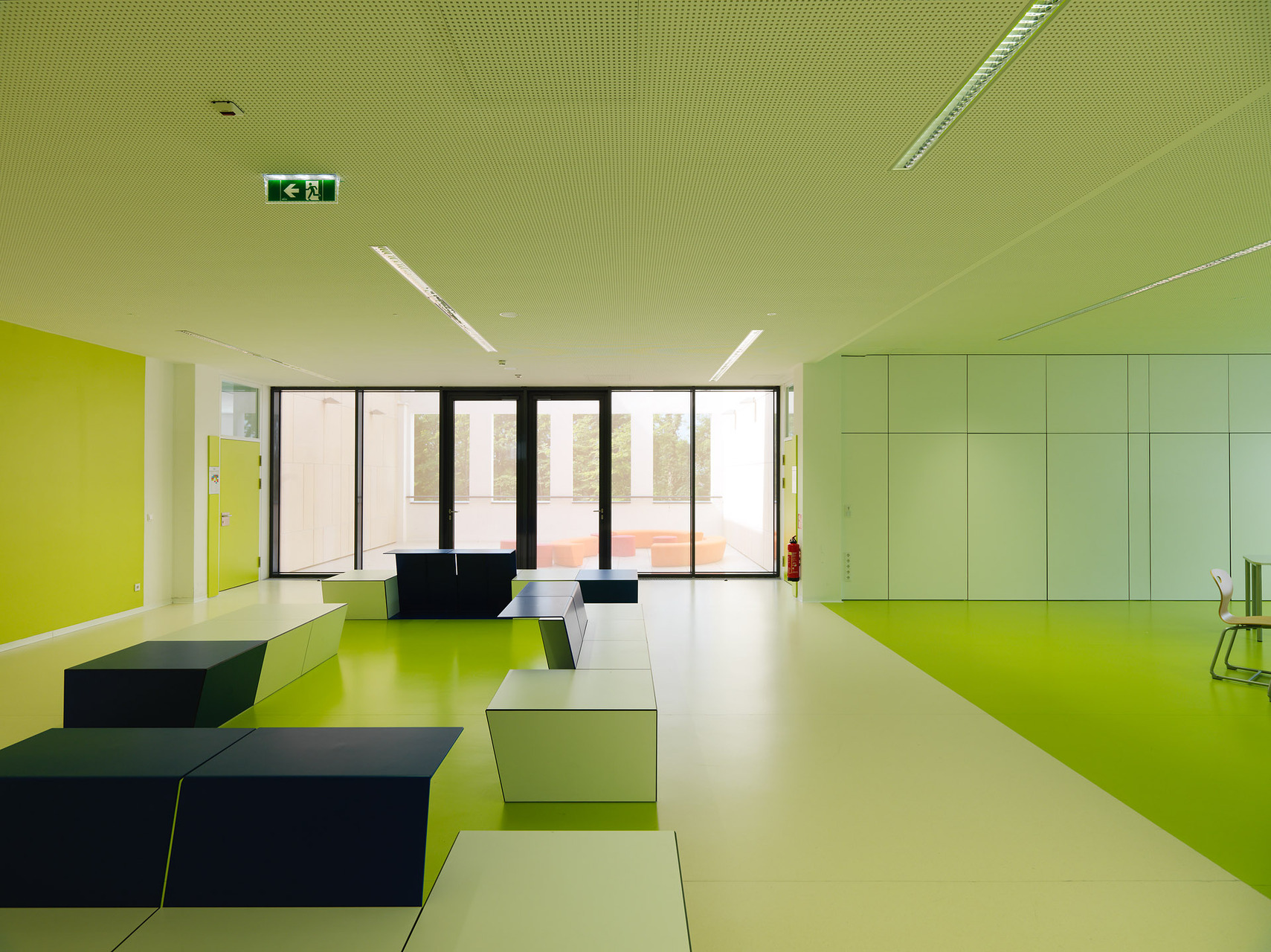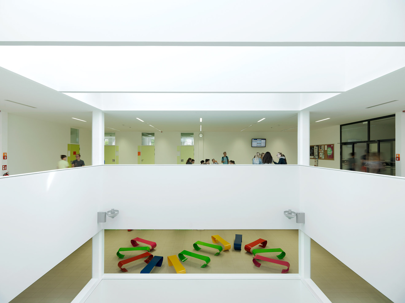 Mit gezielten Eingriffen wurden Schwächen des Bestands behoben – so wurden, um die natürliche Belichtung der Räume in den sehr tiefen Bestandsgrundrissen zu verbessern, Bestandselemente gezielt entfernt und der Innenraum zum attraktiven Landschaftsraum auf dem Rainberg hin geöffnet. Auf den verschiedenen Ebenen wurden Außenräume zu patioartigen Freiklassen, die bei entsprechender Witterung Erweiterungsmöglichkeiten zu den Lerninseln bilden. Dadurch wurde eine hierarchische Gliederung in einen zentralen, zenital belichteten Atriumsbereich und drei clusterartige Bauteile erreicht.