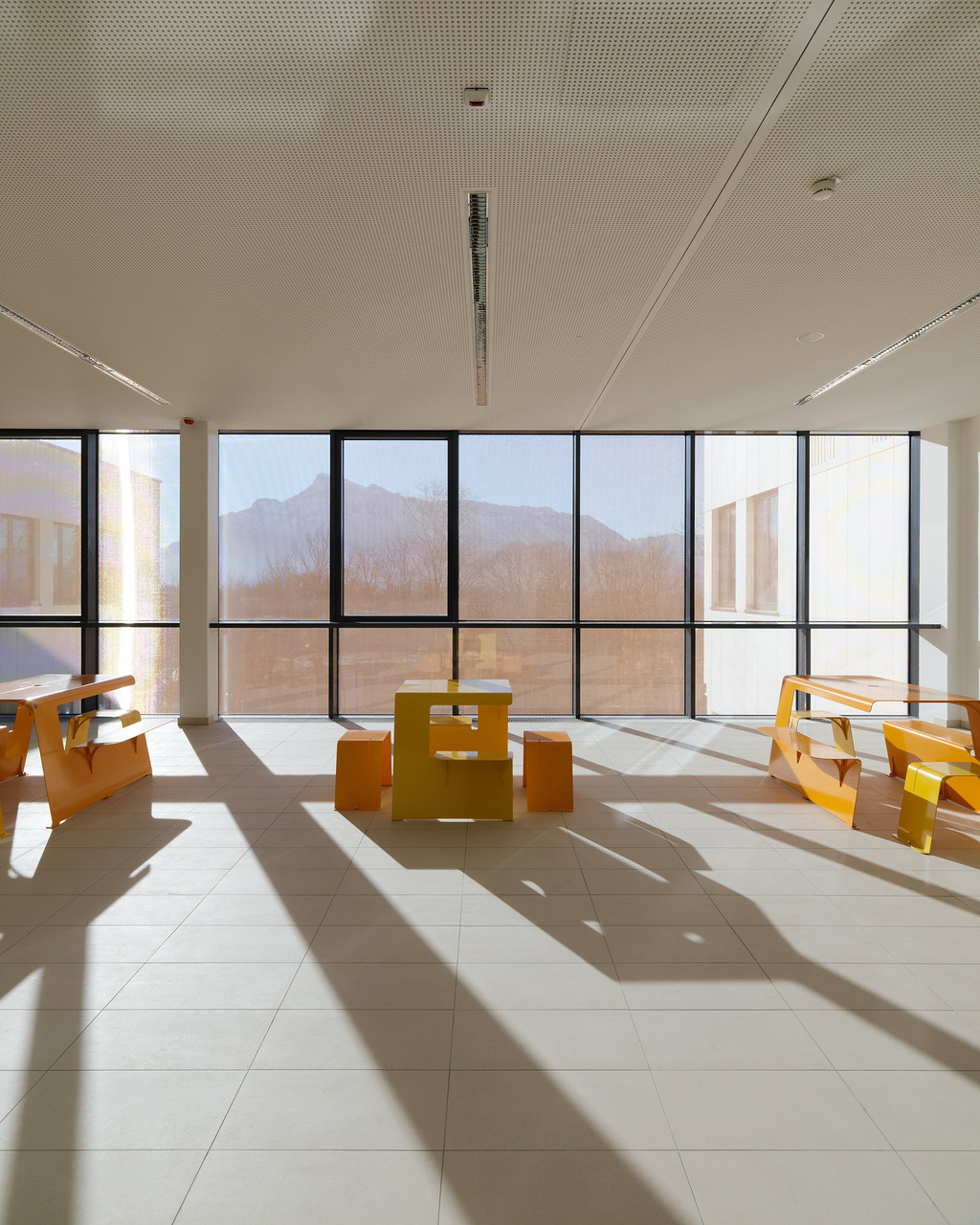 Die Erweiterungen beschränken sich auf Aufbauten im Bestandsbereich, wodurch aus dem einst zwei- ein dreigeschossiger Baukörper entstand, dessen Höhenentwicklung aus heutiger Sicht kein Verlust für die Wahrnehmung des Landschaftsraums darstellt. Dieser ist jetzt auch im Gebäude spürbar: So erlebt man nun, wenn man vom südlich gelegenen Vorplatz das Gebäude betritt, den Außenraum der im Norden des Hauses gelegenen Felswand. (Text: Roman Höllbacher)