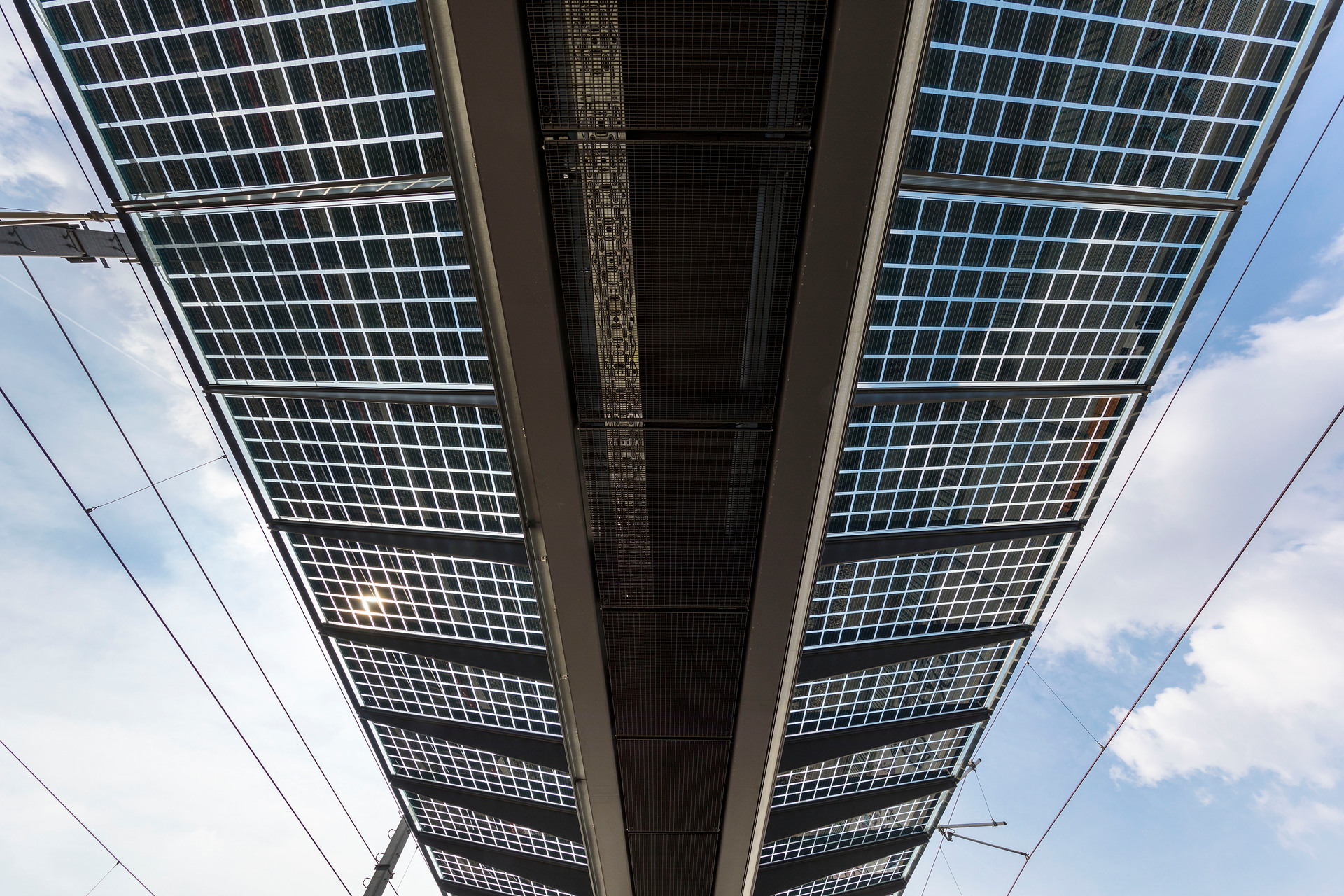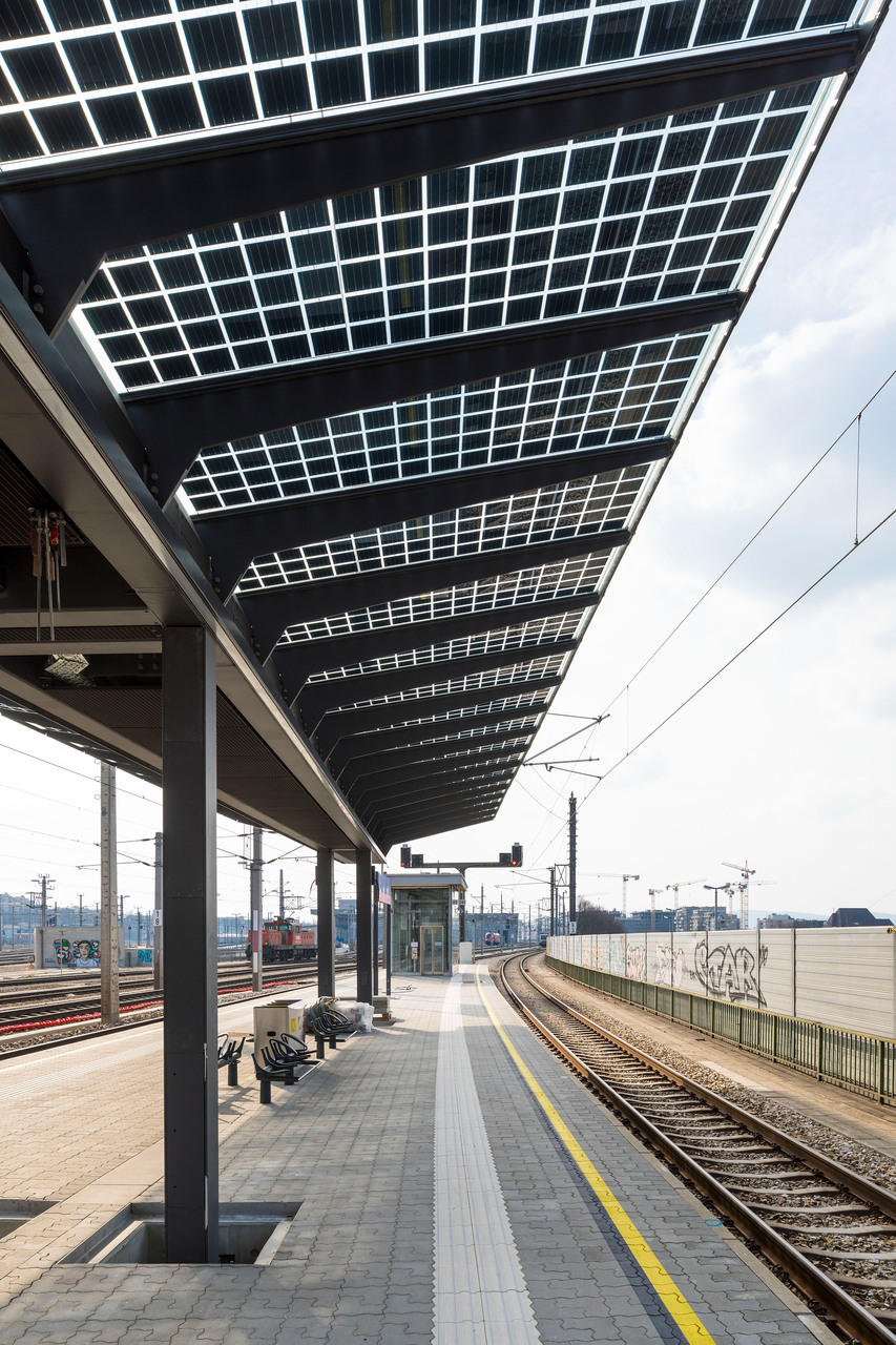 Die Errichtung war mit geringeren Kosten im Vergleich zu Standard-Bahnsteigdächern möglich. Für den Einsatz von PV spricht zudem die Möglichkeit, über Jahre hinweg Energie zu gewinnen – mit einem standardisierten System lässt sich ein enormes Flächenpotenzial auf wirtschaftliche Weise erschließen. (Autor: Achim Geissinger, nach einem Text der Architekten)