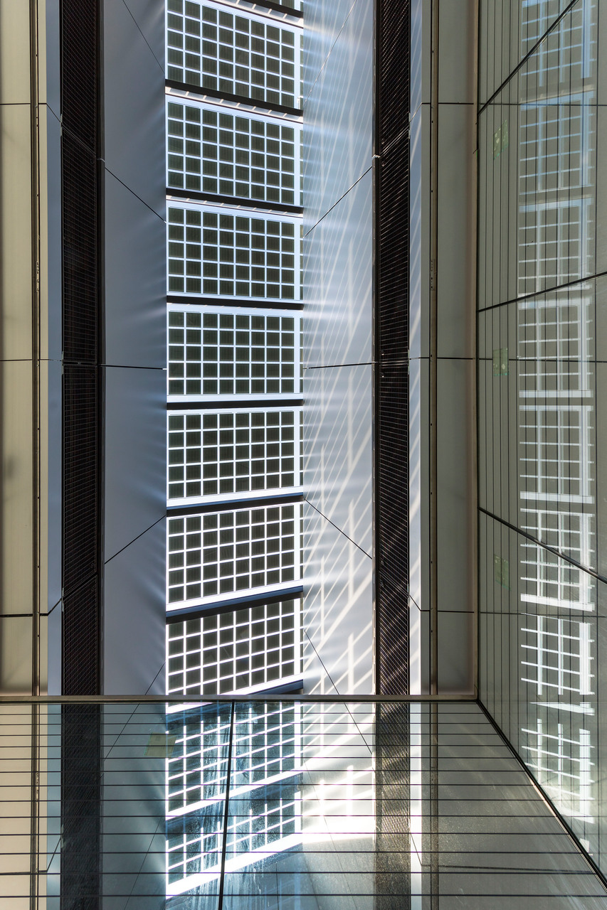 Die dreifachen Glaselemente sind auf Klemmleisten aufgesetzt und demontabel. Auch die Stahlträger und die Blechschwerter, auf denen die Klemmleisten sitzen, lassen sich als verschraubte Konstruktionen einfach zerlegen und wiederverwerten.