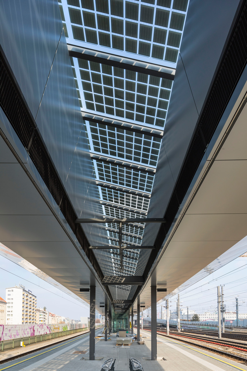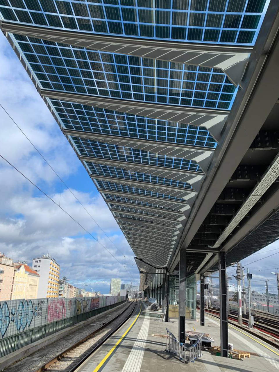 Die PV-Dächer sind Bestandteil des Energiekonzepts der ÖBB und in das Energie-Management-System eingebunden, genauer: an die 50Hz-Niederspannungsverteilanlage direkt unter der Bahnsteiganlage.