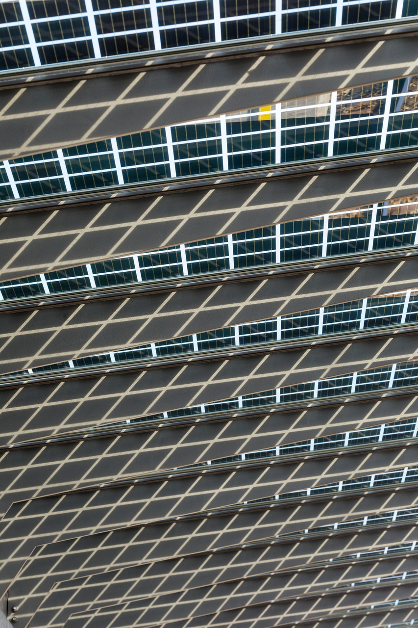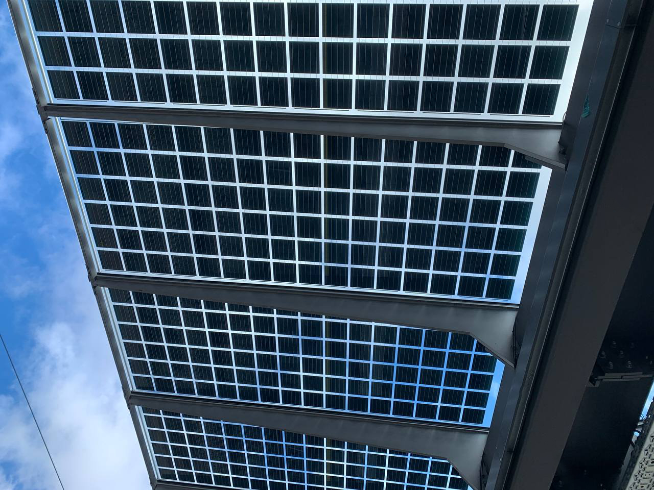 Für die zweiflügeligen PV-Dächer wurden bifaziale, monokristalline PV-Module verwendet. Sie bestehen aus 46 Paneelen von 3,18 x 1,16 m und zwei Paneelen von 2,66 x 1,16 m. Das kompliziertere Oberlicht setzt sich zusammen aus 95 Paneelen mit 2,4 x 1,06 und 19 Paneelen mit 2,4 x 0,07-1,062 m.