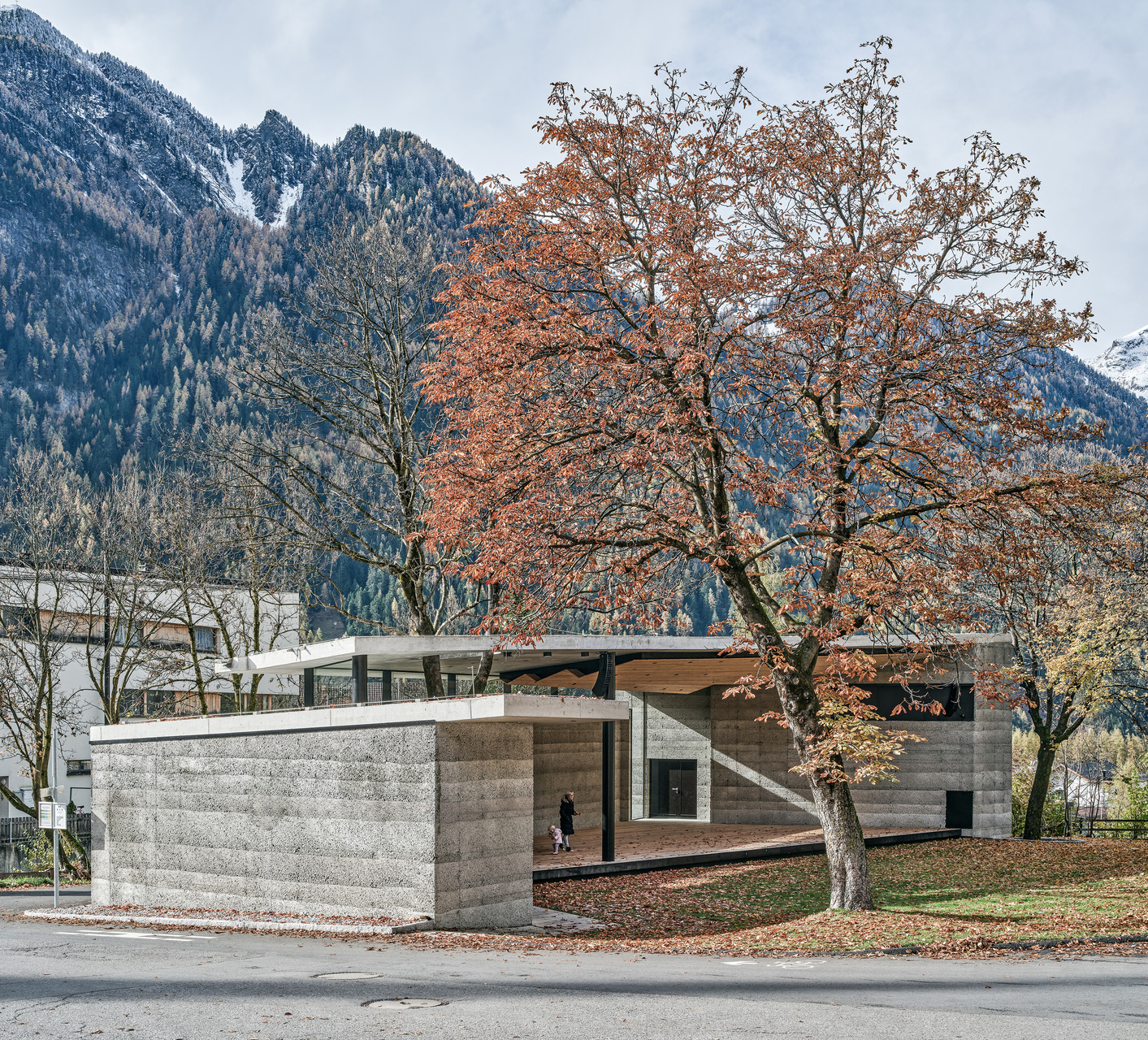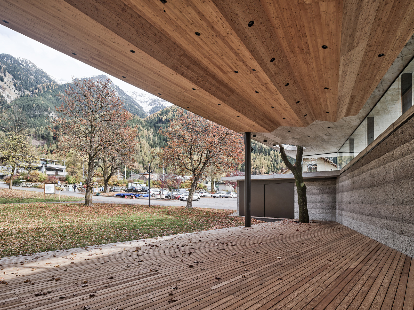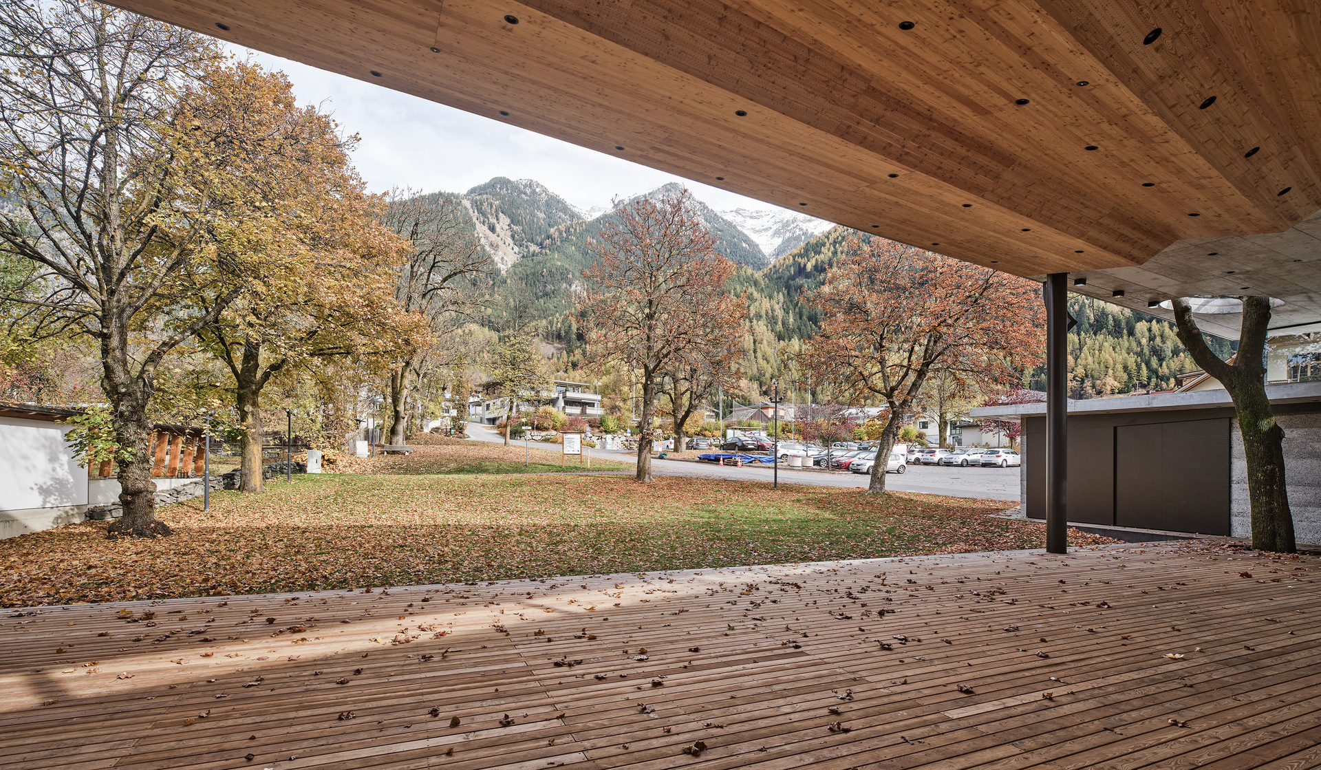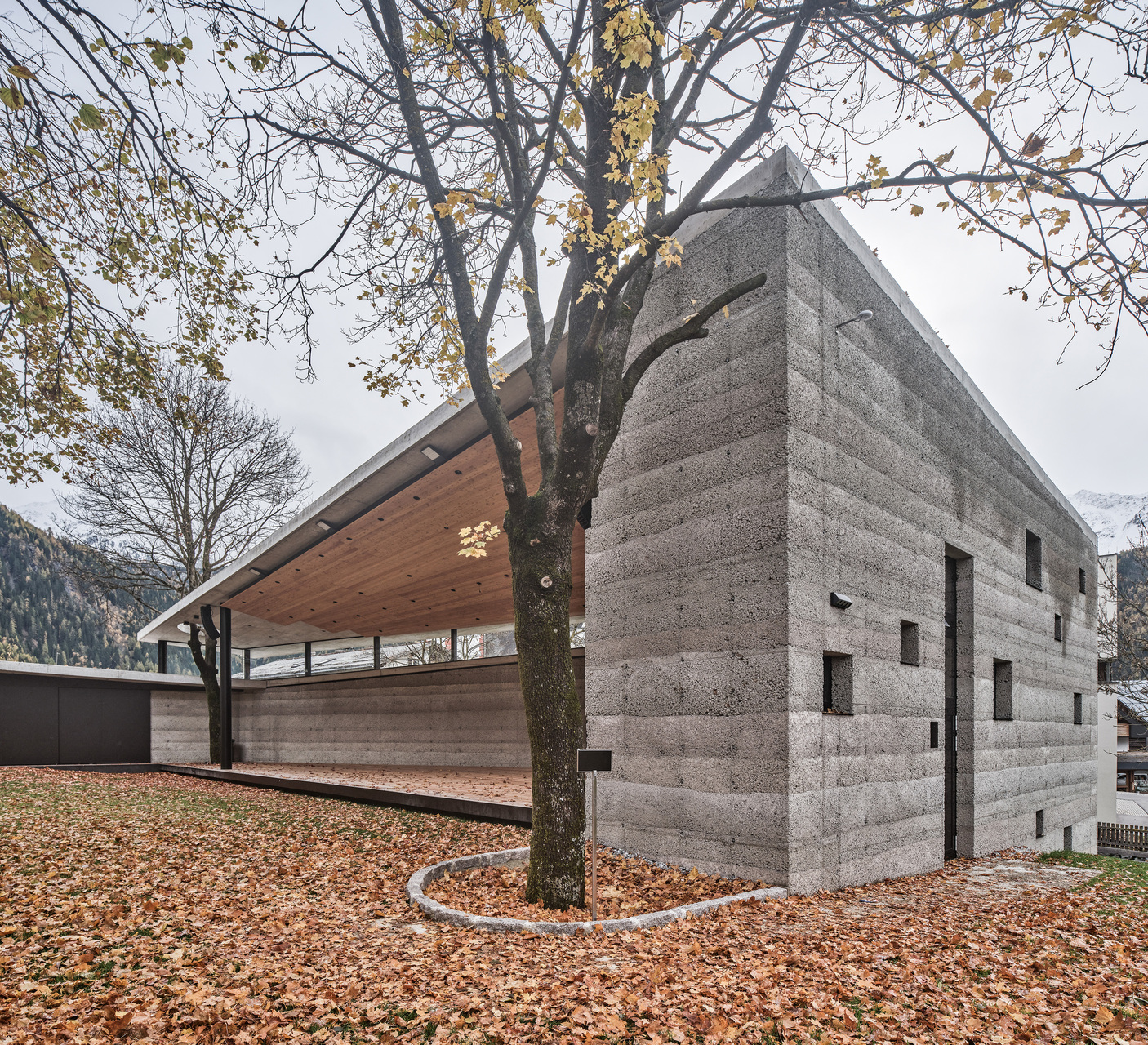 Um den akustischen Anforderungen gerecht zu werden, hängt ein nach Berechnung gefaltetes Holzpaneel unterhalb der Deckenscheibe, aber auch die extreme Offenporigkeit des Betons wirkt sich schalltechnisch positiv aus. Die beiden seitlichen Gebäudeteile bieten Platz für Technik, Lager, Toiletten und Ausschank und lassen sich mit Schwarzstahltüren komplett schließen. In einer von Tourismus und Tradition geprägten Tiroler Gemeinde möchte der Pavillon ein Ort für die Dorfgemeinschaft sein, der die Balance zwischen neuem gestalterischem Akzent und Verbindung mit der gewachsenen Substanz zu halten vermag. (Text: Nicola Weber)