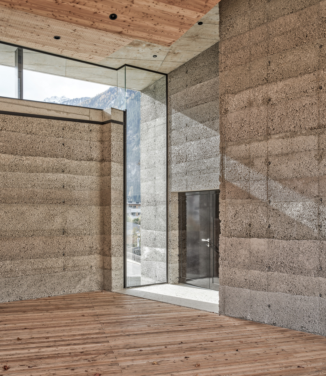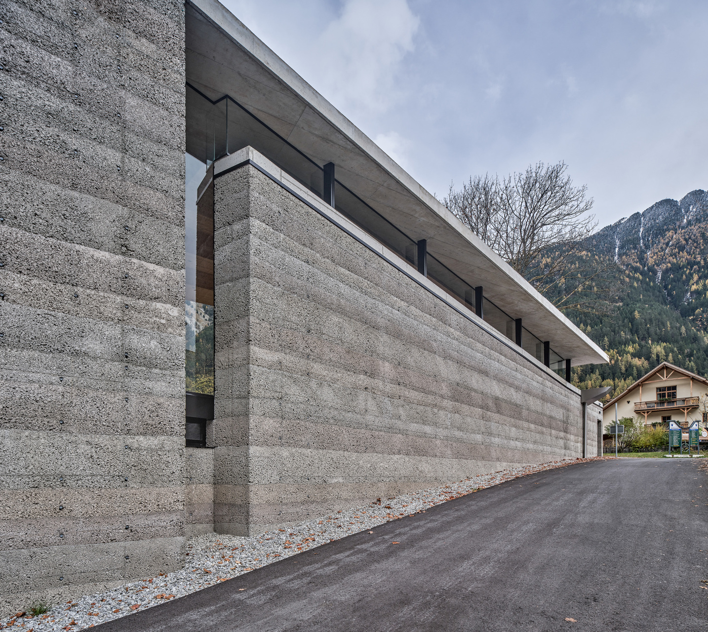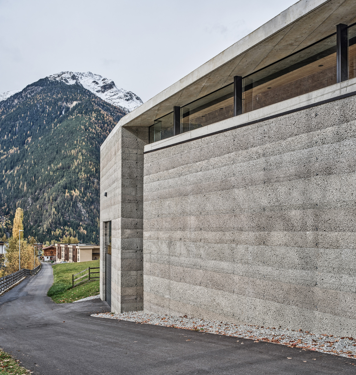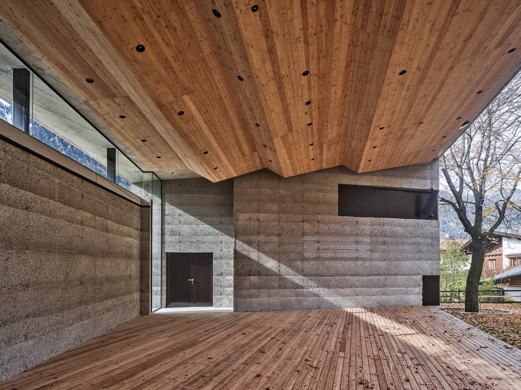 Um den akustischen Anforderungen gerecht zu werden, hängt ein nach Berechnung gefaltetes Holzpaneel unterhalb der Deckenscheibe, aber auch die extreme Offenporigkeit des Betons wirkt sich schalltechnisch positiv aus. Die beiden seitlichen Gebäudeteile bieten Platz für Technik, Lager, Toiletten und Ausschank und lassen sich mit Schwarzstahltüren komplett schließen. In einer von Tourismus und Tradition geprägten Tiroler Gemeinde möchte der Pavillon ein Ort für die Dorfgemeinschaft sein, der die Balance zwischen neuem gestalterischem Akzent und Verbindung mit der gewachsenen Substanz zu halten vermag. (Text: Nicola Weber)