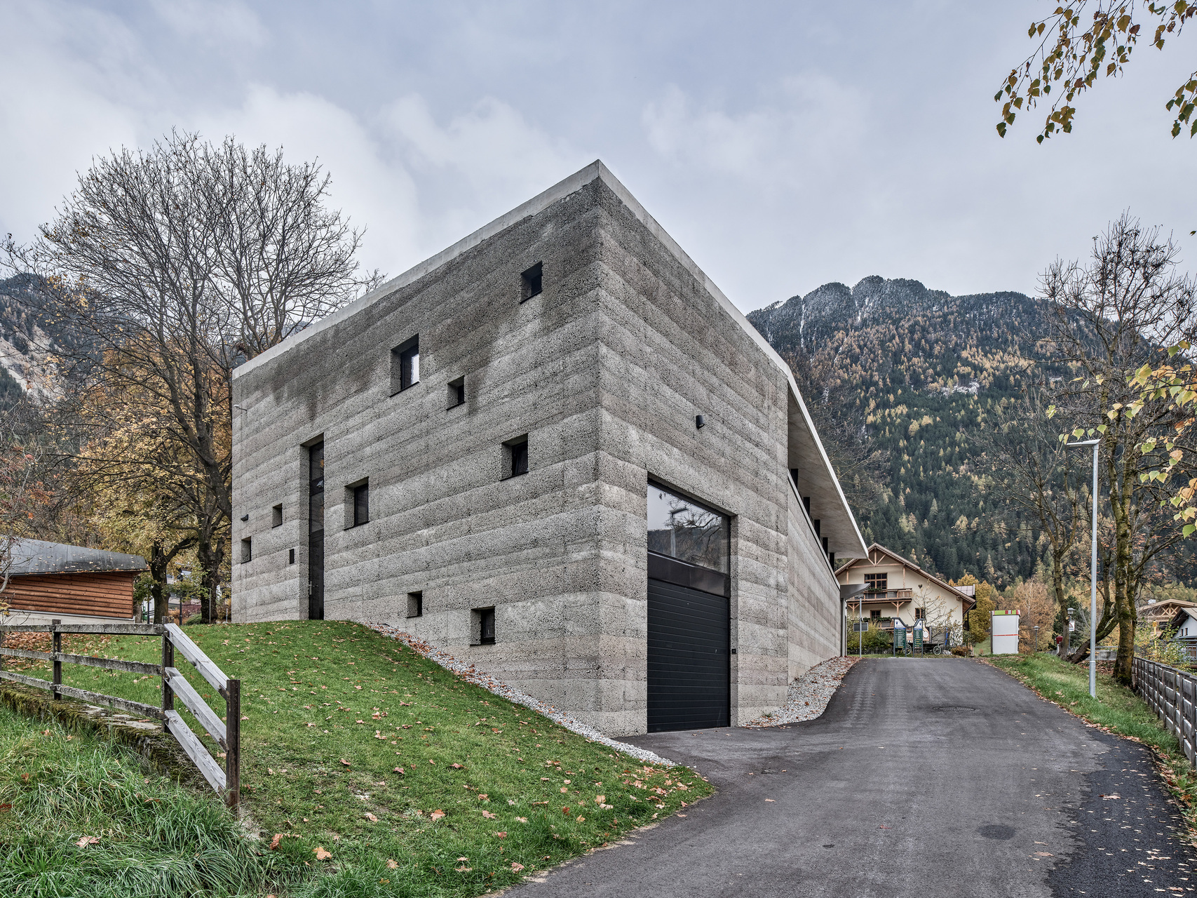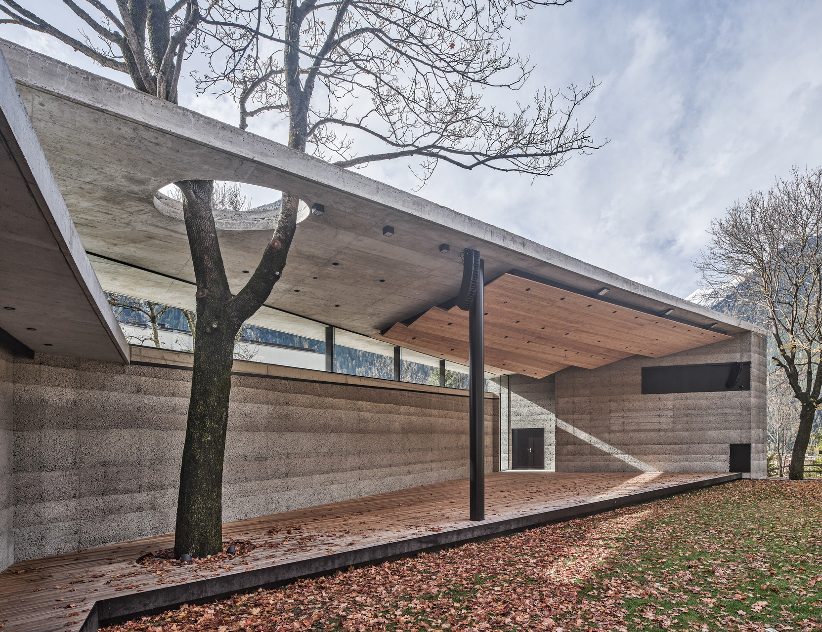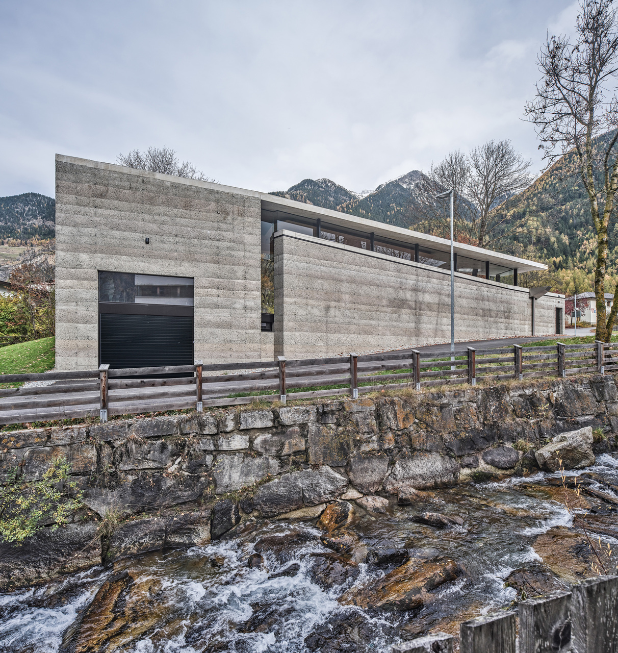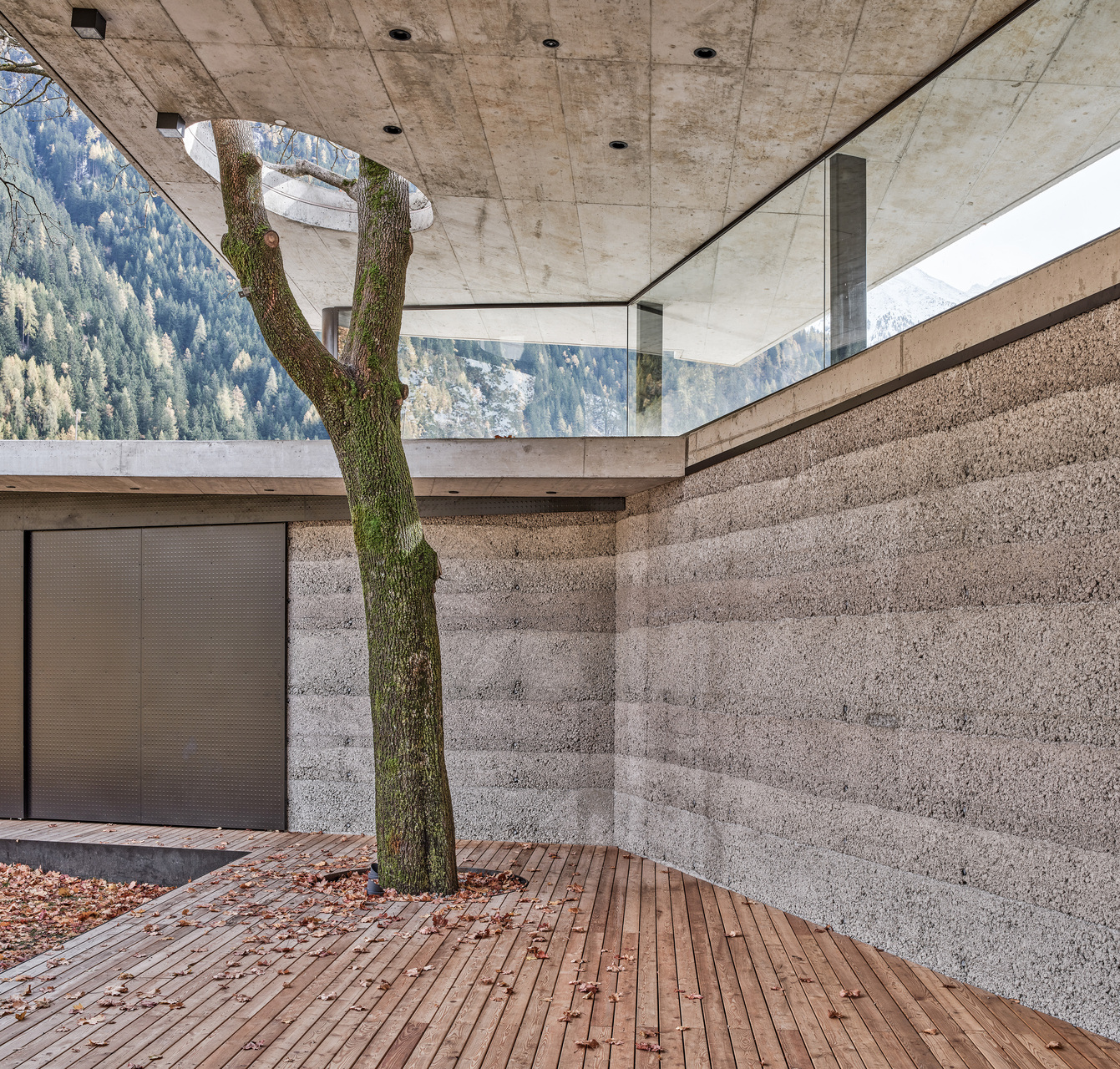 Um den akustischen Anforderungen gerecht zu werden, hängt ein nach Berechnung gefaltetes Holzpaneel unterhalb der Deckenscheibe, aber auch die extreme Offenporigkeit des Betons wirkt sich schalltechnisch positiv aus. Die beiden seitlichen Gebäudeteile bieten Platz für Technik, Lager, Toiletten und Ausschank und lassen sich mit Schwarzstahltüren komplett schließen. In einer von Tourismus und Tradition geprägten Tiroler Gemeinde möchte der Pavillon ein Ort für die Dorfgemeinschaft sein, der die Balance zwischen neuem gestalterischem Akzent und Verbindung mit der gewachsenen Substanz zu halten vermag. (Text: Nicola Weber)