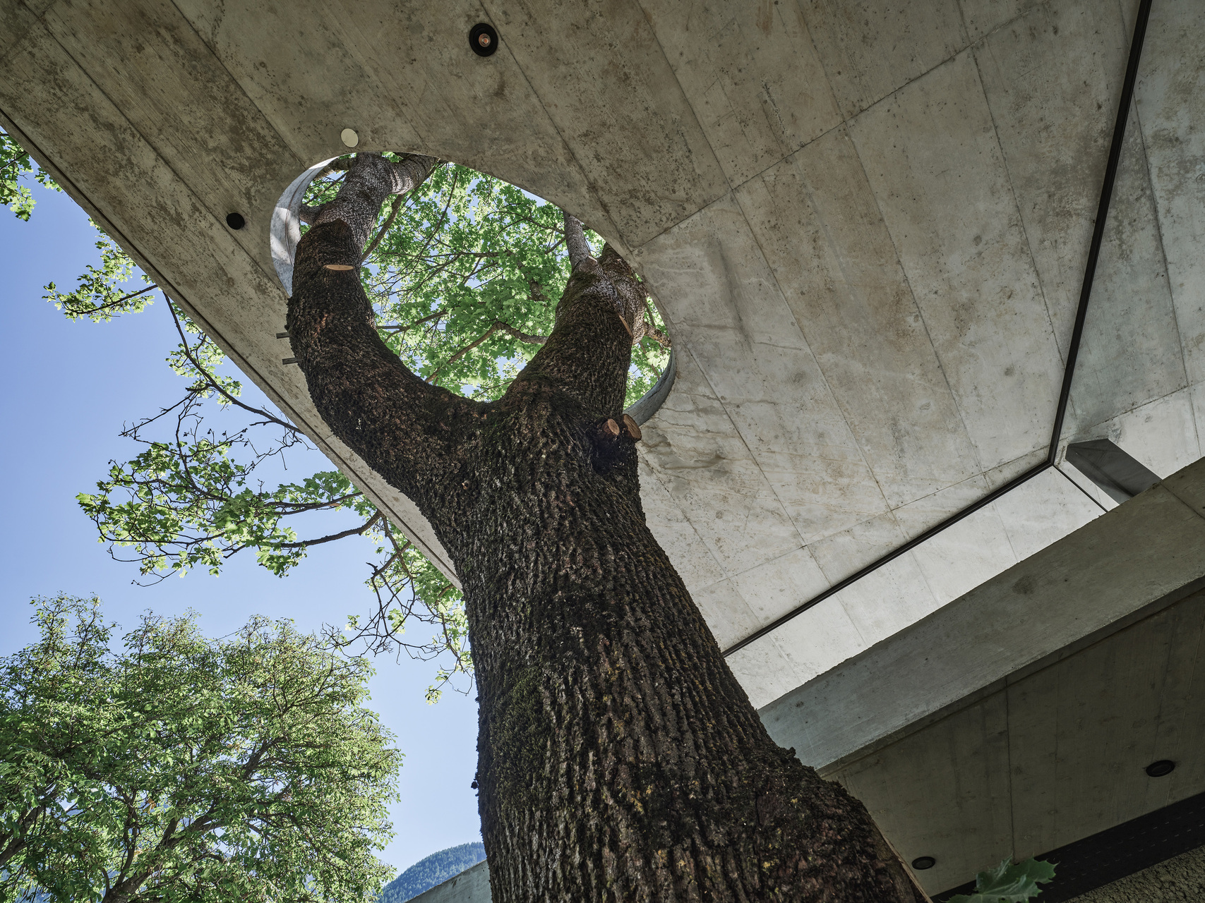 Der neue Pavillon liegt in Sichtweite der Kirche, ein wenig abseits des Hauptplatzes und nimmt in seiner Positionierung bewusst Rücksicht auf den alten Baumbestand. Eine langgezogene Wand und zwei seitliche Schenkel erzeugen eine schützende Raumsituation und schotten den Platz zum südlich vorbeifließenden Dorfbach hin ab. Das leicht zum Wasser abfallenden Gelände bildet von selbst bereits eine sanfte Tribüne. Mit Bestuhlung nimmt diese bis zu 200 Besucher:innen für verschiedene dörfliche Feste auf, vom Platzkonzert bis zur Firmungsfeier, ansonsten ist sie einfach eine schattige Wiese auf die durch Schlitze zwischen den Wandscheiben stimmungsvoll das Licht fällt. Die Stärke der Deckenplatte konnte trotz Spannweiten von bis zu 15,80 Metern auf schlanke 30 cm minimiert werden – über die Diagonale leicht abfallend überspannt sie nun filigran die Bühne auf bis zu sechs Metern Höhe und lässt eine Öffnung für einen bestehenden Baum frei.