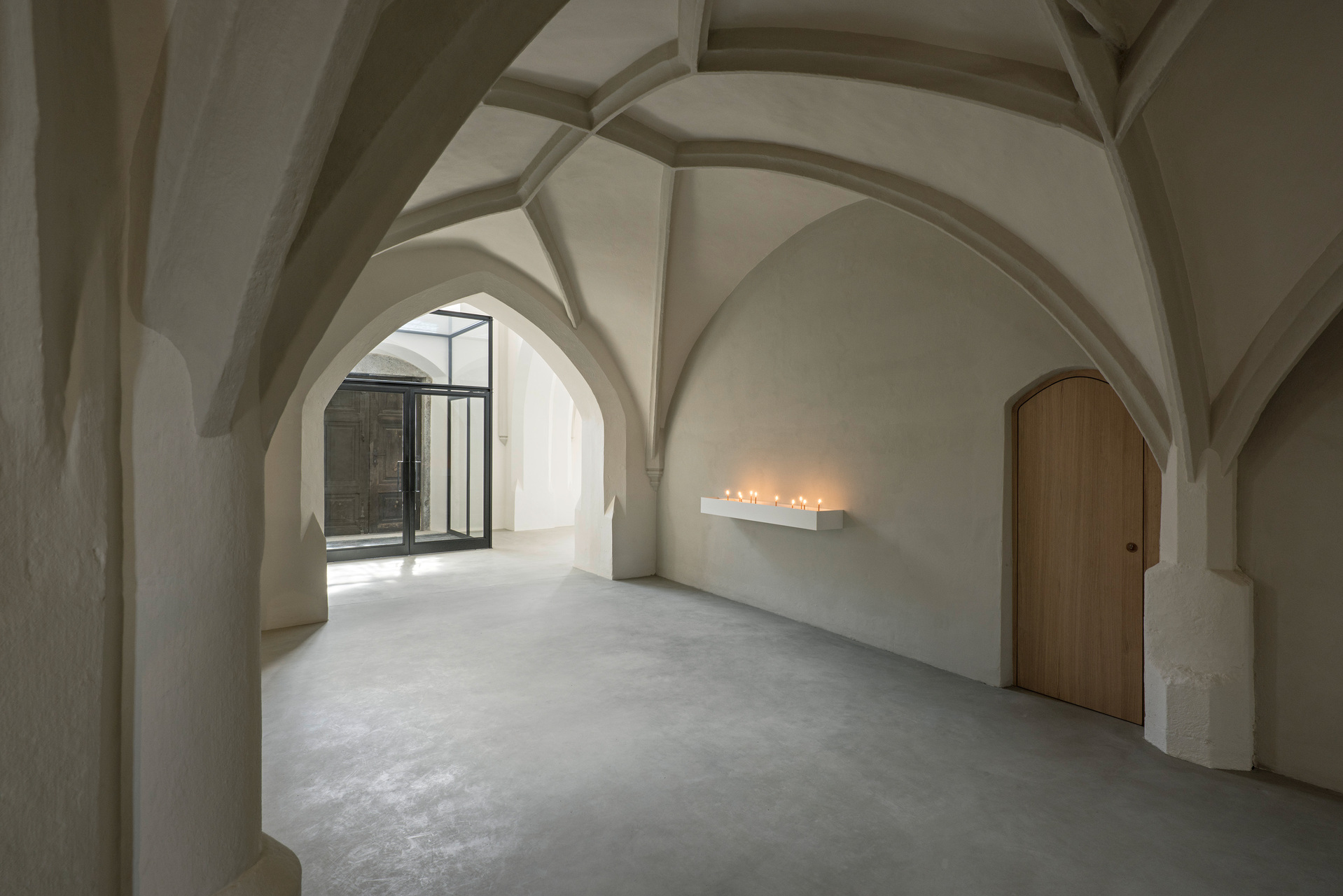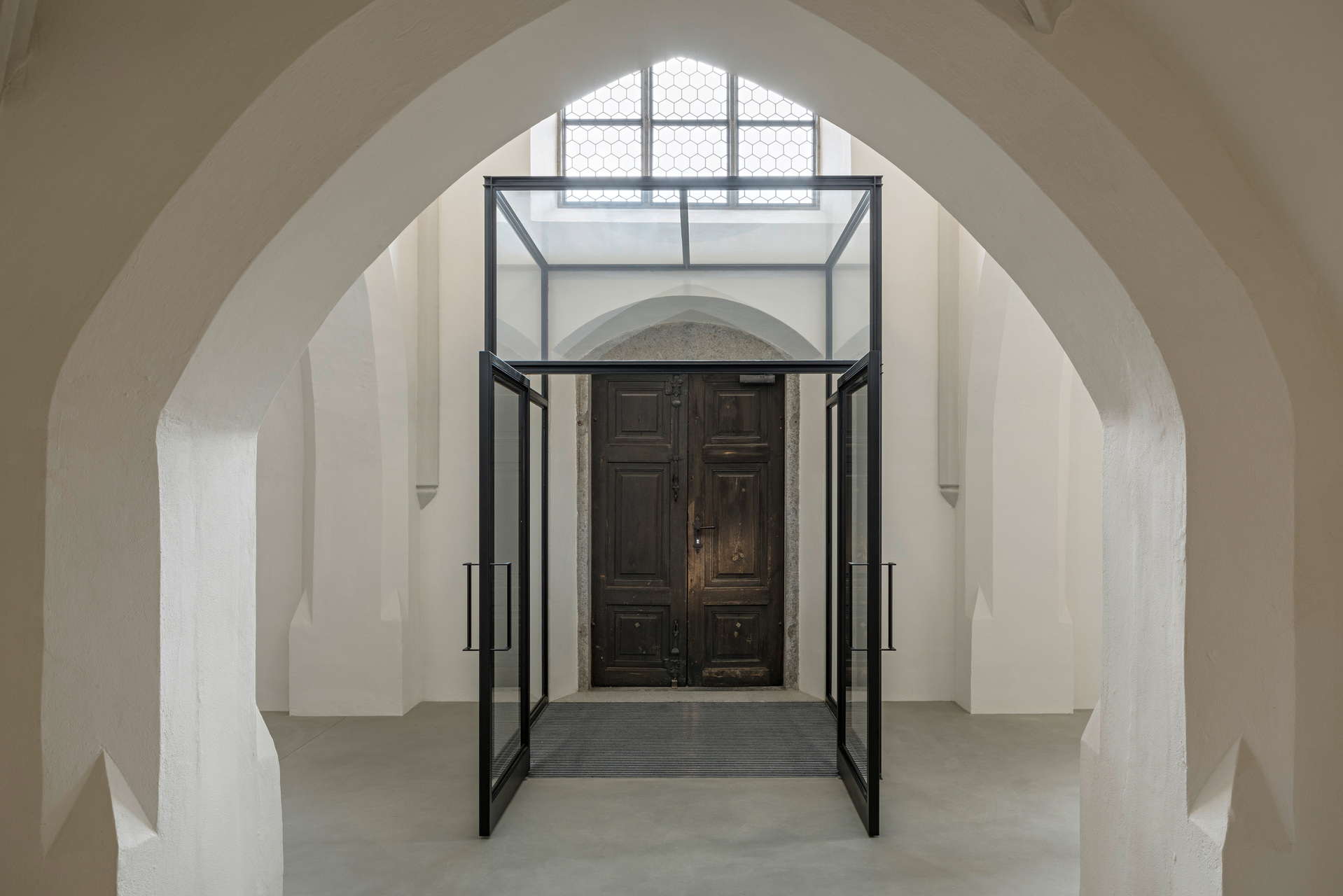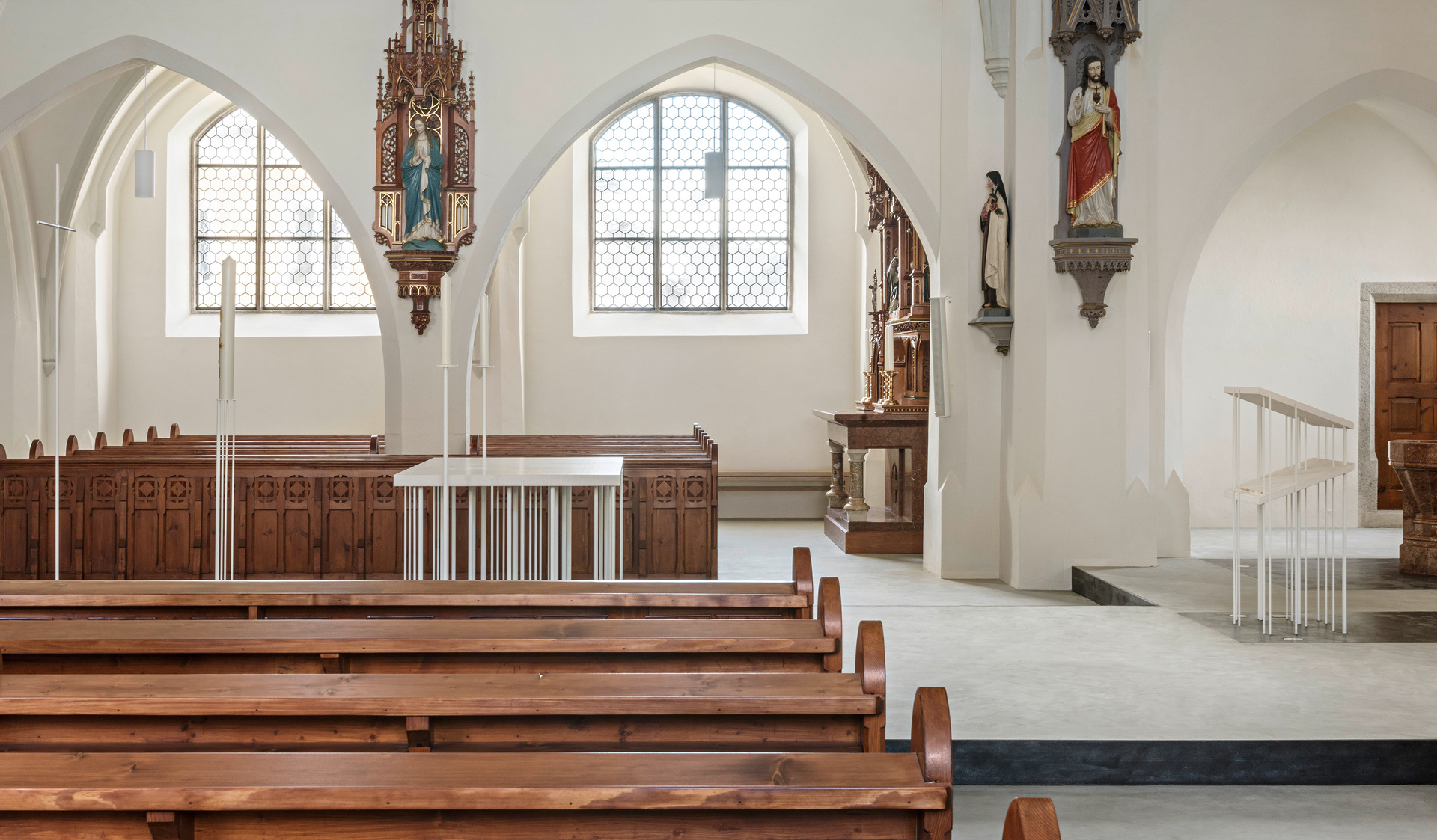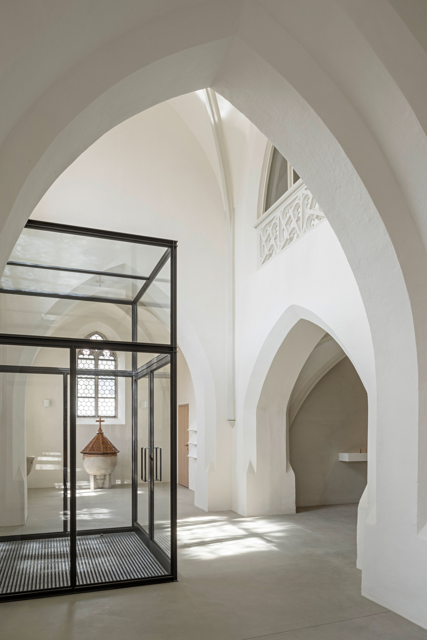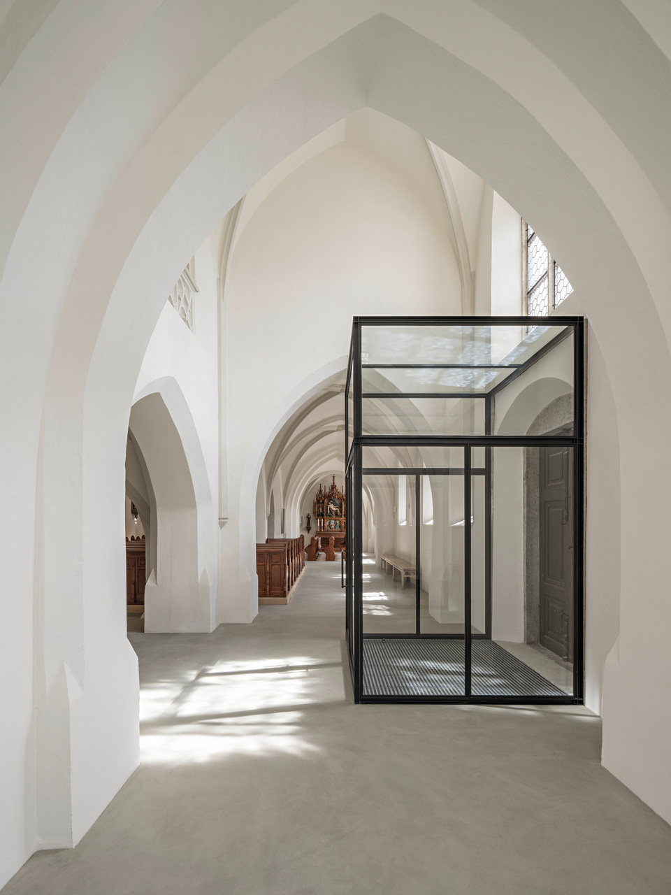 Um die verschiedenen Räume der Kirche wieder stärker miteinander in Verbindung zu bringen, wurden die Abtrennungen von den Eingängen entfernt. Direkt hinter den massiven Holzeingangstüren wurden stattdessen zwei leichte Stahl-Glas-Konstruktionen als Windfänge gestaltet, die den Luftzug unterbinden und dennoch den Blick ins Kirchenschiff offenhalten. Die Bänke wurden in ihrer Zahl verringert, anders gruppiert und um neu entworfene, flexible Bänke für die Seitenschiffe ergänzt. Unter der Empore entstand ein ruhiger Raum, um vor den Opferkerzen oder am Objekt für Lebensbewegungen zu verweilen. Die Wände sind hier ein wenig dunkler gestaltet, um diesen Bereich als eigenen Raum mit besonderer Funktion hervorzuheben. (Text: Tobias Hagleitner, nach einem Text der Architekt:innen)