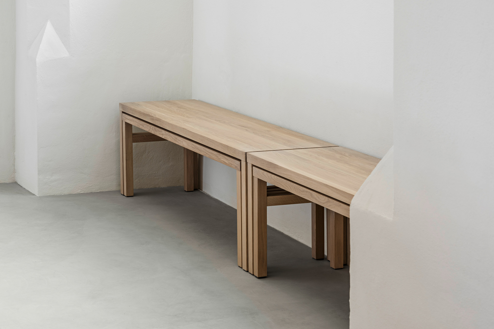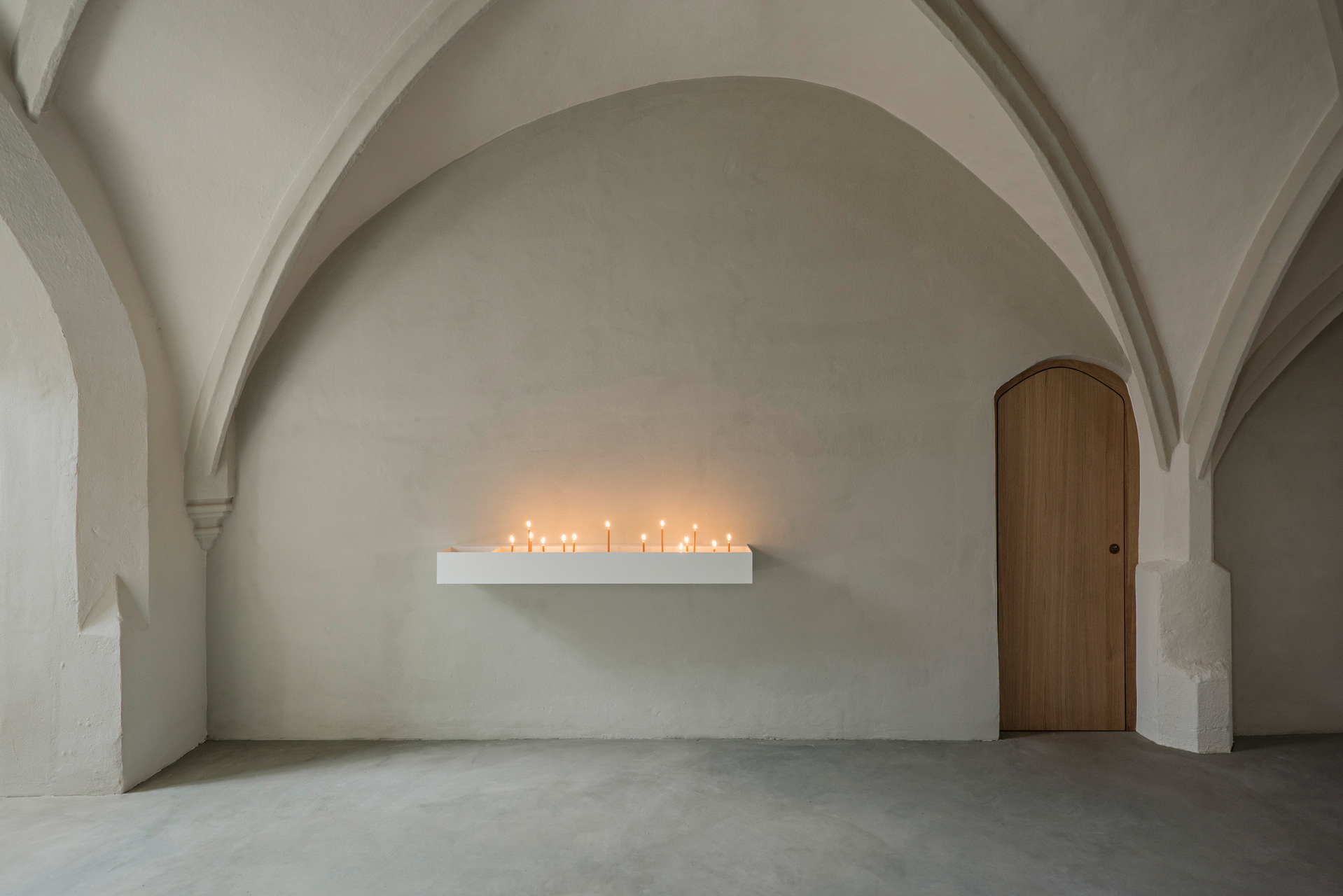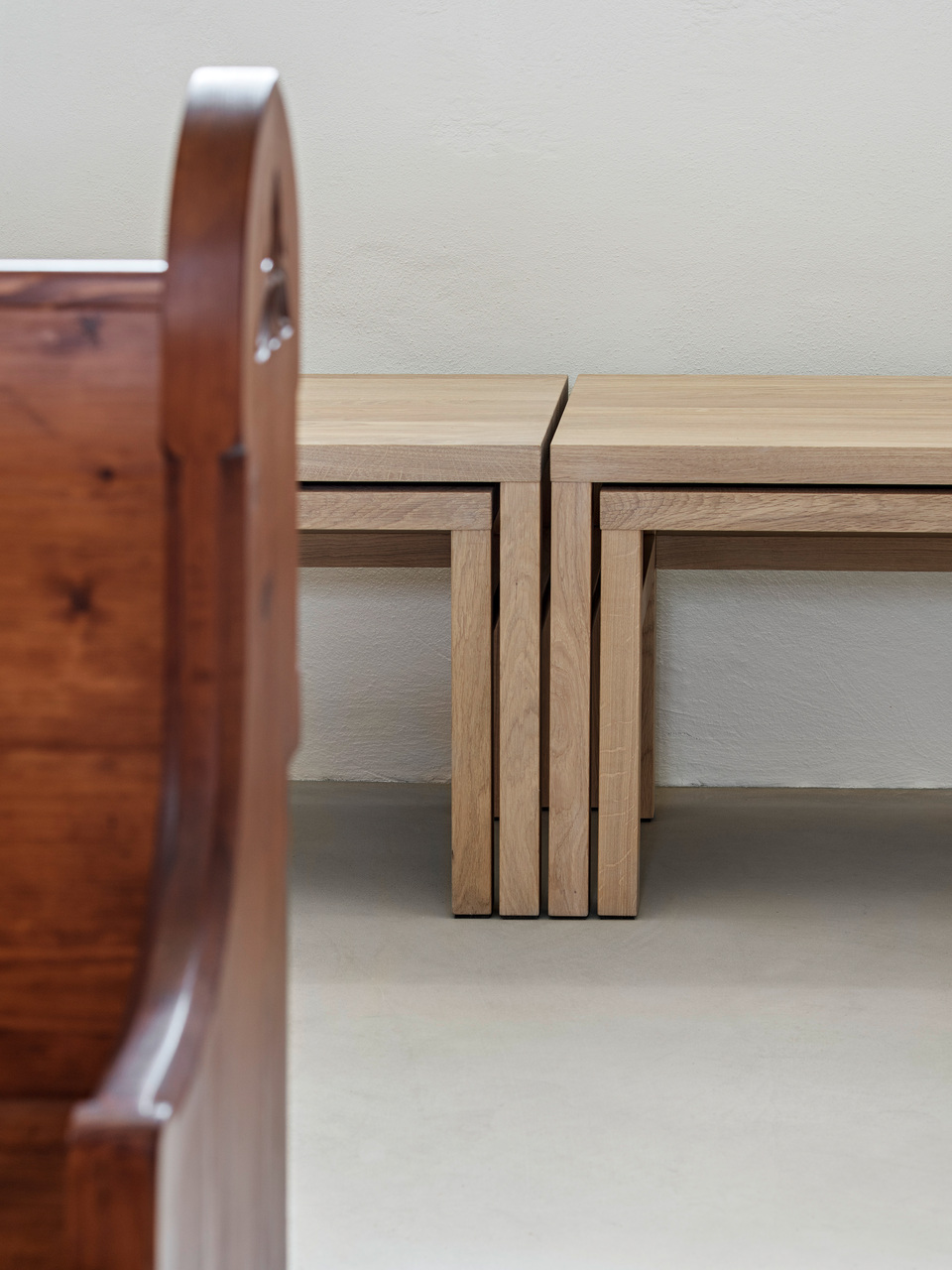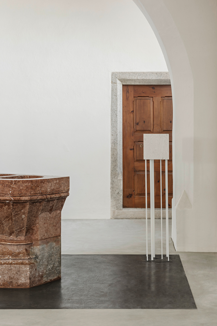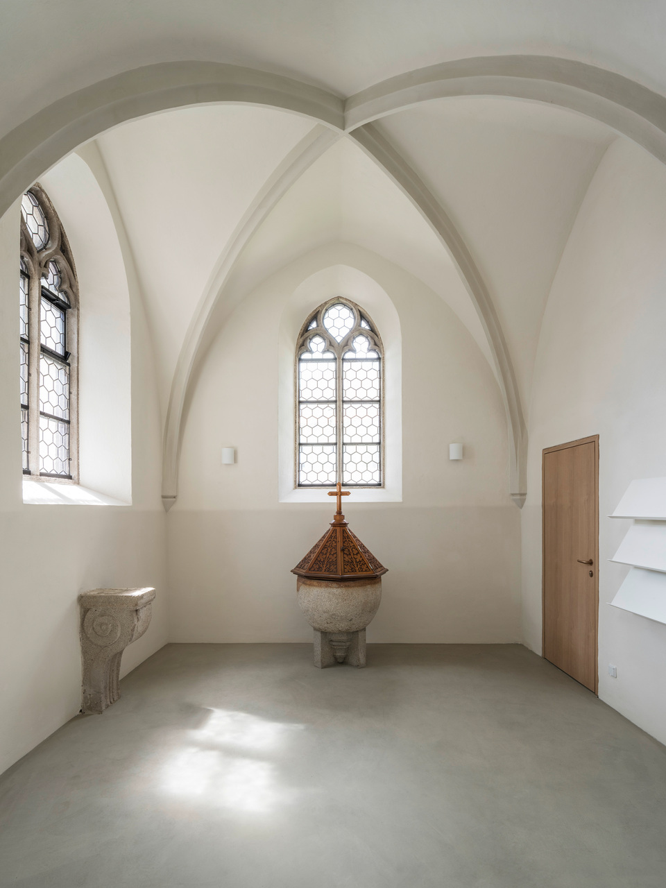 Um die verschiedenen Räume der Kirche wieder stärker miteinander in Verbindung zu bringen, wurden die Abtrennungen von den Eingängen entfernt. Direkt hinter den massiven Holzeingangstüren wurden stattdessen zwei leichte Stahl-Glas-Konstruktionen als Windfänge gestaltet, die den Luftzug unterbinden und dennoch den Blick ins Kirchenschiff offenhalten. Die Bänke wurden in ihrer Zahl verringert, anders gruppiert und um neu entworfene, flexible Bänke für die Seitenschiffe ergänzt. Unter der Empore entstand ein ruhiger Raum, um vor den Opferkerzen oder am Objekt für Lebensbewegungen zu verweilen. Die Wände sind hier ein wenig dunkler gestaltet, um diesen Bereich als eigenen Raum mit besonderer Funktion hervorzuheben. (Text: Tobias Hagleitner, nach einem Text der Architekt:innen)