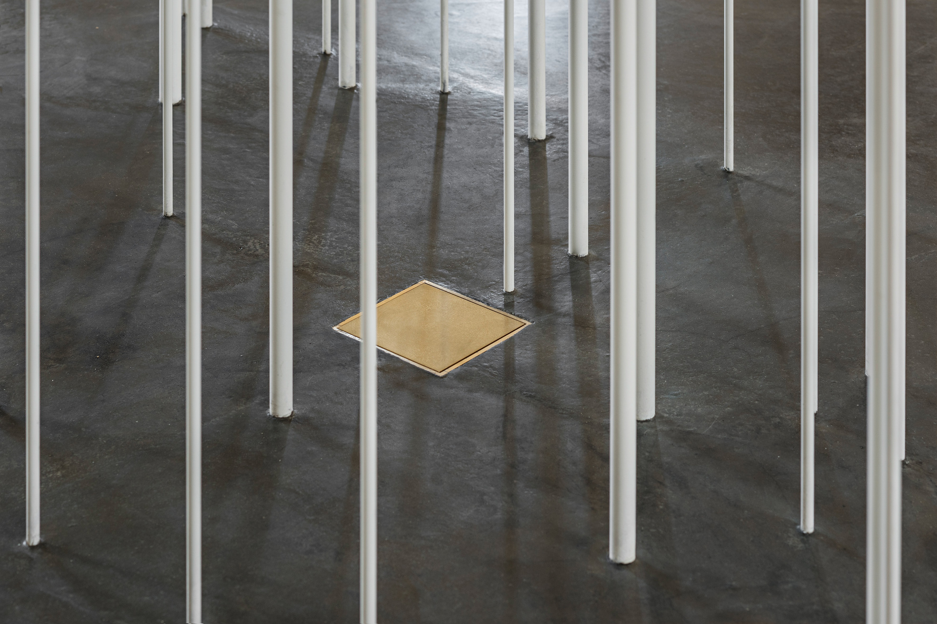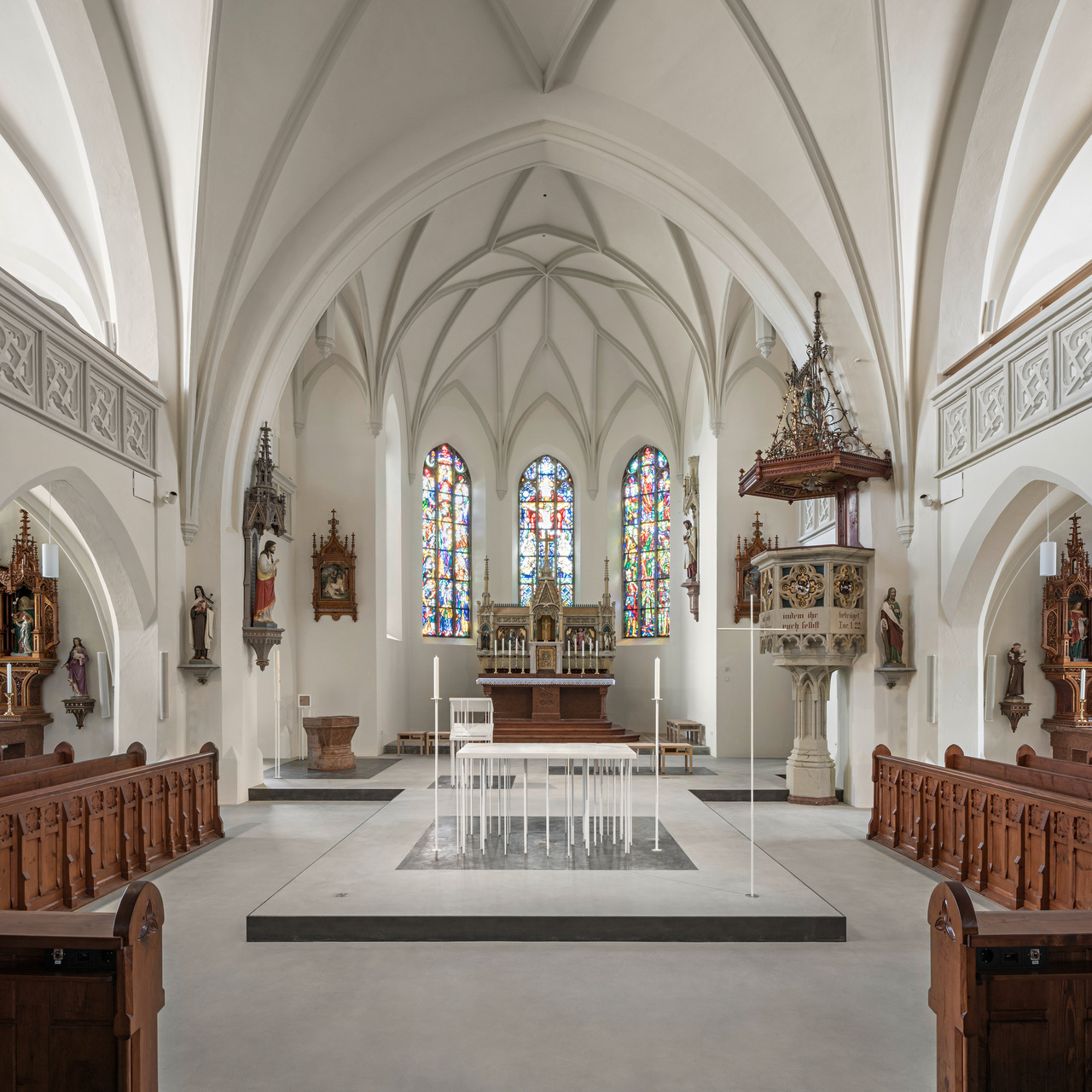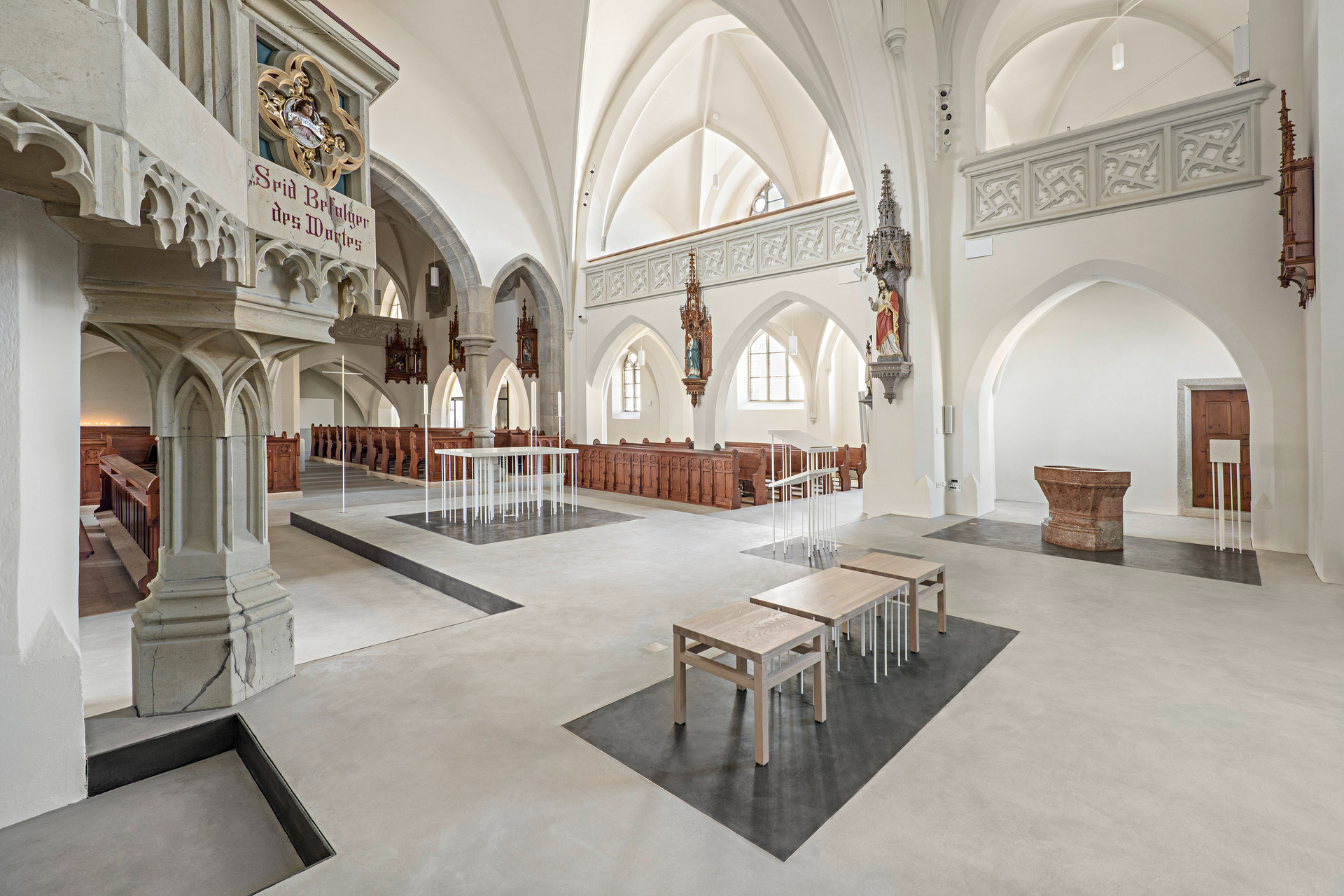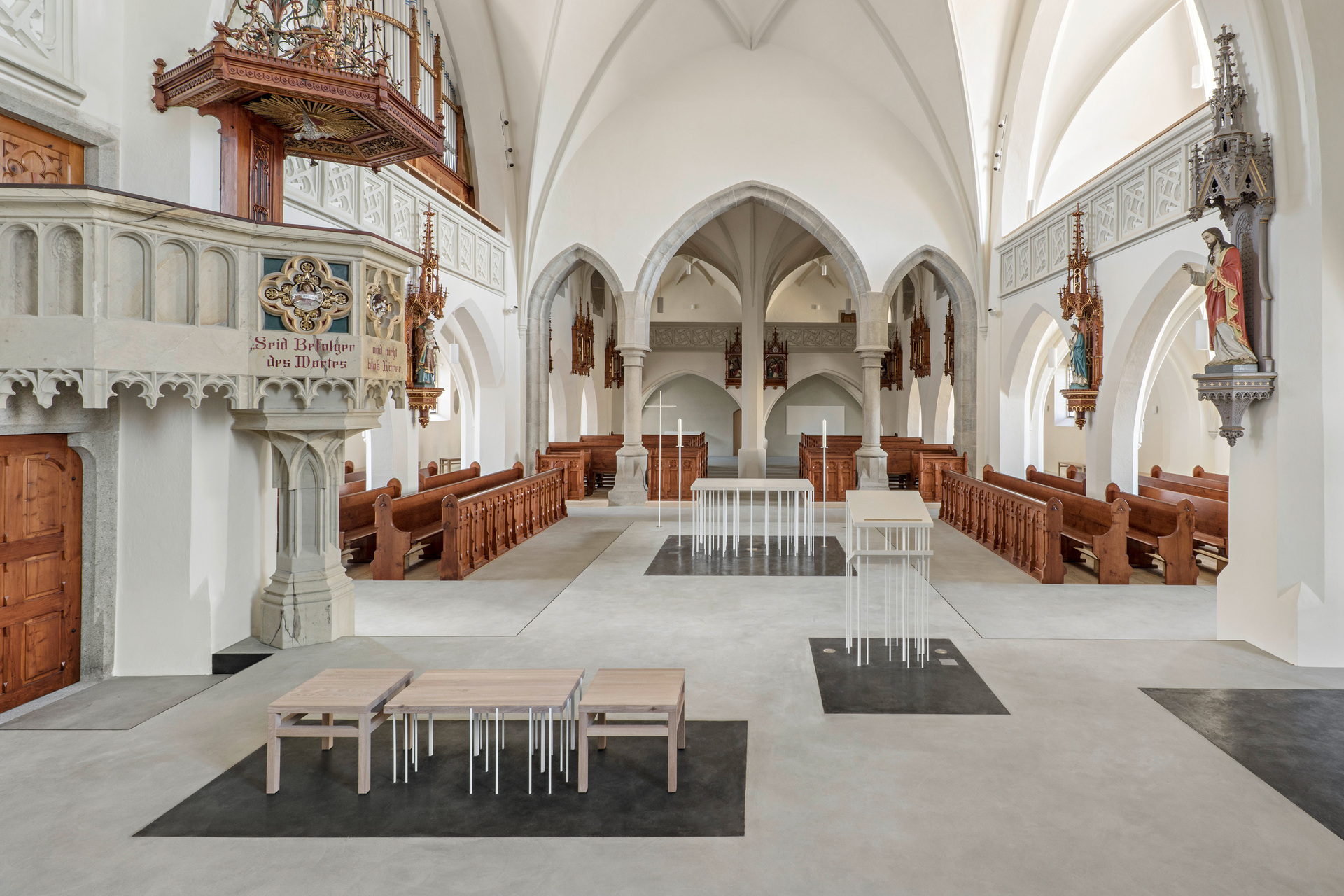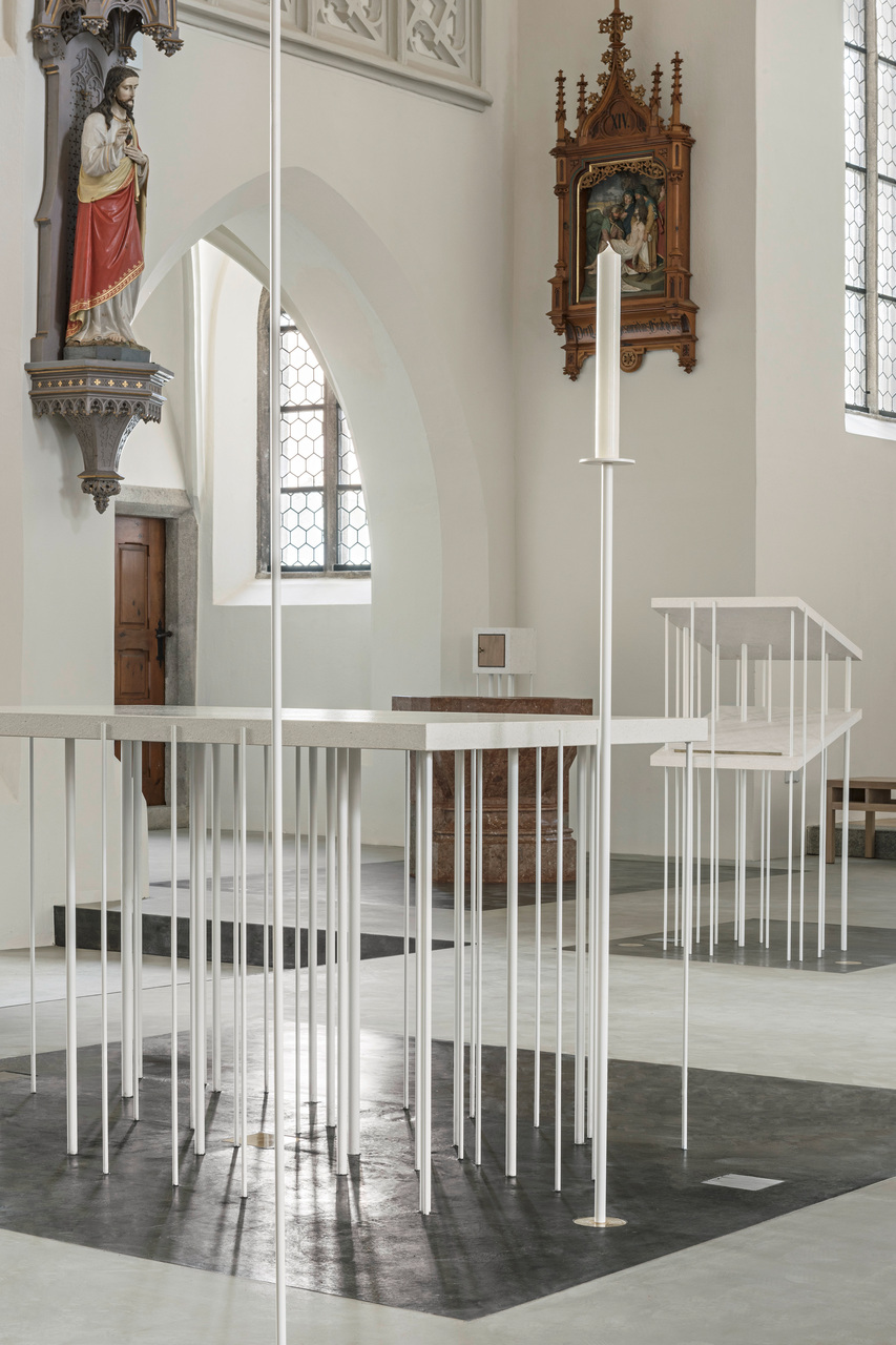 Altar, Ambo, Vorstehersitz und Taufort bilden, eine Stufe höher und im selben Bodenbelag wie das Hauptschiff, eine durchgehende Ebene. Als weit in den Kirchenraum ragende „Zunge“ wird diese Fortsetzung des Altarraums von einem schwebenden Stahlwinkel abgehoben und umrandet. Wiederkehrendes Element der liturgischen Objekte sind die tragenden Rundstäbe aus Metall, die das gotisch inspirierte Prinzip der konstruktiven Zartheit aufnehmen. Die Positionen der Stäbe beziehen sich auf bestimmte Punkte im Grundriss der Kirche, auf Säulen, Eckpfeiler und andere wichtige Elemente. Alle Objekte stehen jeweils auf einer Fläche aus gegossenem, dunklem Zement, abgeschlossen von einer Messingleiste. Bodenbelag, Stäbe und Kalksteinplatten definieren in ihrem gestalterischen Zusammenhang Objekt und Aktionsraum zugleich.
