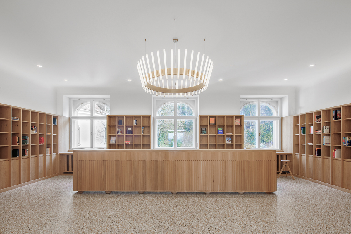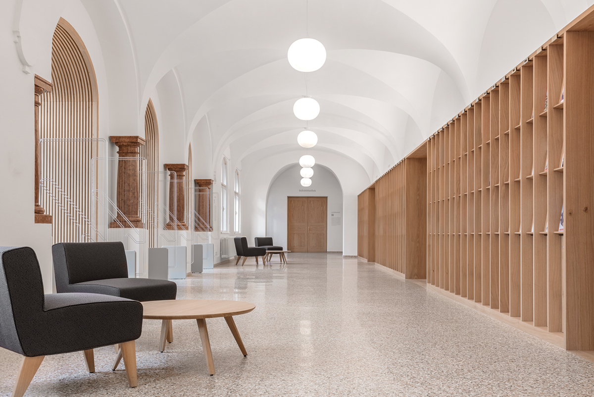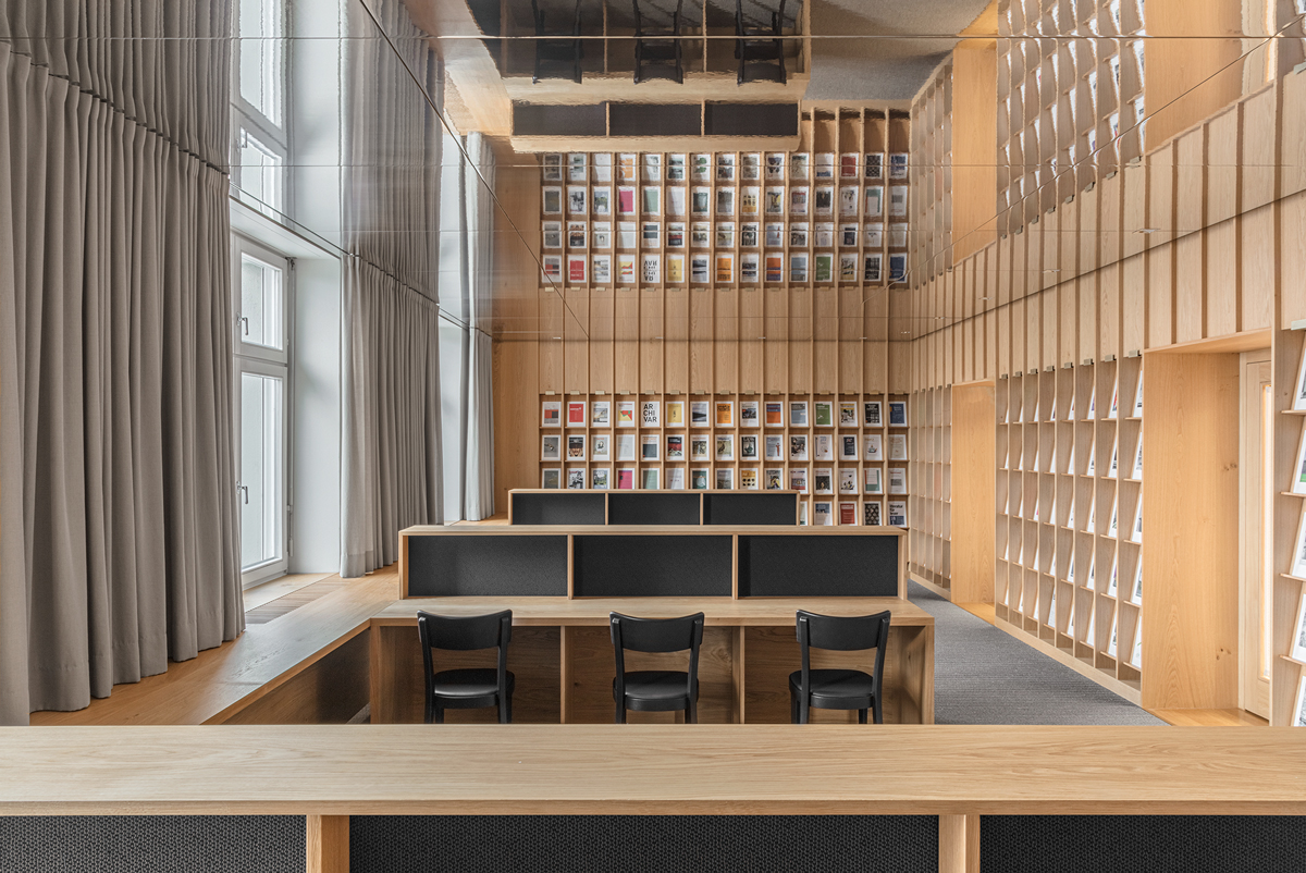 Eine verspiegelte Decke lädt im neuen Lesesaal im ersten Stock des Mitteltraktes zum Lernen und Studieren ein. Die Regale an den Wänden können viele wissenschaftliche Zeitschriften aufnehmen. Weiters wurden vier komfortable Arbeitsräume für kooperatives Lernen in der Kleingruppe eingerichtet, die kostenlos online buchbar und mit WLAN und Smartboards ausgestattet sind. (Text: Isabella Marboe, nach einem Text der Architekten)