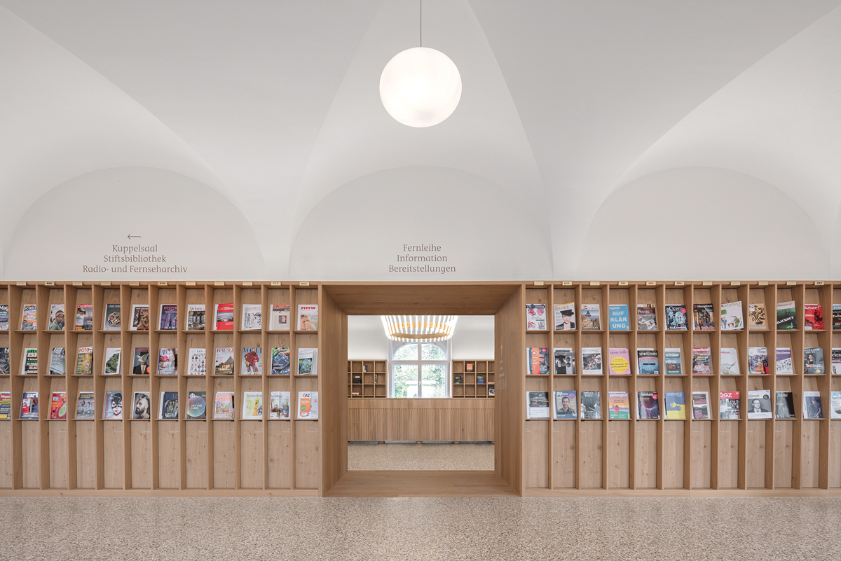 Im Eingangsbereich und großen Teilen des Erdgeschosses im Hauptgebäude erfolgten umfassende Umbau- und Adaptierungsmaßnahmen. Es gibt nun eine moderne Infothek mit Rechercheplätzen, Backofficebereichen sowie einer attraktiven Kommunikationszone. Der neue Zugang ins Gebäude und zum Kuppelsaal verbessern die Orientierbarkeit für die Besucherinnen und Besucher deutlich.