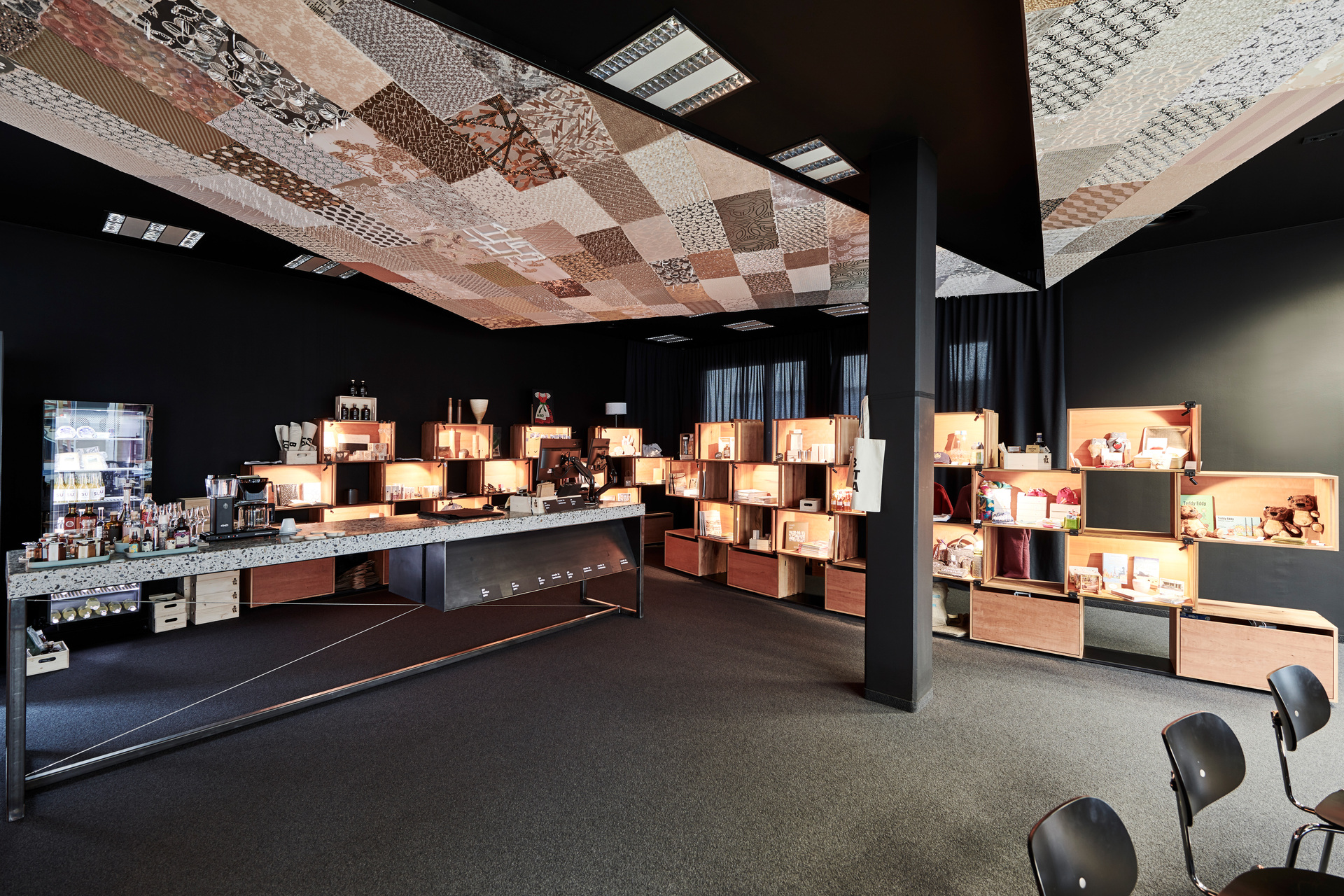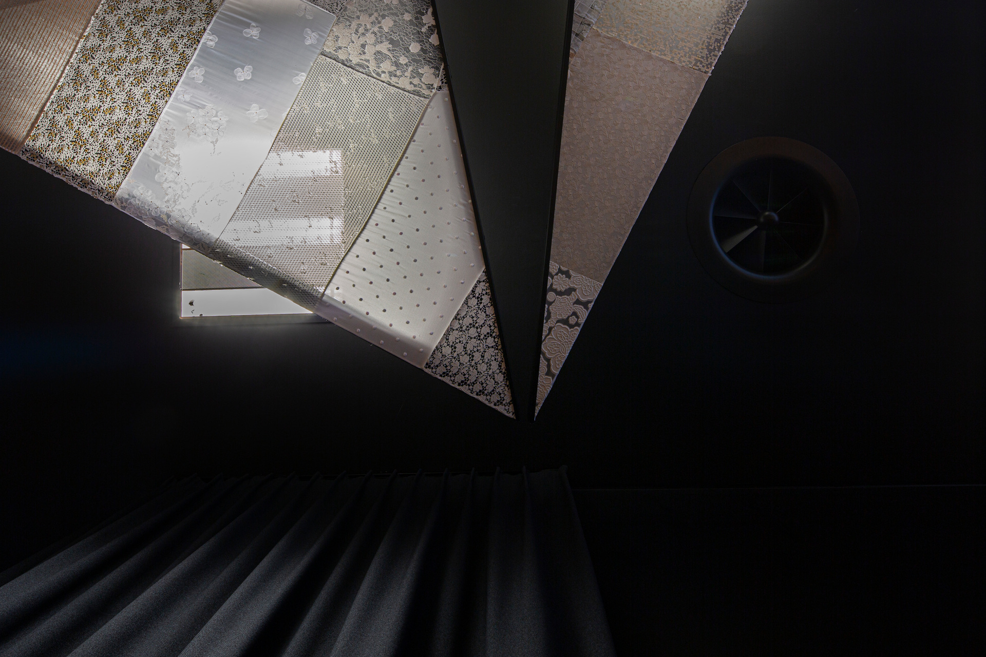 Alle Maßnahmen im BOTTA-Shop sind flexibel und reversibel, damit er am Ende des Mietverhältnisses problemlos umziehen kann. Durch die Glasfassade überblickt man den ganzen Laden, er ist selbst das Objekt im Schaufenster. Wenige, gezielte Maßnahmen genügen. Wände, Boden, Decke und Stützen sind schwarz gestrichen, an der Decke zwei riesige, dreieckige Segel angebracht. Sie sind Patchworks aus Musterbüchern der Lustenauer Stickerei Hofer-Hecht. Jedes Textil ist mit dem Ort verwoben, erzählt eine Geschichte und stiftet Identität. Die Segel sind akustisch wirksam und dimmen die bestehende Beleuchtung.