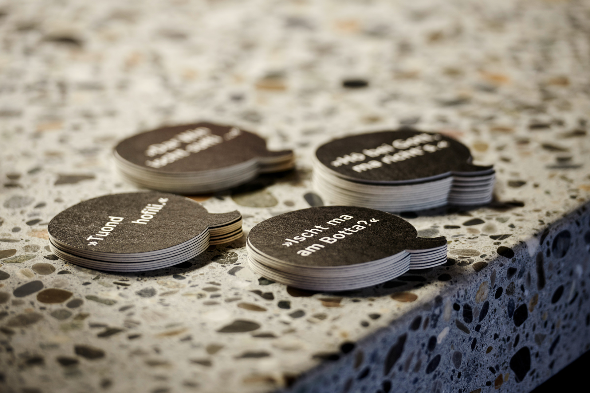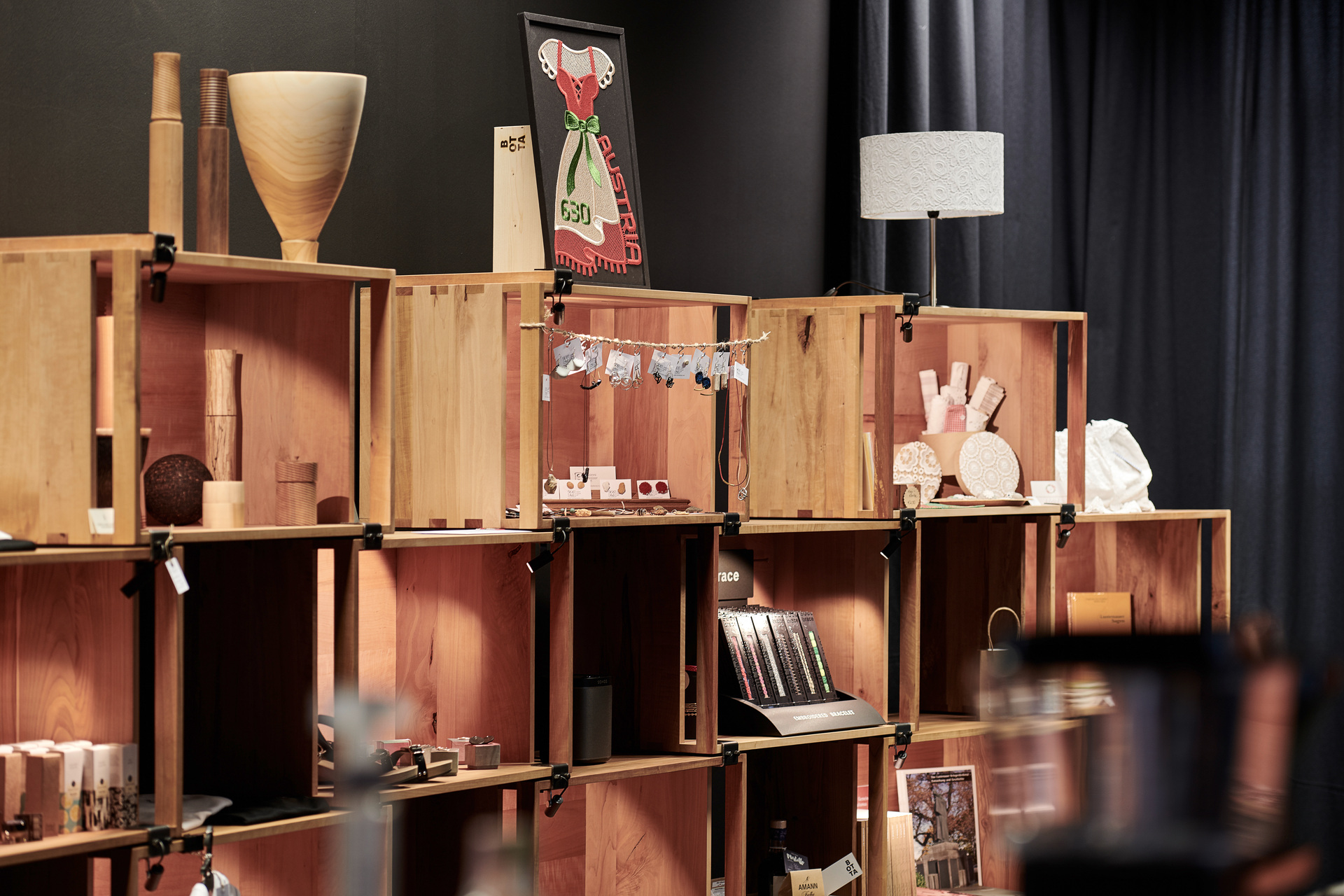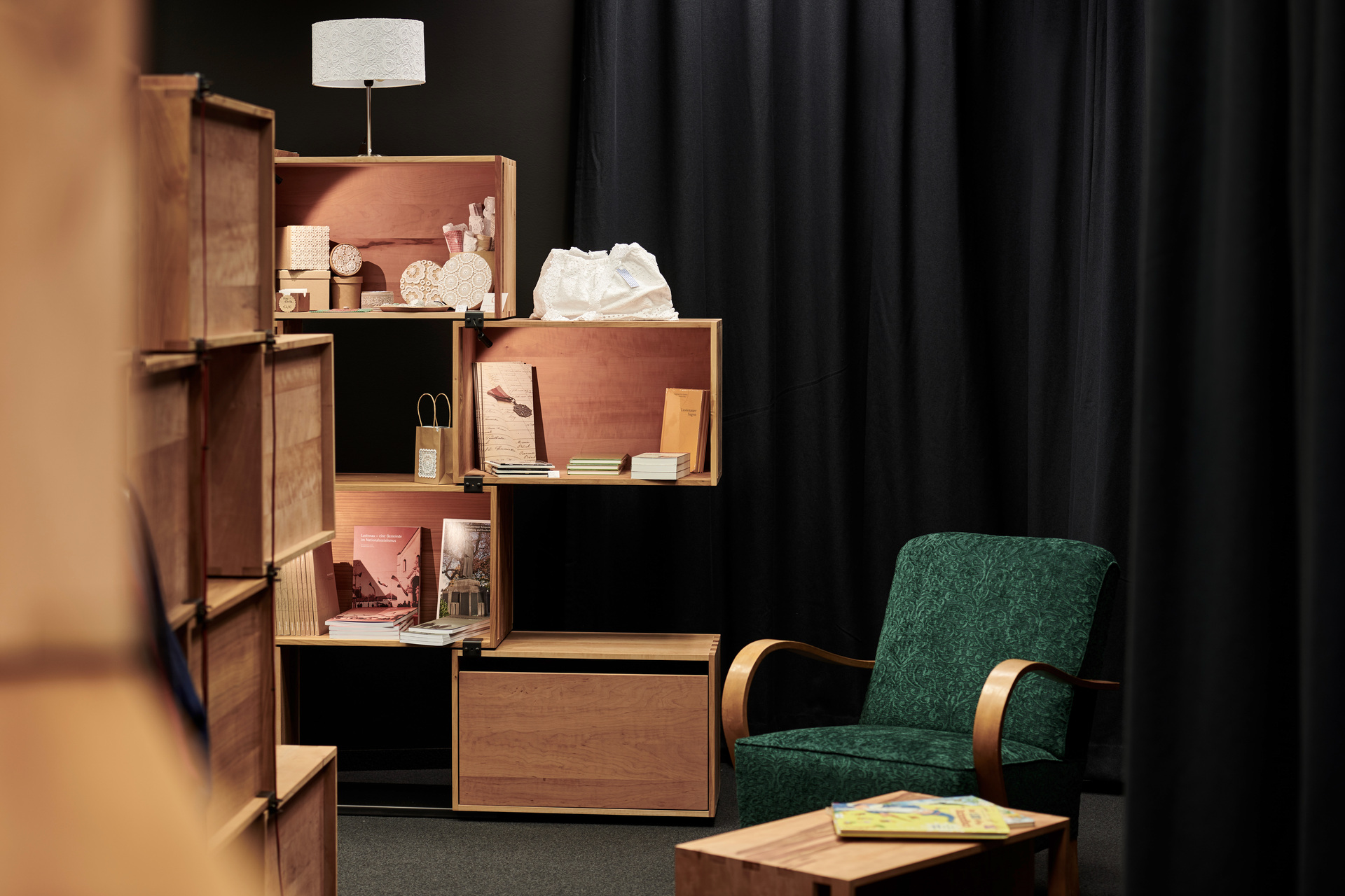 Im BOTTA Shop kann sich jeder Betrieb um eine Monatsmiete von 60 Euro ein Stück Regalfach mieten. Ihre Zahl steht nicht fest. Die Architekten entwarfen ein flexibles, addierbares Regalsystem aus massiven Holzkisten. Stahlklemmen, an denen man auch LED-Scheinwerfer anbringen kann, schaffen eine stabile Verbindung. Die Kisten bilden die Basis des Regalsystems, das den Raum zoniert und gliedert. Die unterste Reihe dient als Stauram, jede Kiste kann auch Hocker werden. Ein Mustertisch – Leihgabe einer Stickerei - eignet sich für Workshops und als Präsentationsfläche, eine Kinderecke und eine Theke gibt es auch. Die einstige Bankomatnische wurde zur kleinen Galerie für Künstler und Künstlerinnen aus Lustenau, ihre Werke sind in der Auslage immer zu sehen. (Text: Isabella Marboe)