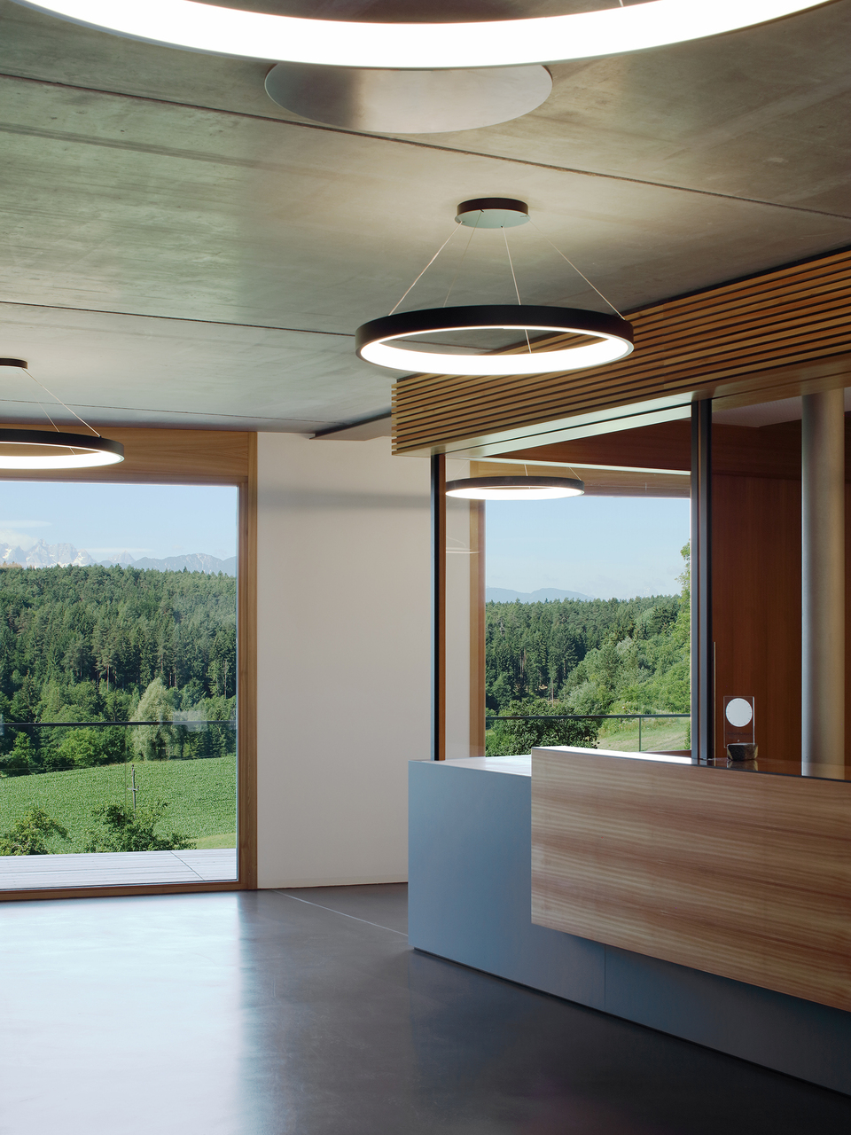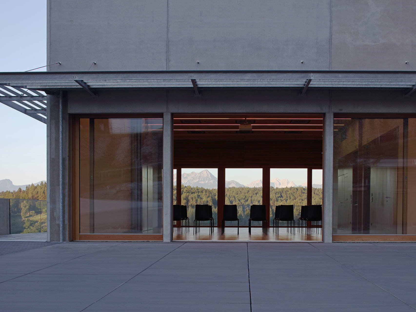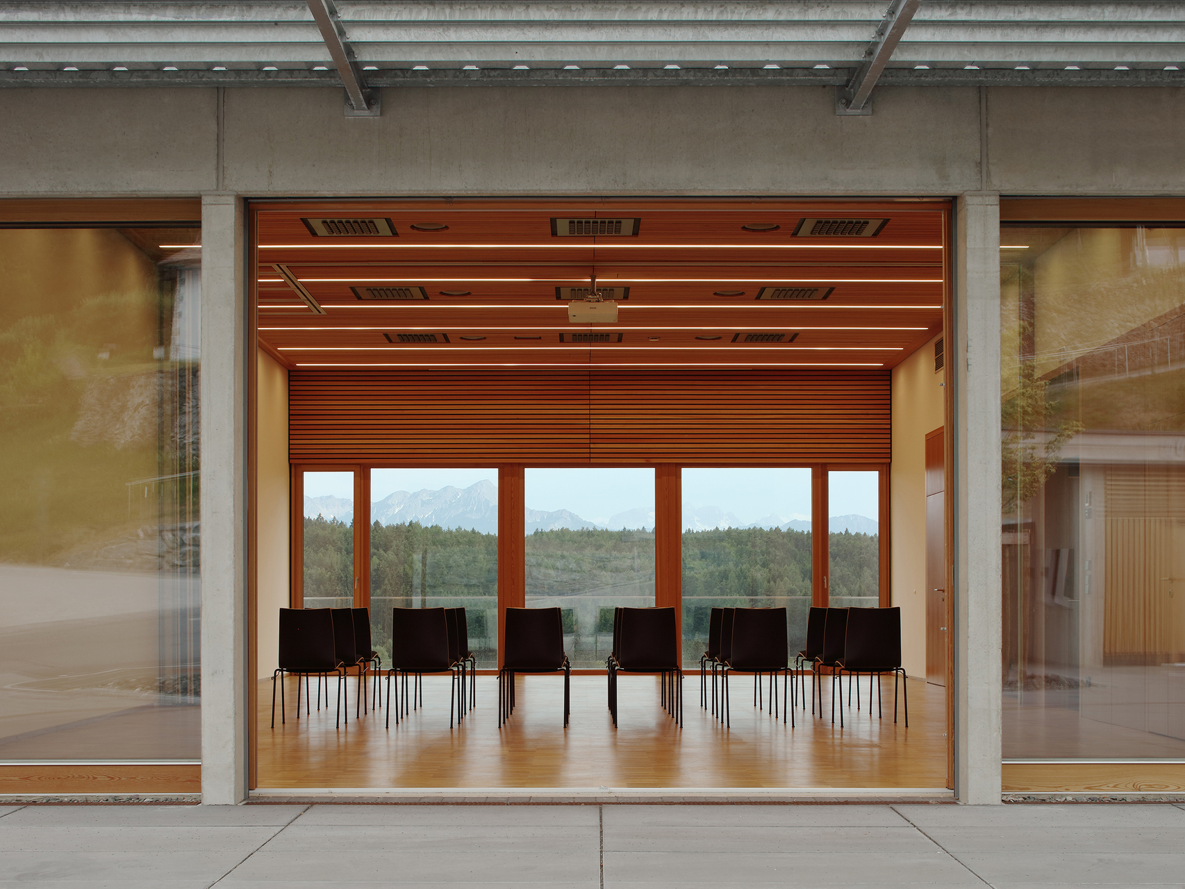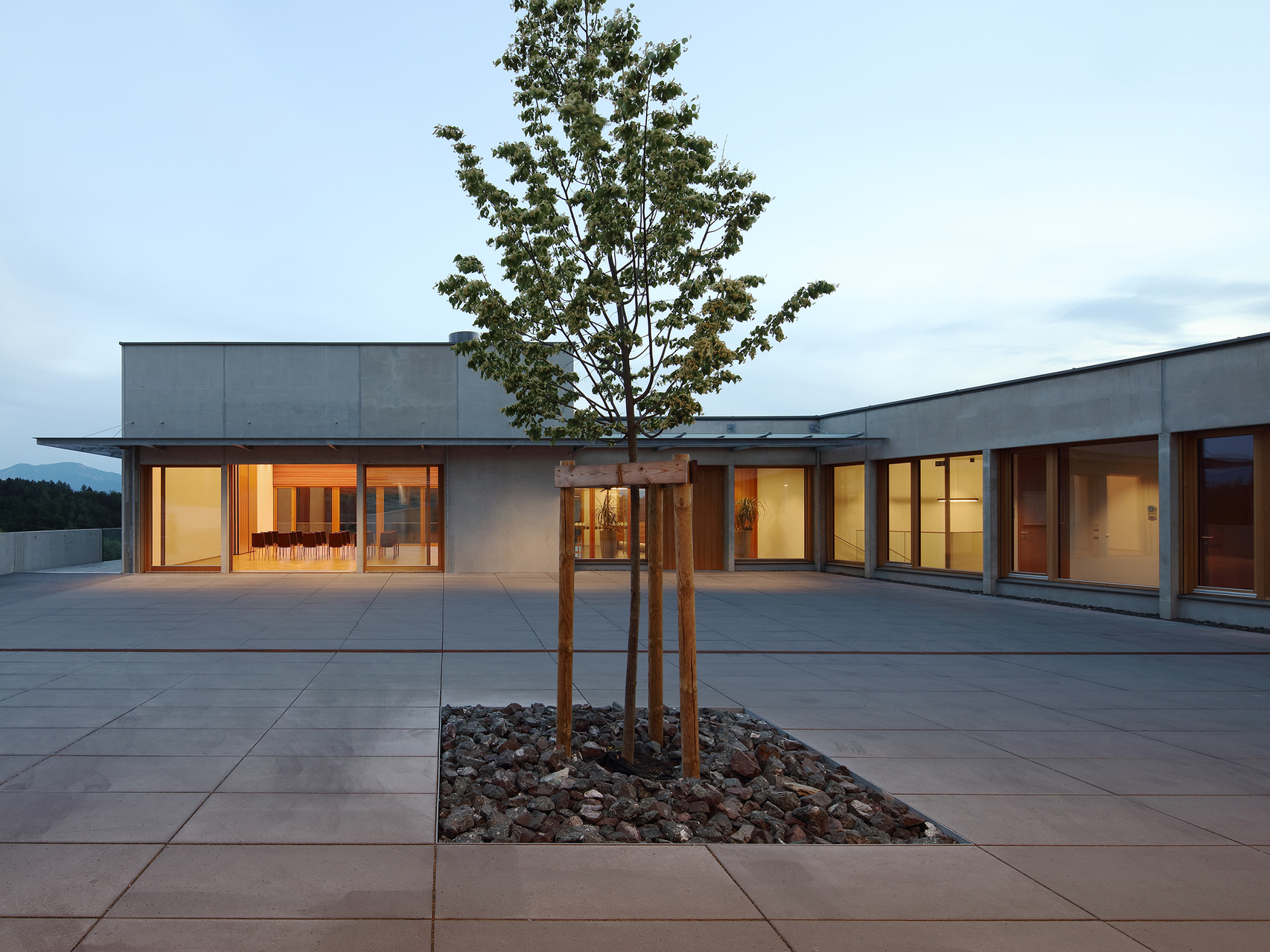 Der Gemeindesaal ist sichtbares „Landmark“, während die Verwaltungsbereiche mit ihrer extensiven Dachbegrünung in den Hintergrund treten. Der Saal wird durch ein Oberlicht optimal und geschickt mit Tageslicht versorgt. Die Bereiche Bürgermeister, Amtsleiter und Besprechung werden durch die Kombination Verglasungen zum Platz und Oberlicht mit Tageslicht umspült. Für eine optimale Belüftung sorgen die öffenbaren Oberlichter. Durch den sensiblen Umgang mit der bestehenden Topographie werden aufwändige Stützwände und Aufschüttungen vermieden. Die Nutzflächen des Platzes und des Gebäudes sind flächenmäßig optimiert. Die Attraktivität der Nutzungen auf Platzebene führen zu einer hohen und somit in weiterer Folge wirtschaftlichen Nutzerfrequenz. Materialien und Oberflächen sind auf eine lange Lebensdauer und wirtschaftlichen Betrieb ausgerichtet. (Text: Architekten)