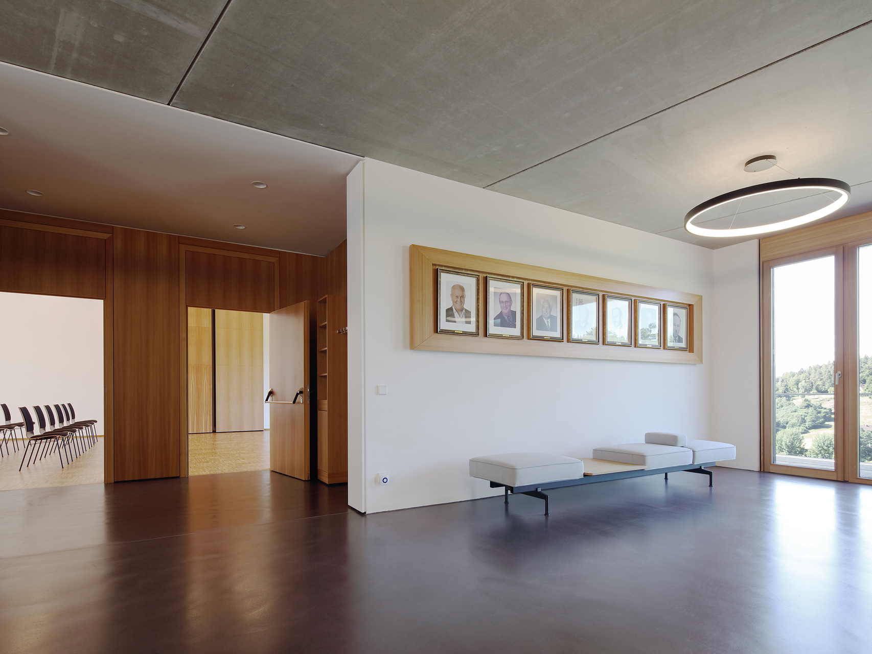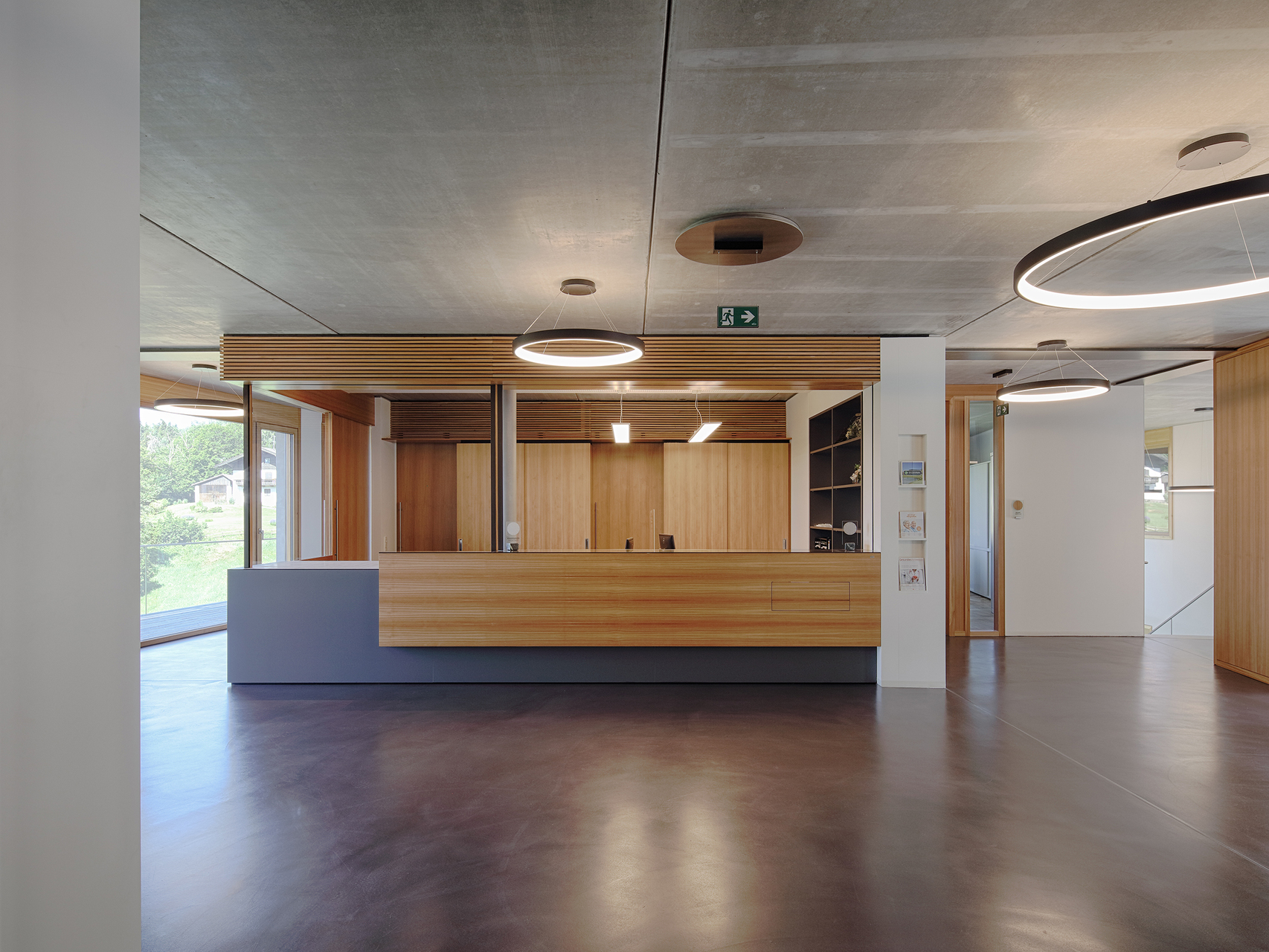 Die Bereiche Bürgerservice, Buchhaltung und Bauamt stehen in Blickkontakt zueinander und können dadurch entsprechend gut bedient werden. Im etwas ruhigeren nordöstlichen Gebäudetrakt mit direktem Blickkontakt zum Dorfplatz befinden sich die Büros für Bürgermeister und Amtsleiter samt Besprechungsraum für interne Angelegenheiten. Ein barrierefreies WC steht auf Platzniveau zur Verfügung, die allgemeine Sanitäranlagen befinden sich im Untergeschoß. Hier sind auch die Bereiche Wassermeister, Technik und Archiv untergebracht.
