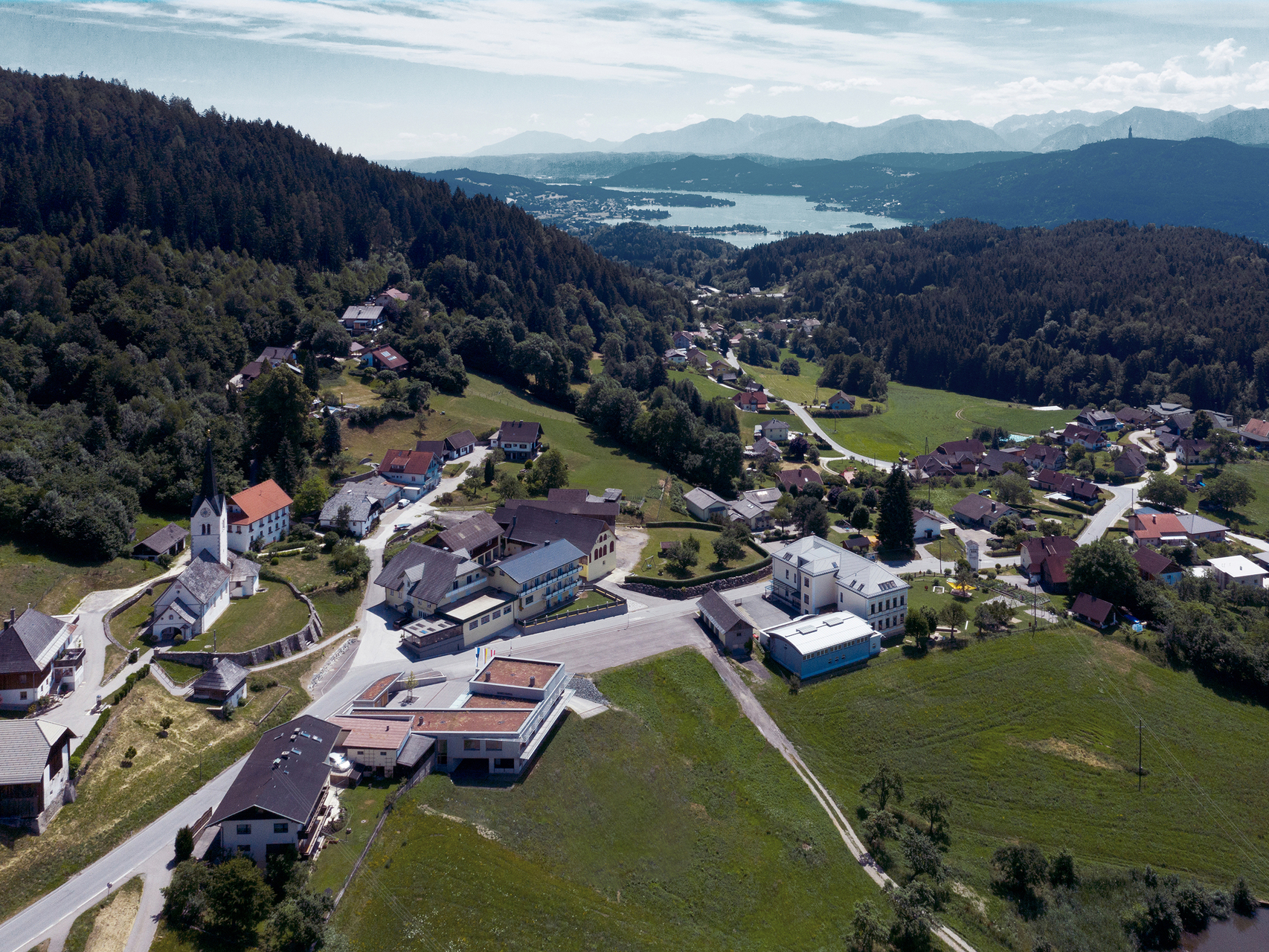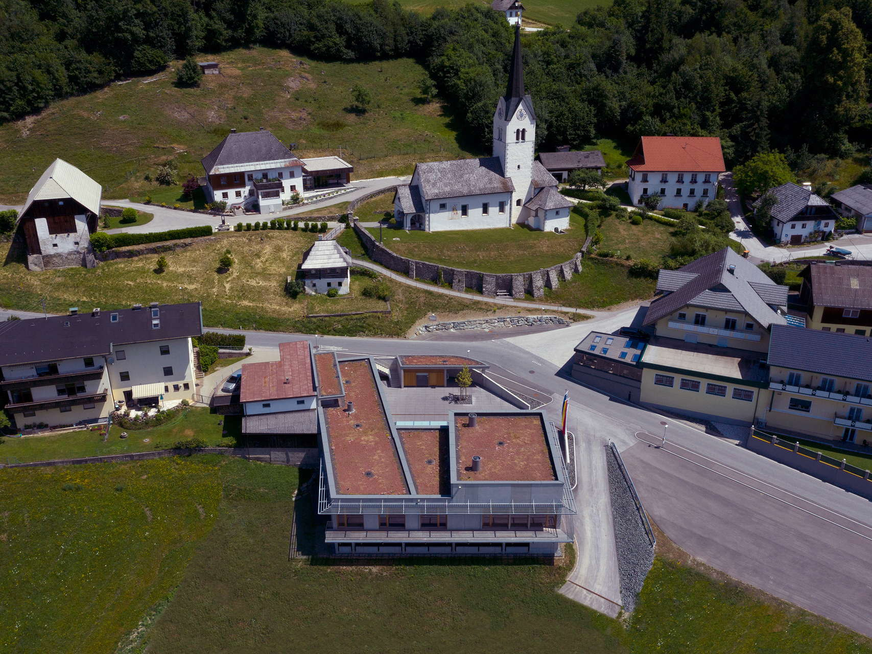 Zielsetzung des vorliegenden Entwurfes ist es, der Ortschaft St. Martin am Techelsberg eine „Mitte“ und damit der Gemeinde Techelsberg am Wörther See eine verortete Identität zu geben. Eine neue, in diesem Sinne „Mitte“ schaffende Baukörperkonfiguration ersetzt die Bestandsbauten. Der neue Baukörper fungiert raumbildend zum Ort, mit Blickbeziehungen zu Kirche, Pfarrhaus, Kaplanei und Gastwirtschaft.