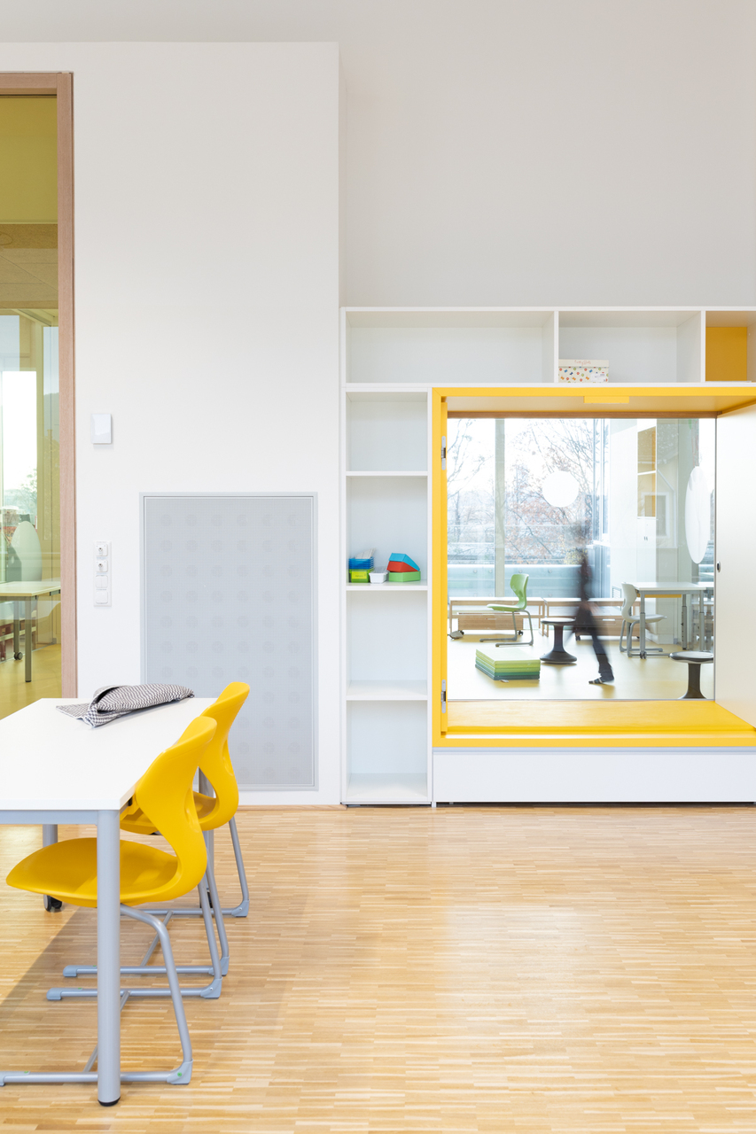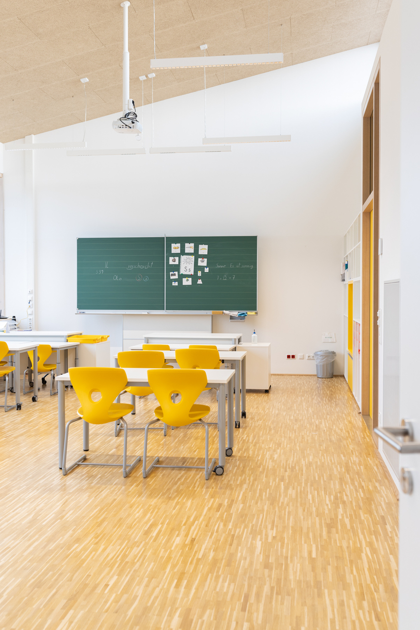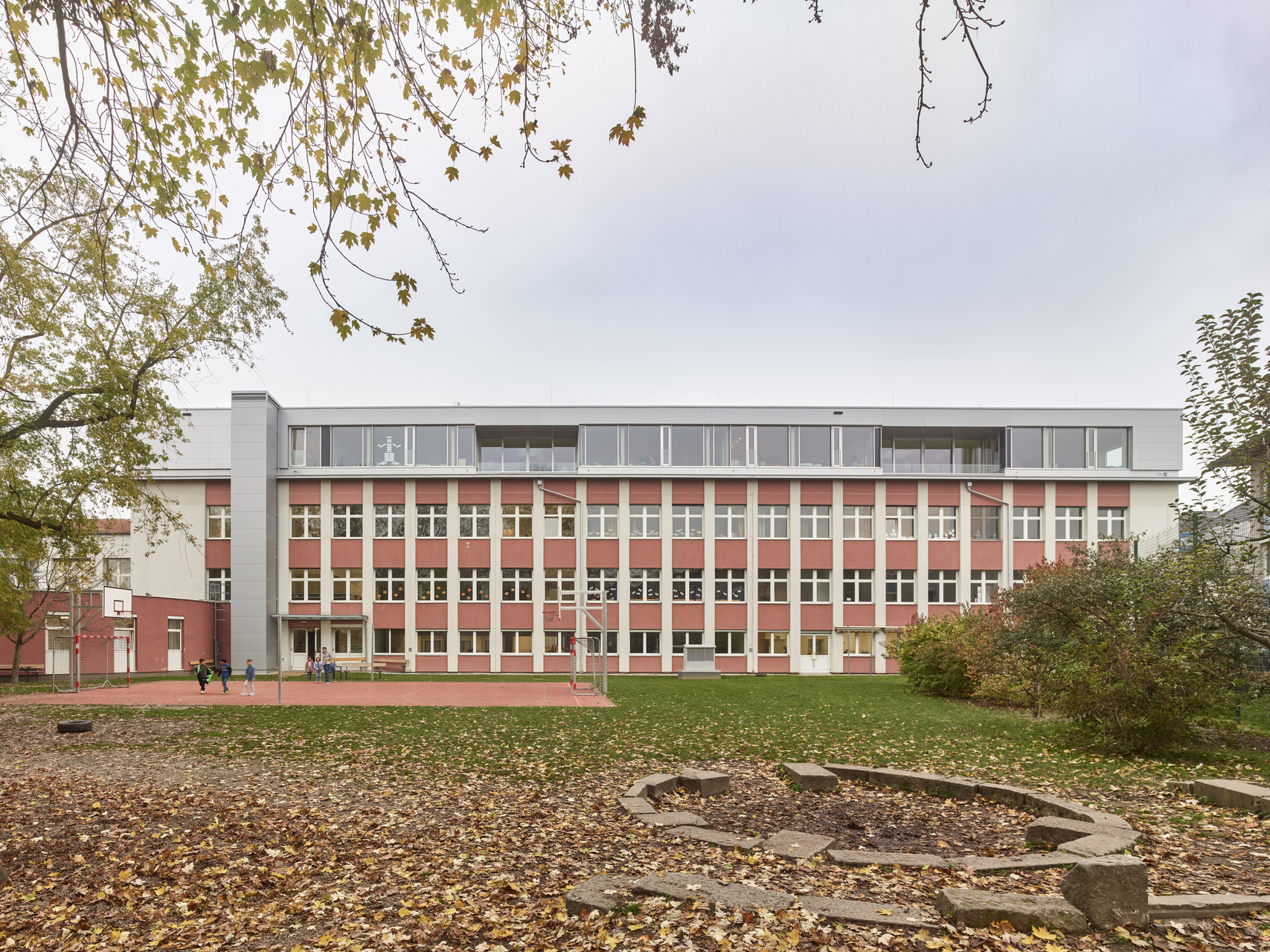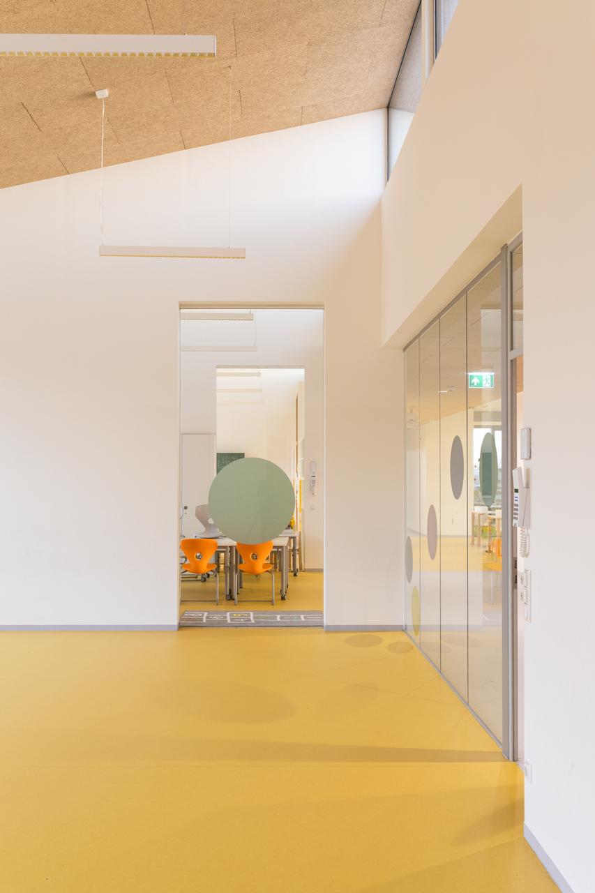 Durch Rückbau späterer Einbauten wurde das ursprüngliche Foyer der Schule wieder nutzbar gemacht. Die zwei Stiegenhäuser wurden im Duktus des Bestands nach oben fortgeführt. Ein hofseitiger Aufzug gewährleistet Barrierefreiheit. Im Bereich des Aufzugs findet sich in jedem Geschoss eine Erschließungzone mit Garderoben und Sanitäranlagen. Die Unterrichtsräume wurden clusterartig angeordnet, Bewegungsraum und Differenzierungszonen sind im Sinne zeitgemäßer Pädagogik flexibel gestaltet. Warme Farben, Holz und offene, lichtdurchflutete Räume sorgen für angenehme, freundliche Atmosphäre.