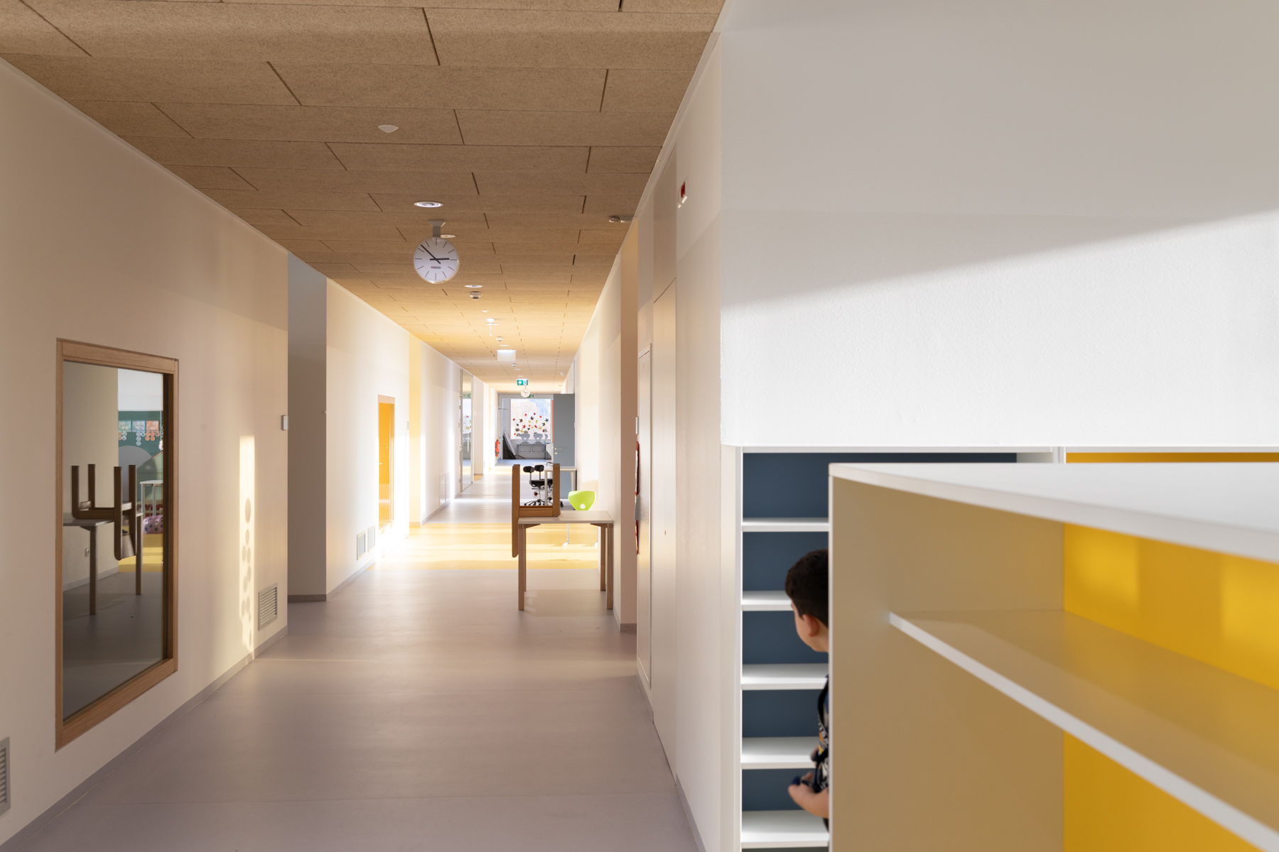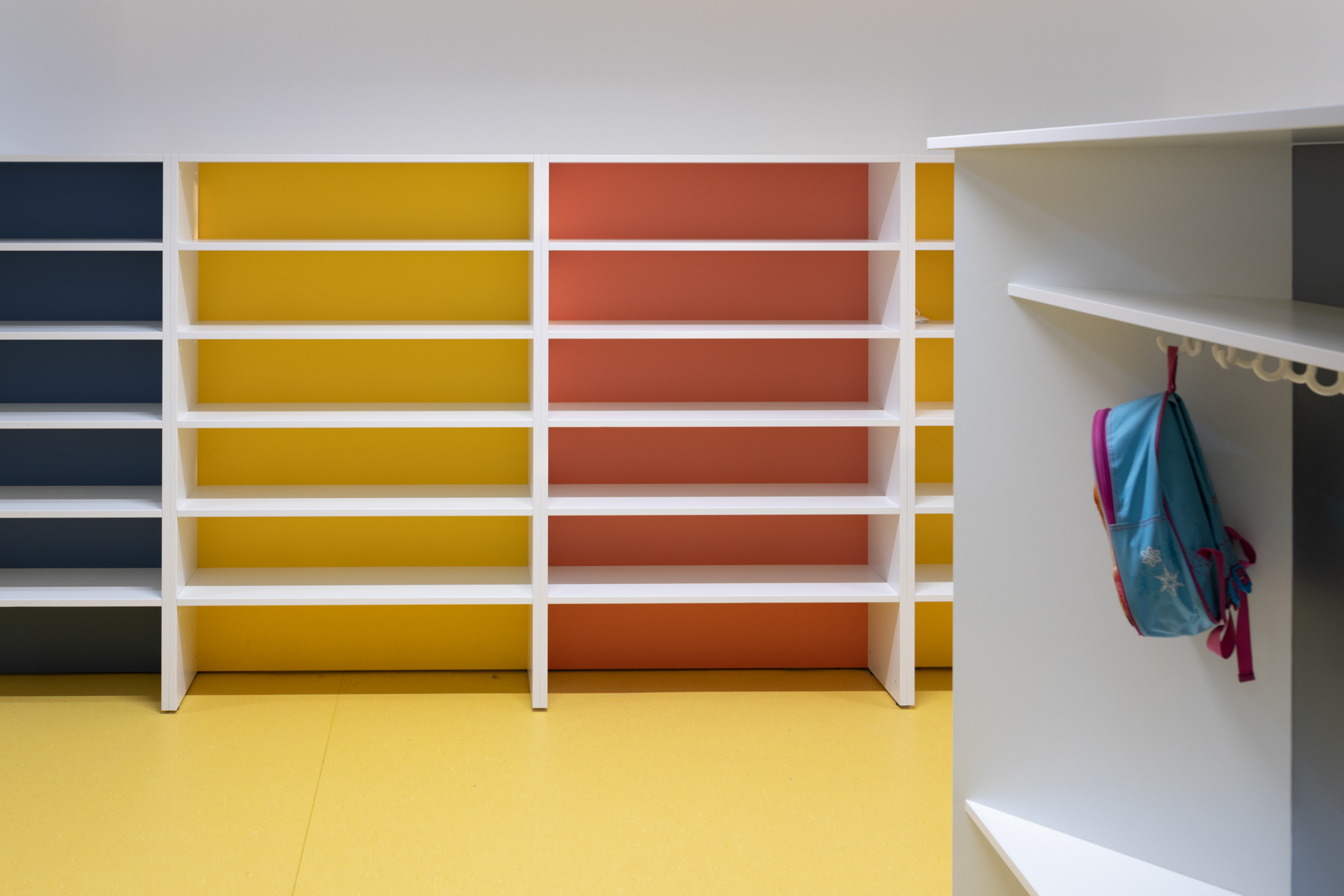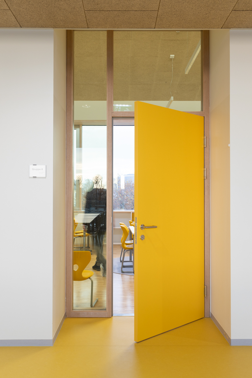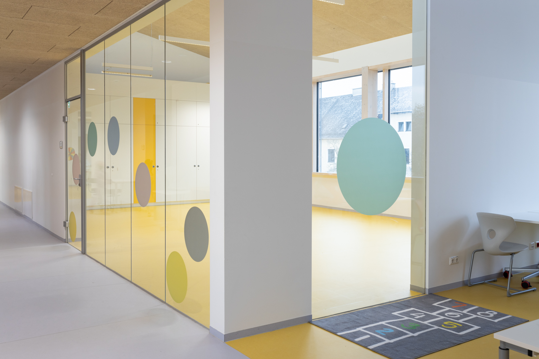 Durch Rückbau späterer Einbauten wurde das ursprüngliche Foyer der Schule wieder nutzbar gemacht. Die zwei Stiegenhäuser wurden im Duktus des Bestands nach oben fortgeführt. Ein hofseitiger Aufzug gewährleistet Barrierefreiheit. Im Bereich des Aufzugs findet sich in jedem Geschoss eine Erschließungzone mit Garderoben und Sanitäranlagen. Die Unterrichtsräume wurden clusterartig angeordnet, Bewegungsraum und Differenzierungszonen sind im Sinne zeitgemäßer Pädagogik flexibel gestaltet. Warme Farben, Holz und offene, lichtdurchflutete Räume sorgen für angenehme, freundliche Atmosphäre.