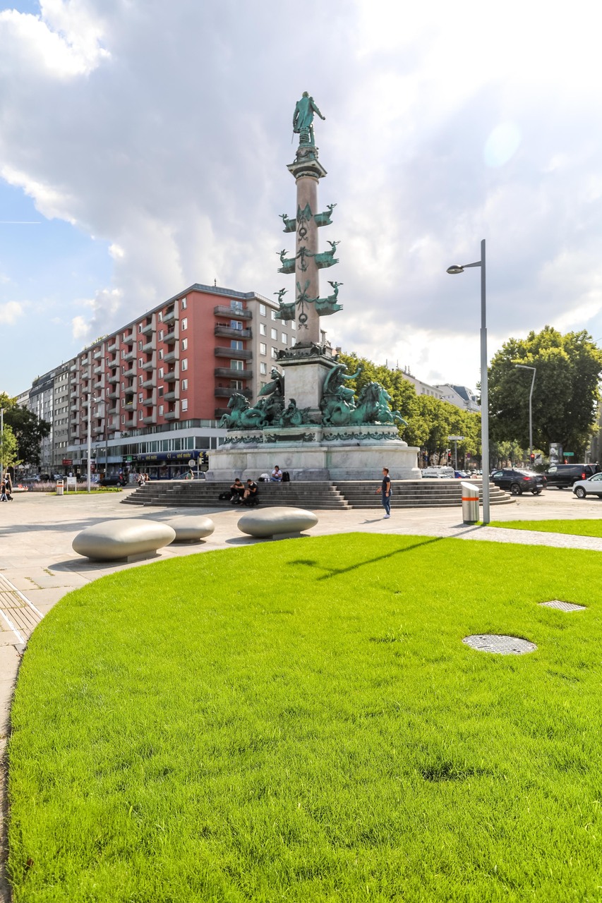 »Wir haben den Platz zum Teil großflächig entsiegelt, neue Rasenflächen geschaffen und das bestehende Material wie etwa Betonplatten und Granitpflaster behutsam entfernt und im Sinne der Kreislaufwirtschaft an anderer Stelle wieder eingebaut«, sagt Sabine Dessovic, Partnerin bei DD Landschaftsplanung. Anstelle von Podreccas Einfassung, der für die Umgestaltung des Pratersterns übrigens keinerlei Verständnis hat und die Begrünungsmaßnahmen als »städtebauliche Gaudi«, »grünen Populismus« und »pseudo-ökologisches Krebsgeschwür« bezeichnet, wurde ein 1,4 m hoher Begrünungsring geschaffen, der v. a. als emotionaler, atmosphärischer Sichtschutz dient.