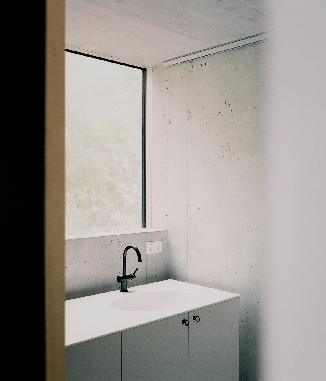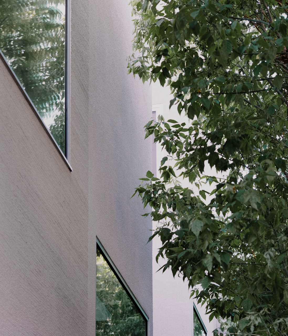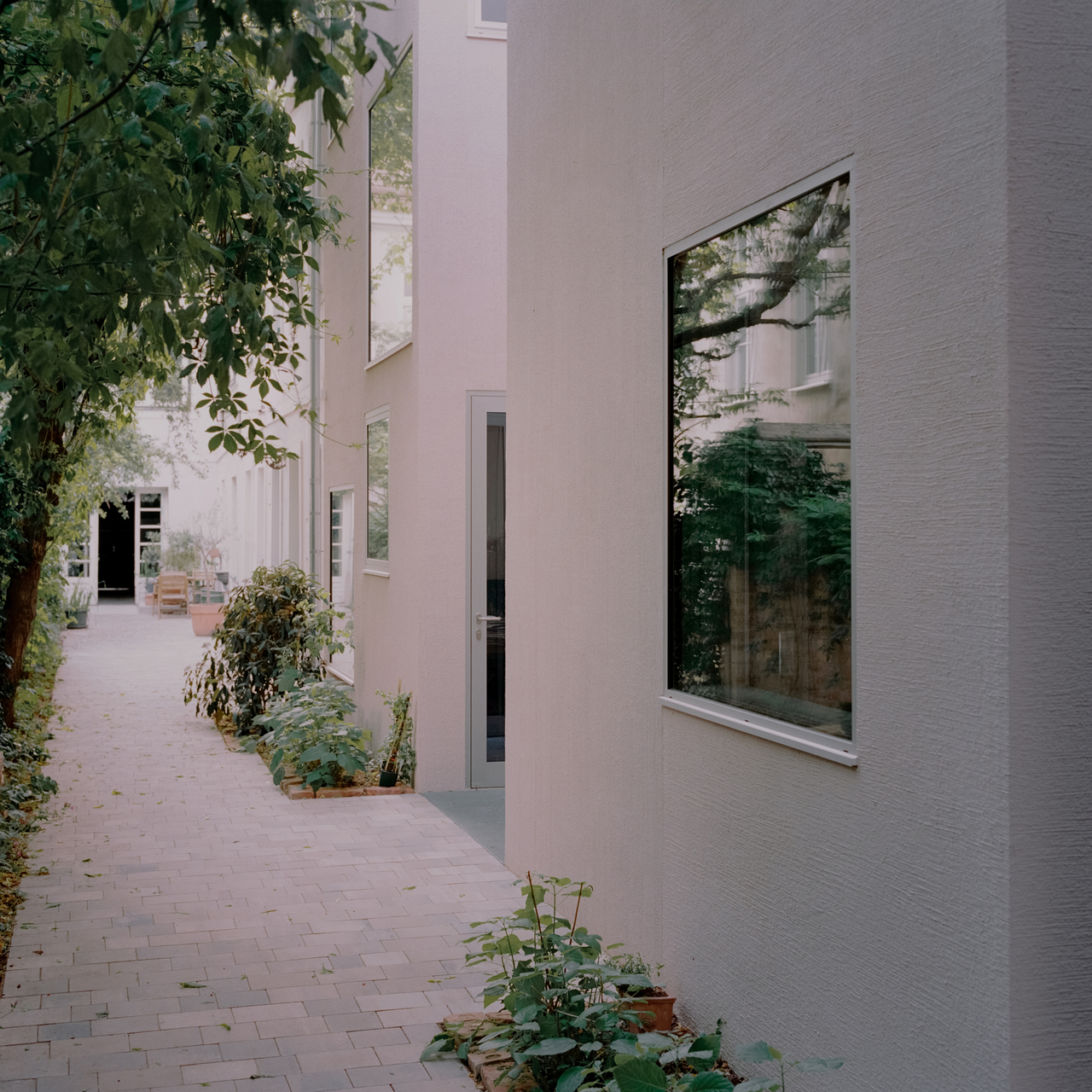 4,6 Meter schmal und 24 Meter lang, nimmt der Neubau die Gebäudeflucht des bestehenden Hoftraktes und des abgetragenen Lagers auf und fiel zwar etwas kürzer, dafür höher aus als der Bestand. Die Architekten unterteilten den Grundriss in einen Raster von 20 quadratischen Feldern, aus denen sie die dreidimensionale Struktur mit Vor- und Rücksprüngen, unterschiedlich hohen Räumen im Inneren und Terrassen auf allen Niveaus erzeugten. Das ist mehr als eine nette Spielerei, weil so in einer beengten Situation ein Maximum an Licht, Luft, Aus- und Durchblicken sowie Freiraum gewonnen wurde. Innen hat das dreigeschoßige Haus 16 verschiedene Raumlichten, außen zwölf Gebäudehöhen. Der Raster bildet sich auch an der Fassade ab: am Rhythmus der Fenster, die an der Front fixverglast und außen bündig eingesetzt wurden, damit innen mehr Raum bleibt – bei dieser geringen Trakttiefe zählt jeder Zentimeter. Öffenbare Fenster in den Seiten der Einschnitte ermöglichen das Querlüften. Dezent zeichnet sich das zugrunde liegende Quadratformat ebenso am abwechselnd horizontal und vertikal in Besenstrichtechnik strukturierten Putz ab, der in zartem Rosa die Farbe des Bestands aufnimmt. Im Hof blieben alle Bestandsbäume sowie die Kletterpflanzen zur Nachbarliegenschaft erhalten.