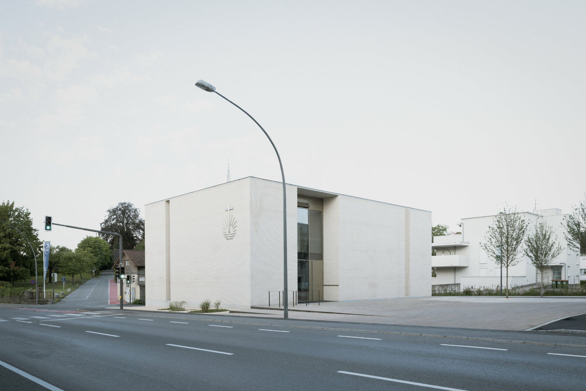 Je achtsamer der Umgang mit der Kirche, umso schöner altert sie. Der Grundriss ist wie ein Kreuz. Ein zurückgesetzter, haushoher Glasschlitz bildet den witterungsgeschützten Eingang, das anschließende Foyer reicht über die gesamte Gebäudebreite, auch die gegenüberliegende Seite ist raumhoch verglast. So wird es zum hellen, luftigen Volumen. Auch im Norden und Süden sind dort, wo der Kirchensaal endet, sehr schmale, raumhohe Fensterschlitze in das Gebäude gekerbt. Sie bilden die außenbezogenen Endpunkte des Kreuzes aus Foyer und Gang, während der Kirchensaal sehr introvertiert ist.