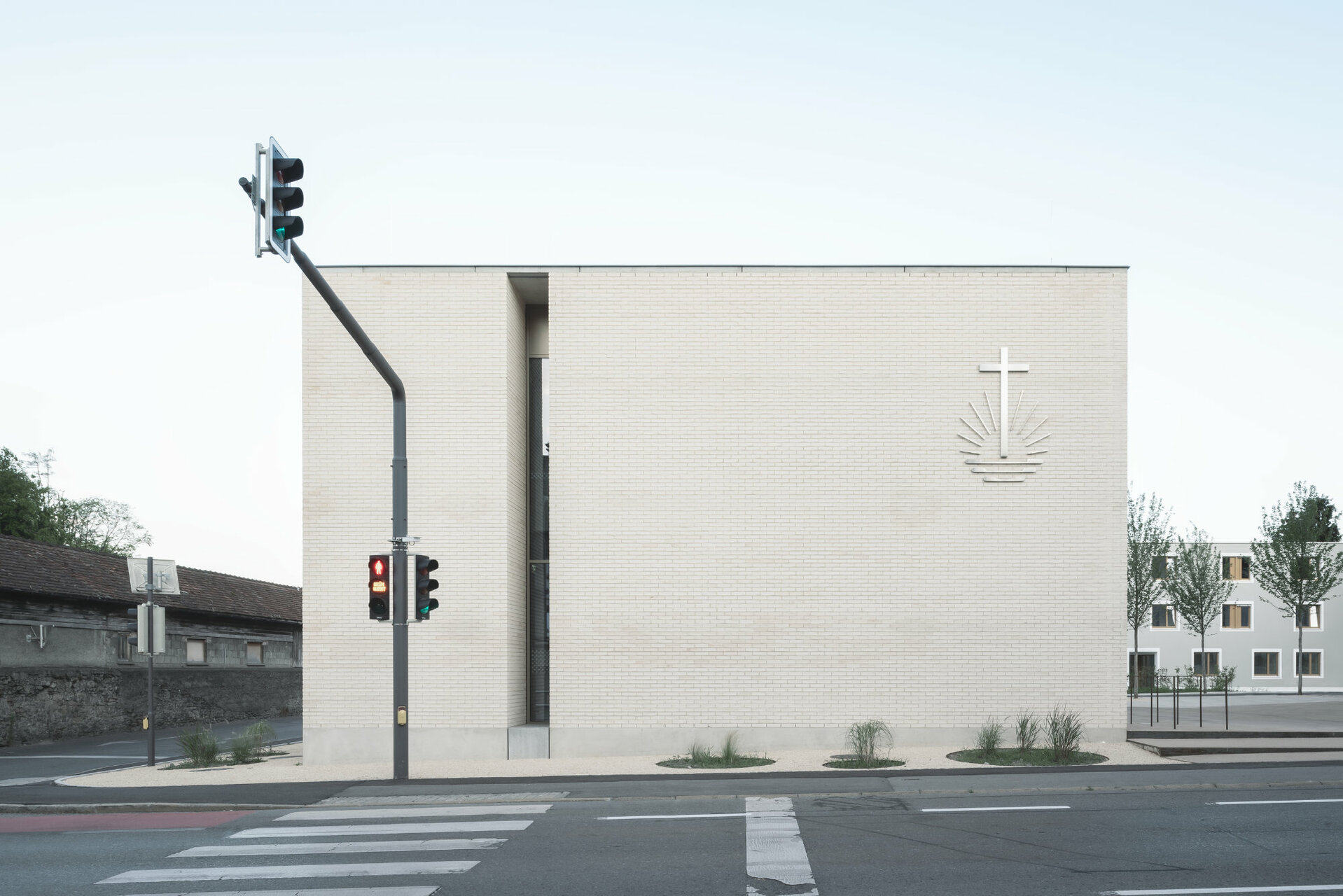 Die Kirche ist ein schlichter Quader – 7,5 Meter hoch, 20 Meter lang, 14 Meter breit. Weder Fenster, noch Turm, einzig ein haushoher Schlitz pro Seite. Der Baukörper wirkt rätselhaft abstrakt, reagiert in Position und Volumen aber passgenau auf die städtebauliche Situation. Seine Längsseite wendet er der Niedeggegasse, die schmale der Arlbergstraße zu. Dadurch entsteht zwischen der Kirche und dem angrenzenden Wohnbau ein großer, freier Platz. Er ist mit vier Bäumen, ockerfarbenen Betonsteinen und rotbraun gefärbtem Asphalt unaufdringlich vornehm gestaltet und verweist so auf die Bedeutung des Sakralbaus.