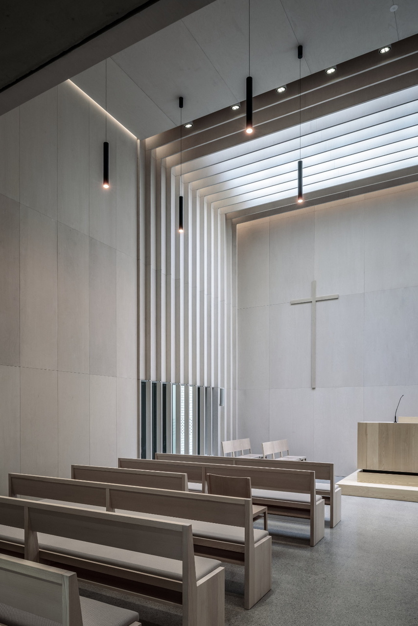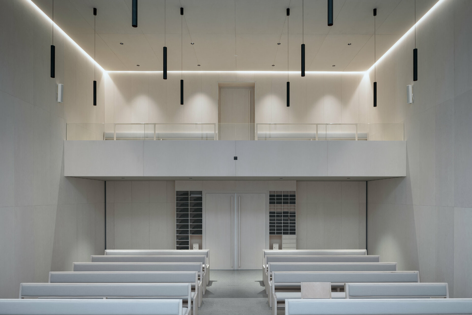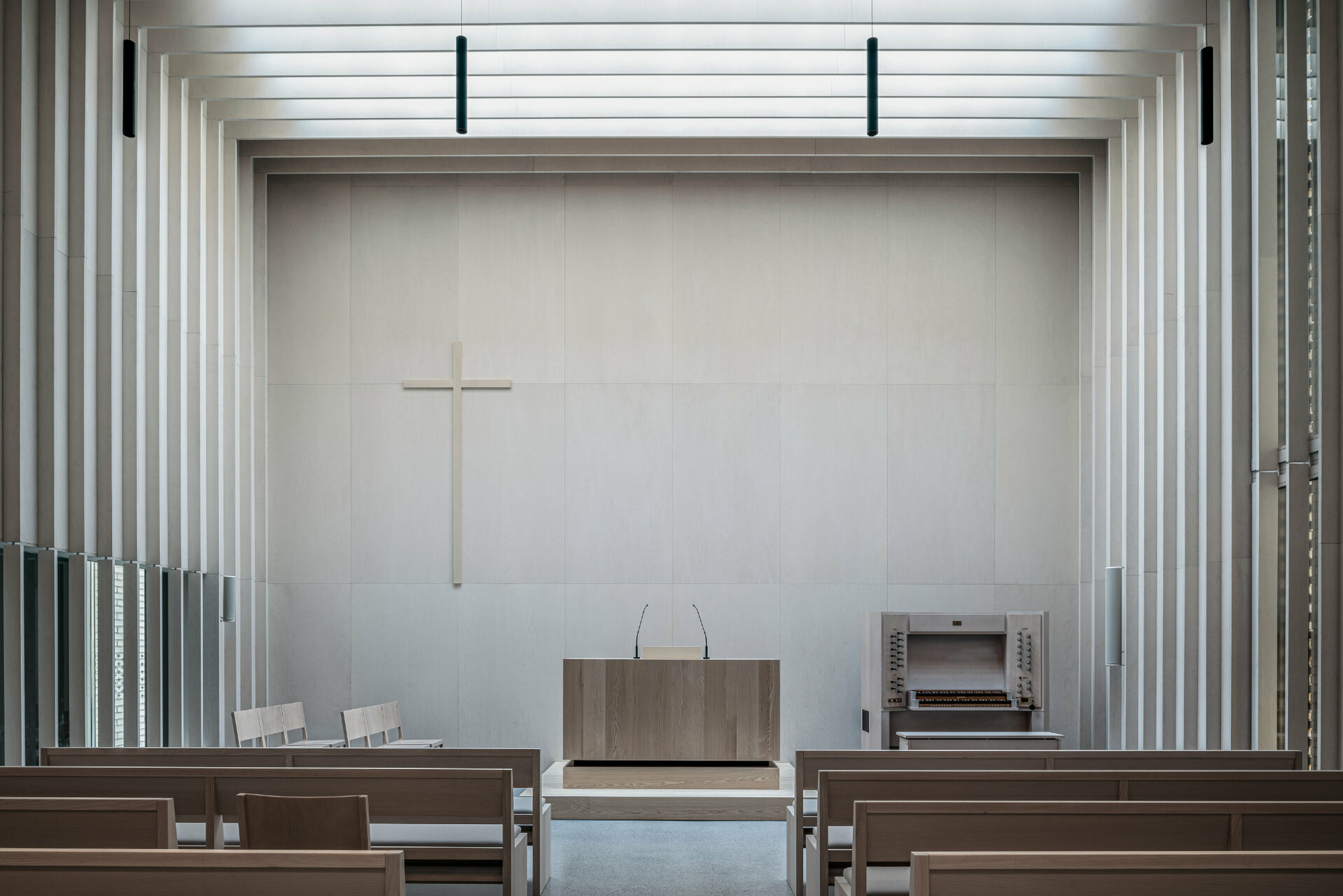Weißlasiertes Birkensperrholz schafft eine bergende, freudig-erhabene Atmosphäre, die Akustik ist hervorragend, Musik ist liturgisch bedeutsam, auch die Empore für den Chor ist aus Birkensperrholz. Nur eine Glasscheibe trennt den Mutter-Kind-Raum, der für neuapostolische Kirchen typisch ist, vom Altarbereich. Als immaterielle Manifestation Gottes ist natürliches Licht ein wesentliches Gestaltungselement. Es wird von drehbaren Holzlamellen und den kreuzförmigen Freiräumen der Ziegelfassade gefiltert, zwischen den Holzleimbindern der Decke fällt es durch ein Oberlicht ungefiltert auf den Altar, einem schlichten Kubus aus Eschenholz. In der Morgensonne scheint er golden. (Text: Isabella Marboe)