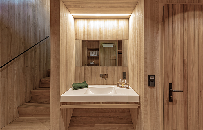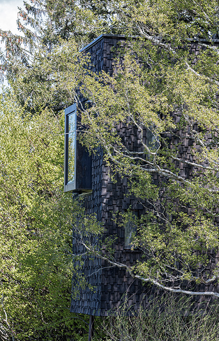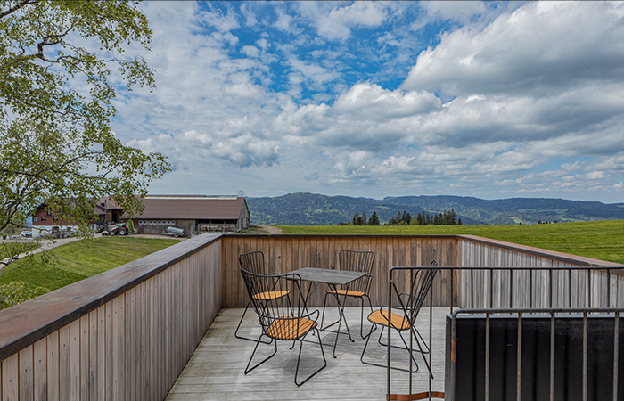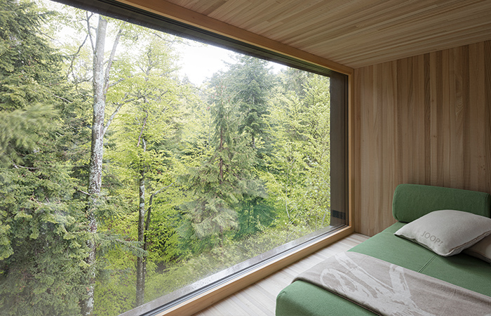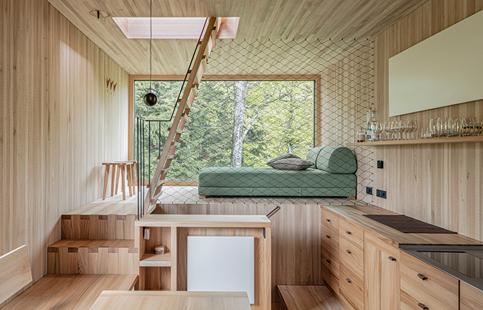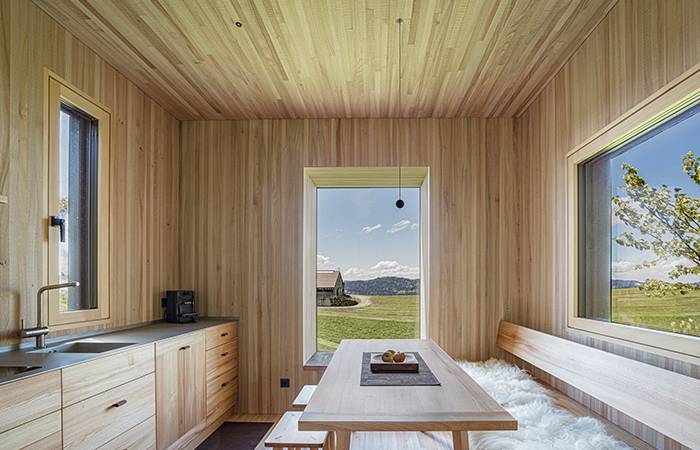 Eine Zugangsrampe mit Blick auf den Reitplatz führt auf das Eingangspodest, man betritt den Holzquader von unten über eine schmale, steile Treppe. Die innere Erschließung schlängelt sich auf kleinstem Raum zentral über die Wohnbereiche, die als Split-Levels organisiert sind. Sie öffnen sich gezielt zum Wald. Das Bad befindet sich auf der Eingangsebene, in der Erlebnisdusche vor Glas ist man der Natur ganz nah. Die „Schlafkoje“ auf der zweiten Ebene bietet einen gemütlichen Rückzugsort. Der Hauptraum mit Koch- und Essbereich liegen auf Ebene drei. Hier lenkt eine klar definierte Fensteröffnung den Blick in die offene Landschaft. Die anderen Fensteröffnungen sind so gewählt, dass Wald und Gebäudeinneres fast ineinander übergehen. Ebene drei und Ebene vier, die einen weiteren Schlafplatz bietet, schließen eine großen, offenen Raum ein. Eine steile Leiter führt vom Essbereich auf die Dachterrasse. Sie eröffnet ein 360 Grad Panorama auf die Hügellandschaft der Voralpen.
